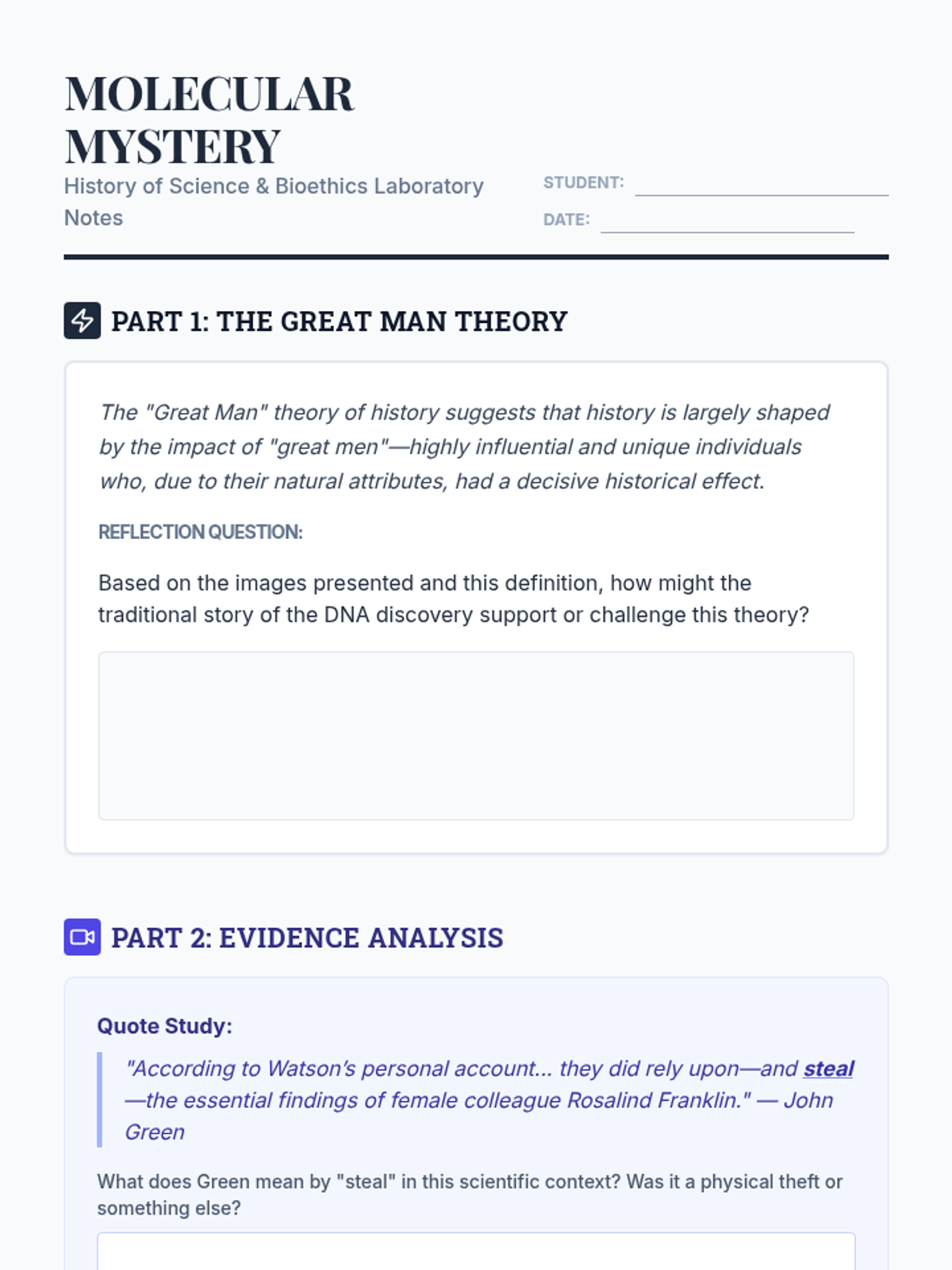 A high school interdisciplinary lesson combining Biology and History to explore the discovery of DNA, the role of Rosalind Franklin, and the ethics of scientific credit. Students participate in a mock trial to debate who truly deserved the Nobel Prize for the double helix structure.