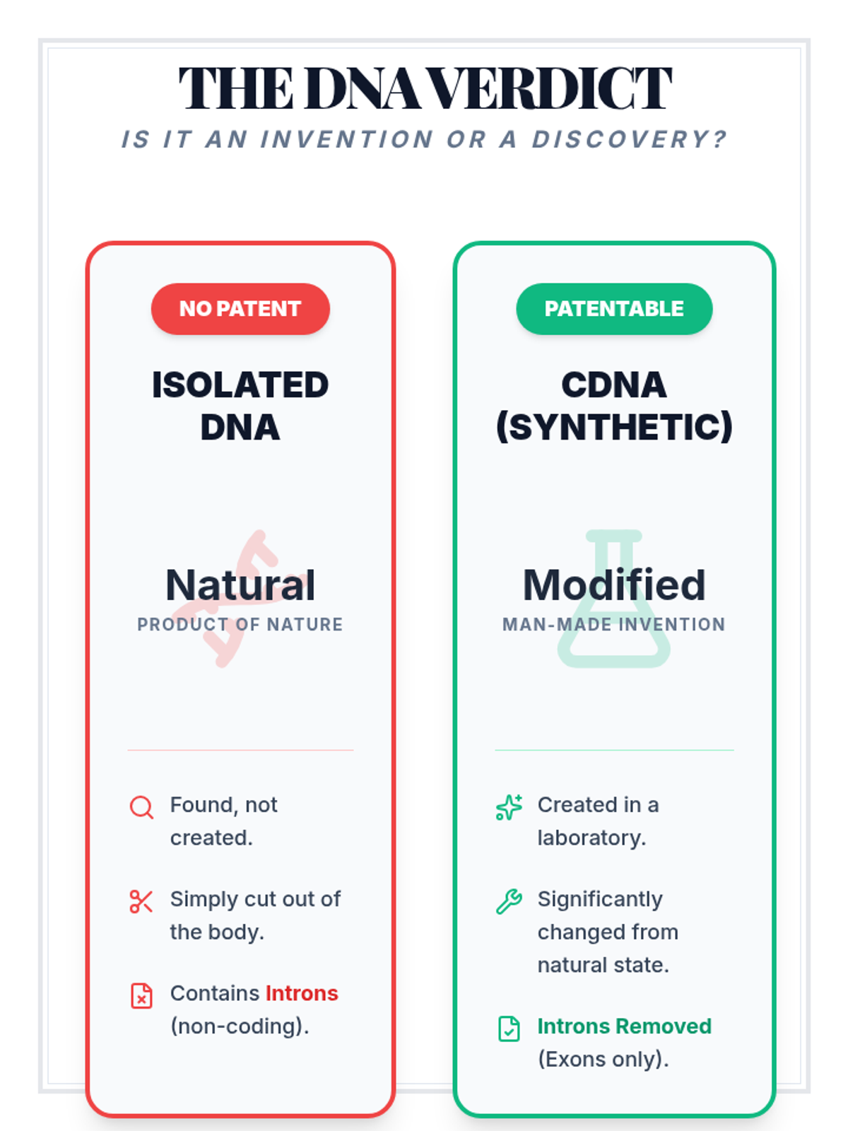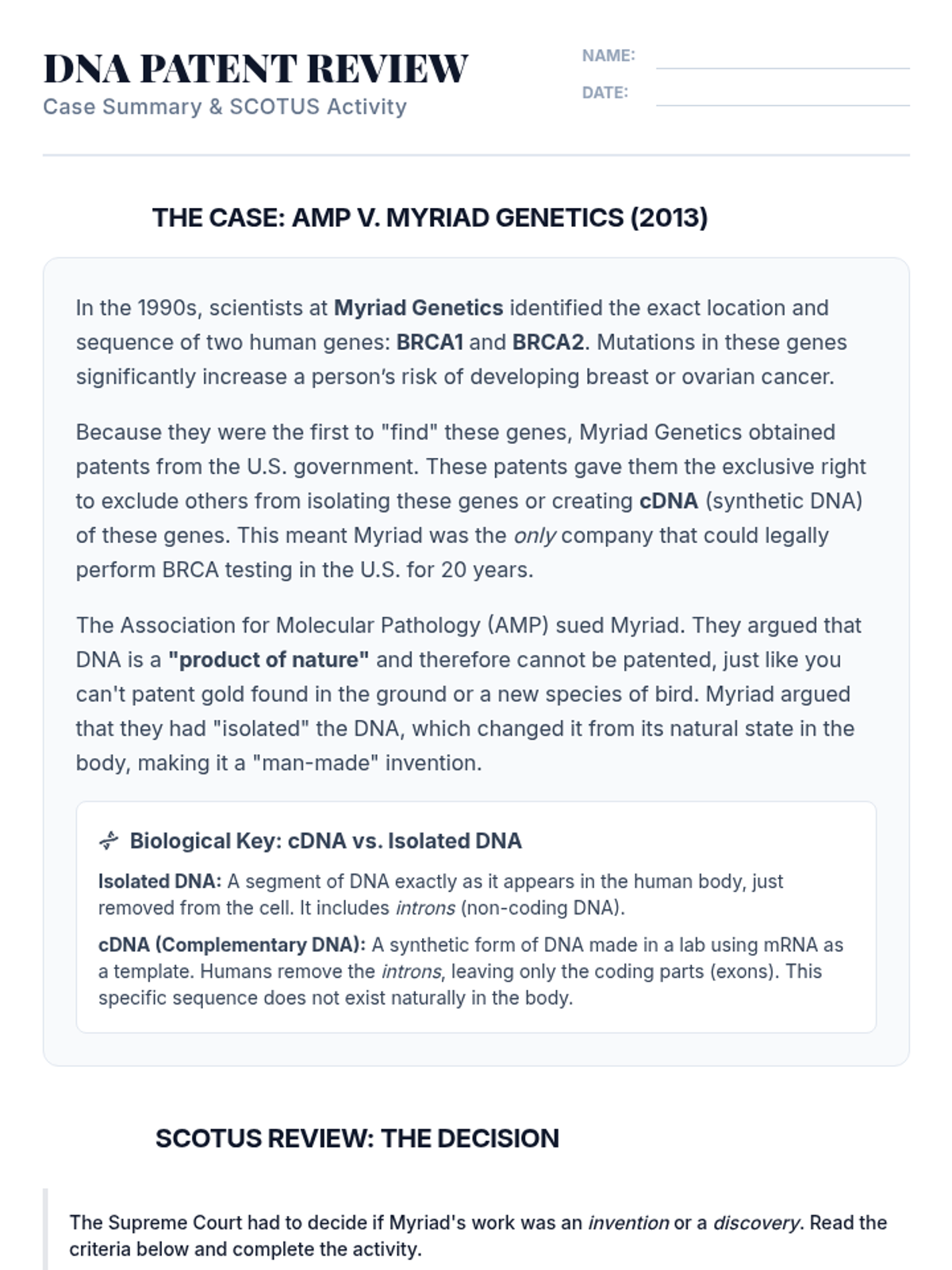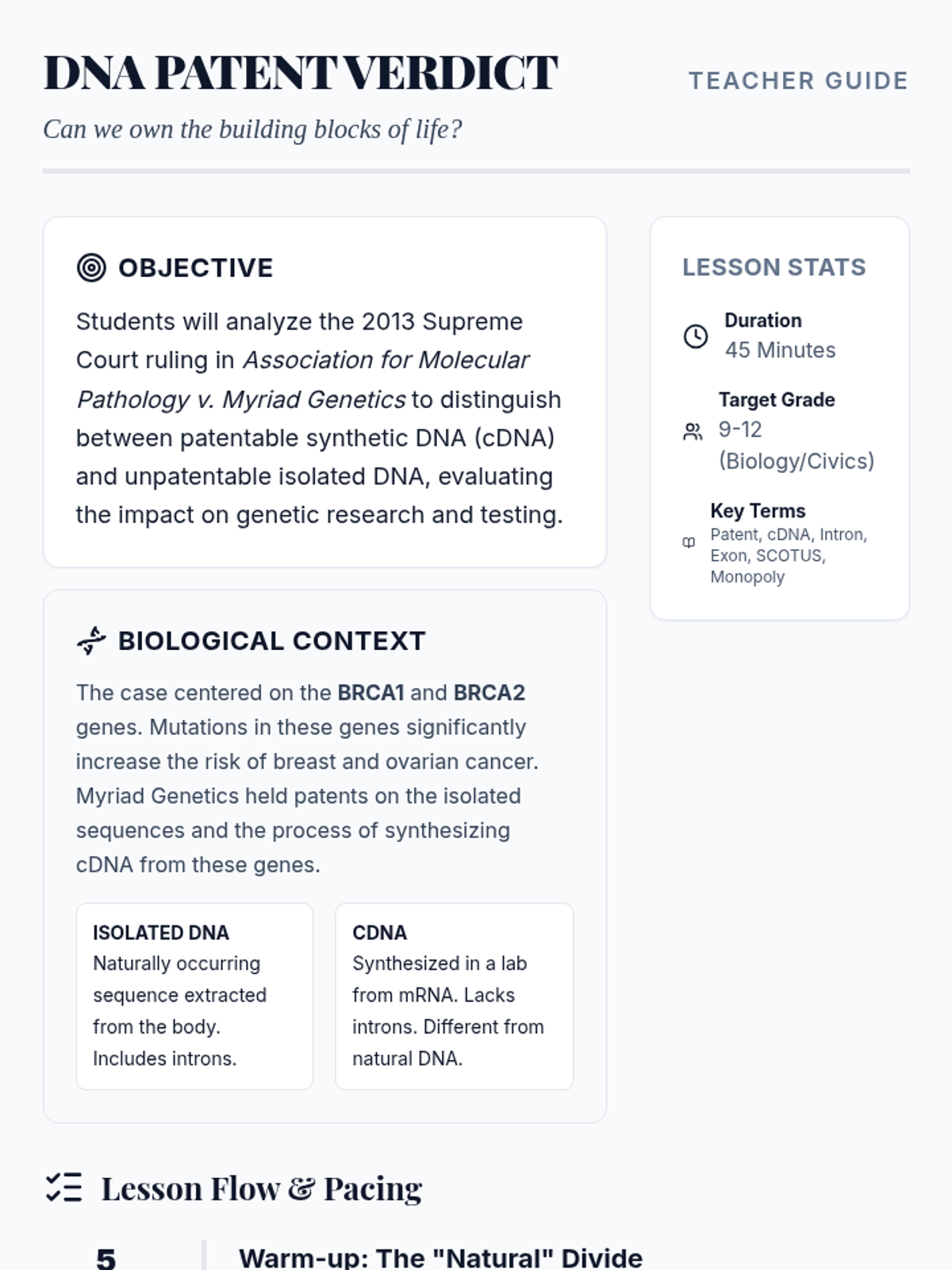 A high school biology lesson exploring the legal and ethical boundaries of genetic engineering through the landmark Supreme Court case Association for Molecular Pathology v. Myriad Genetics. Students analyze the distinction between products of nature and man-made inventions in the context of DNA patenting.