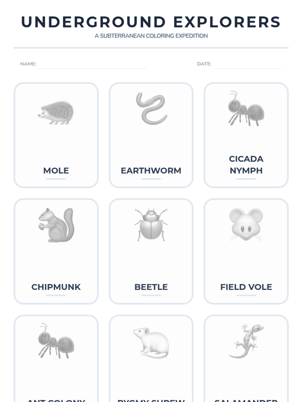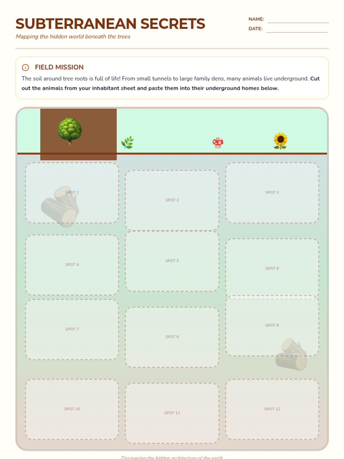 Students explore the ecosystem beneath the forest floor, focusing on animals that create tunnels and live among tree roots.