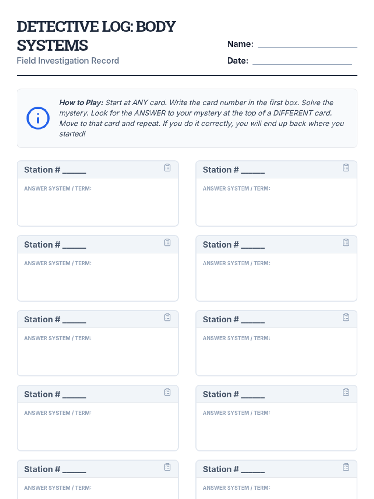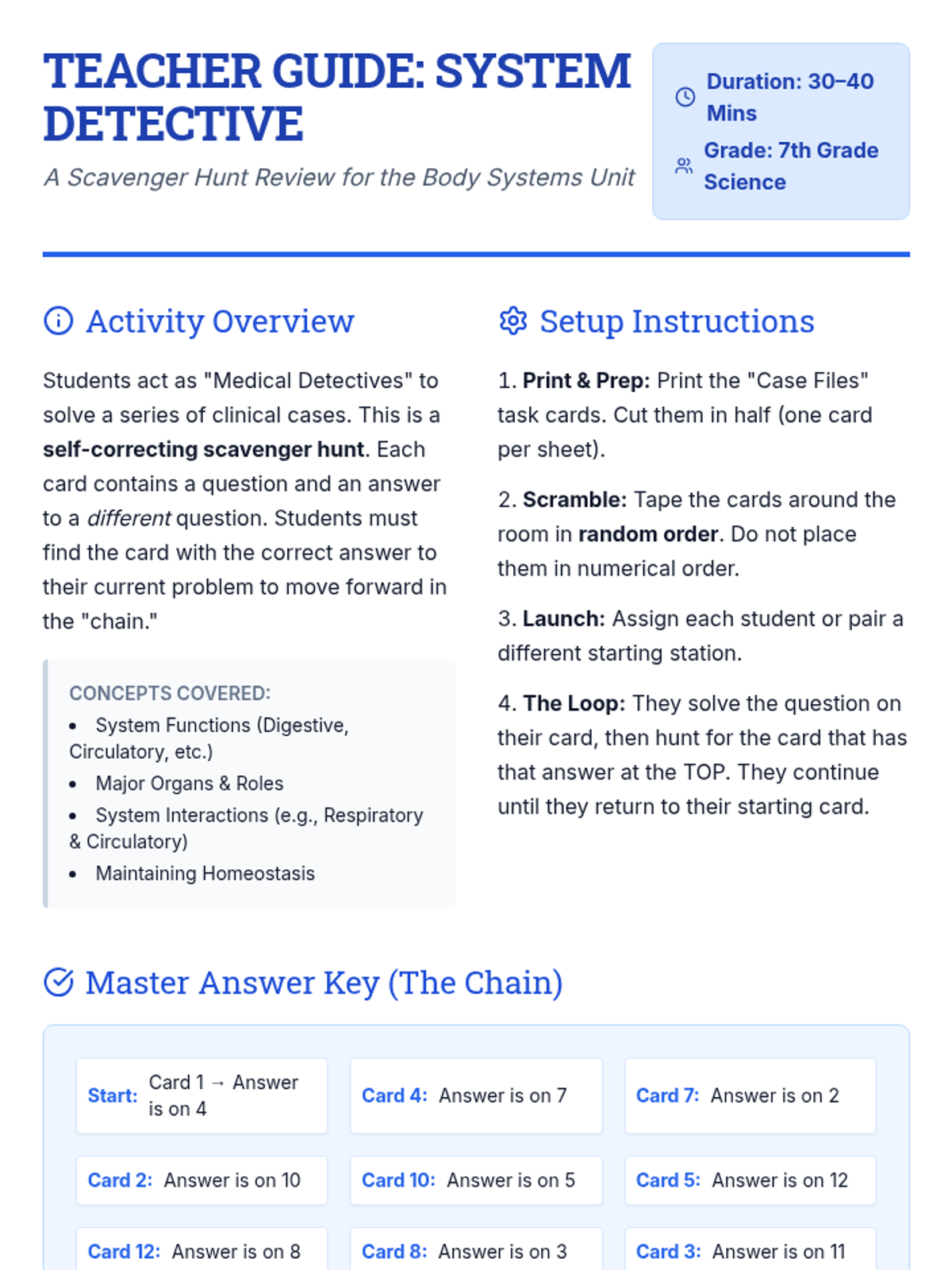 A high-energy, movement-based review activity where students solve 'medical cases' by identifying body systems and their functions. This lesson includes task cards for a classroom scavenger hunt and a structured recording sheet for students.