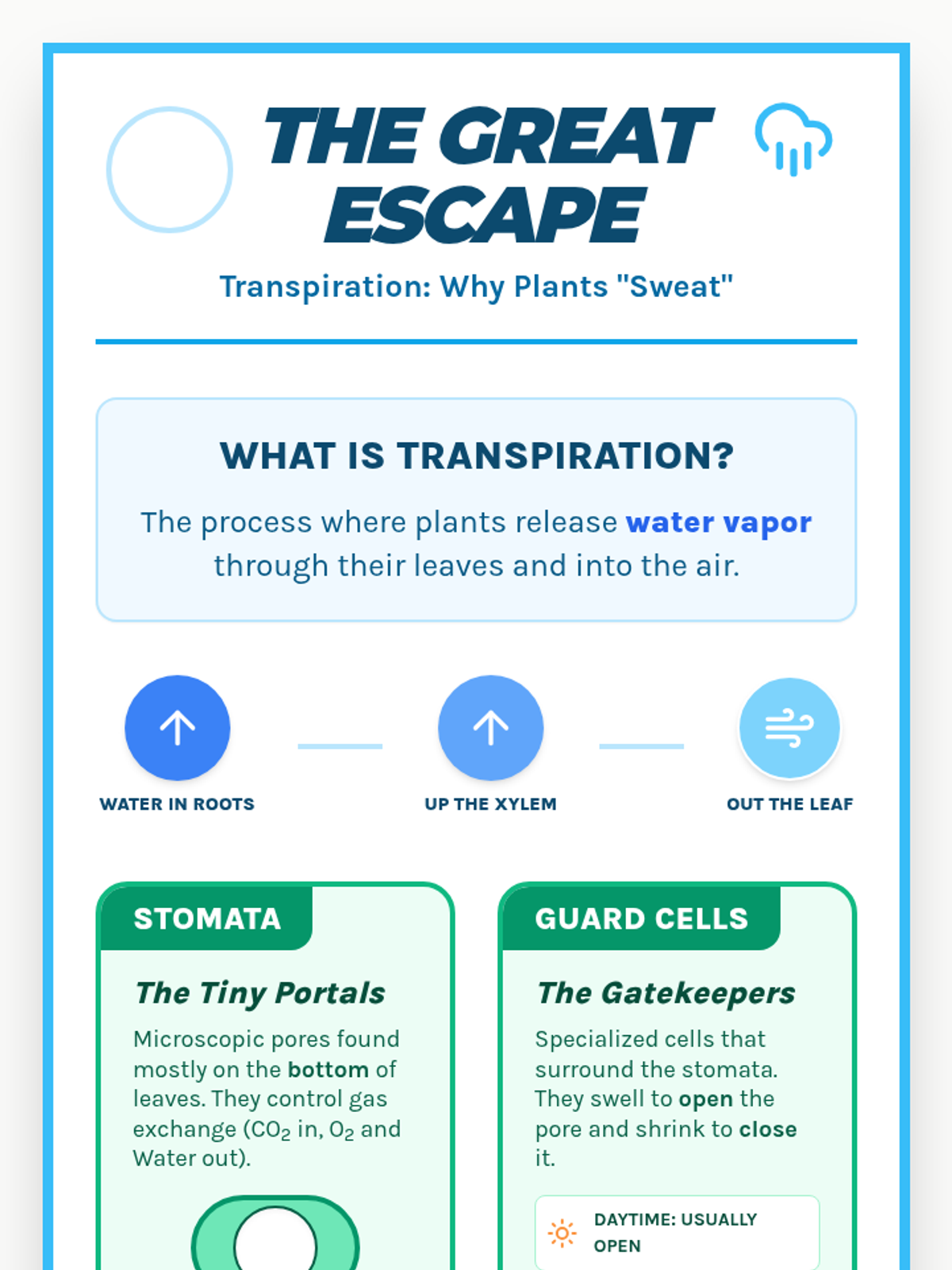 A series of visual anchor charts designed for reference during laboratory investigations into plant vascular systems, photosynthesis, and transpiration.