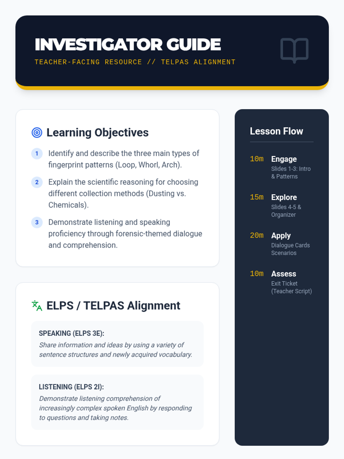 A forensic science lesson focused on fingerprinting collection and preservation, specifically designed to support 10th-grade English learners with TELPAS listening and speaking proficiency.