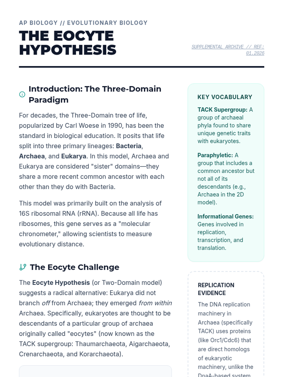 Explore the evolutionary link between Archaea and Eukarya through the lens of DNA replication machinery and the debate between the Three-Domain and Two-Domain (Eocyte) hypotheses.