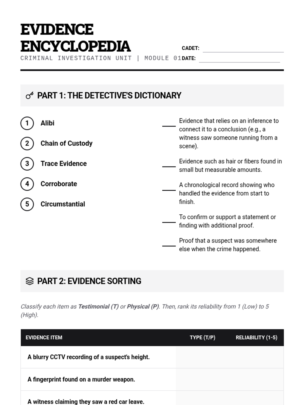 Students master the foundational vocabulary of forensic science, including terms like alibi, chain of custody, and trace evidence, while learning to categorize different types of physical and testimonial evidence.