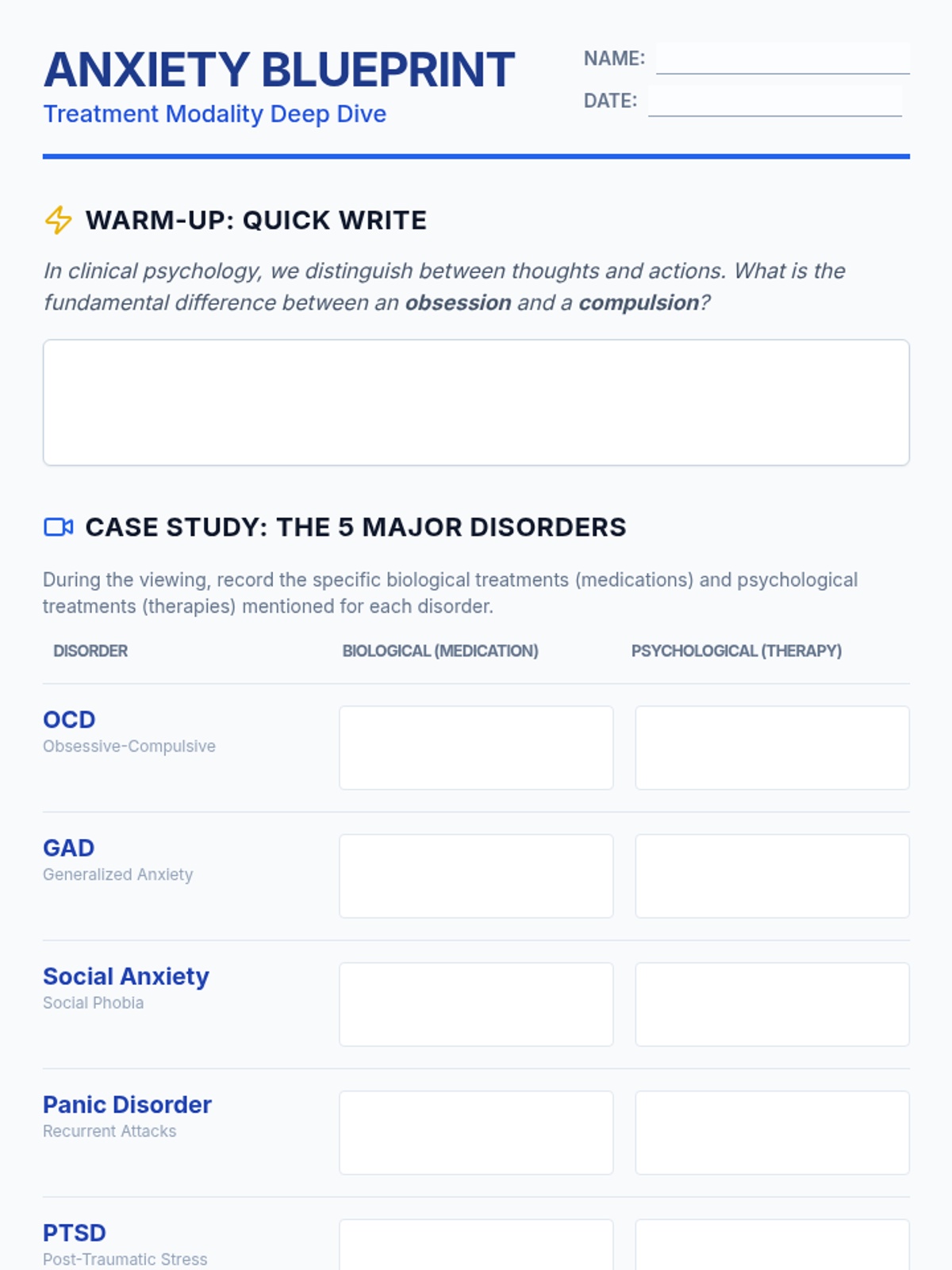 This lesson explores the dual approach to treating the five major anxiety disorders, focusing on the physiological mechanisms of medications (SSRIs, Benzos, Beta-blockers) and the cognitive-behavioral shifts of psychotherapy. Students will analyze the 'tandem' treatment model to understand why biological and psychological interventions are often used together for optimal patient outcomes.