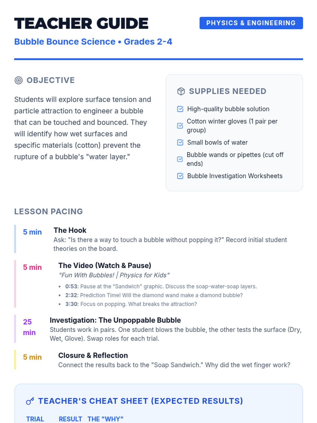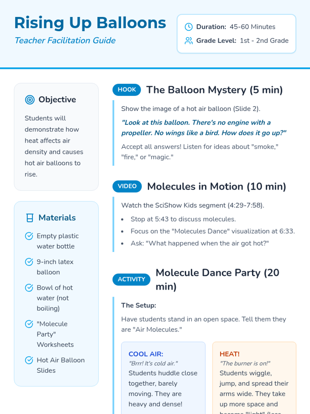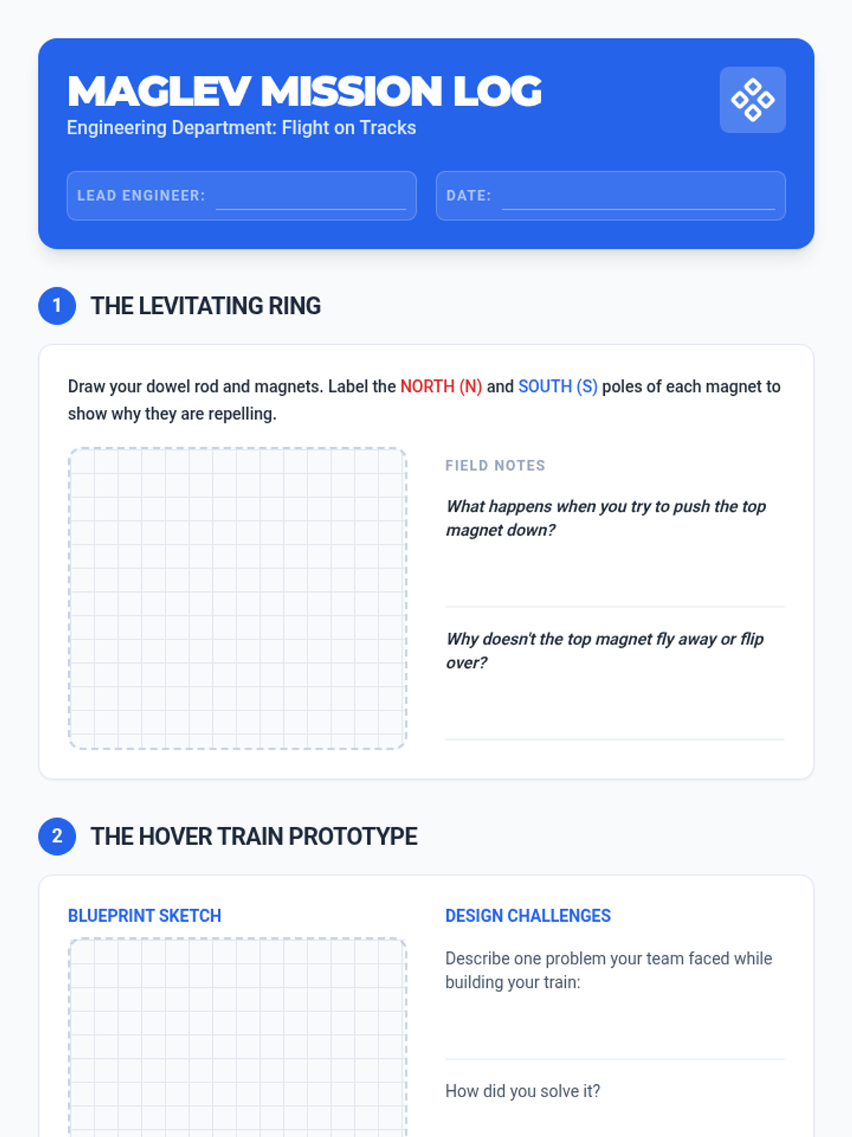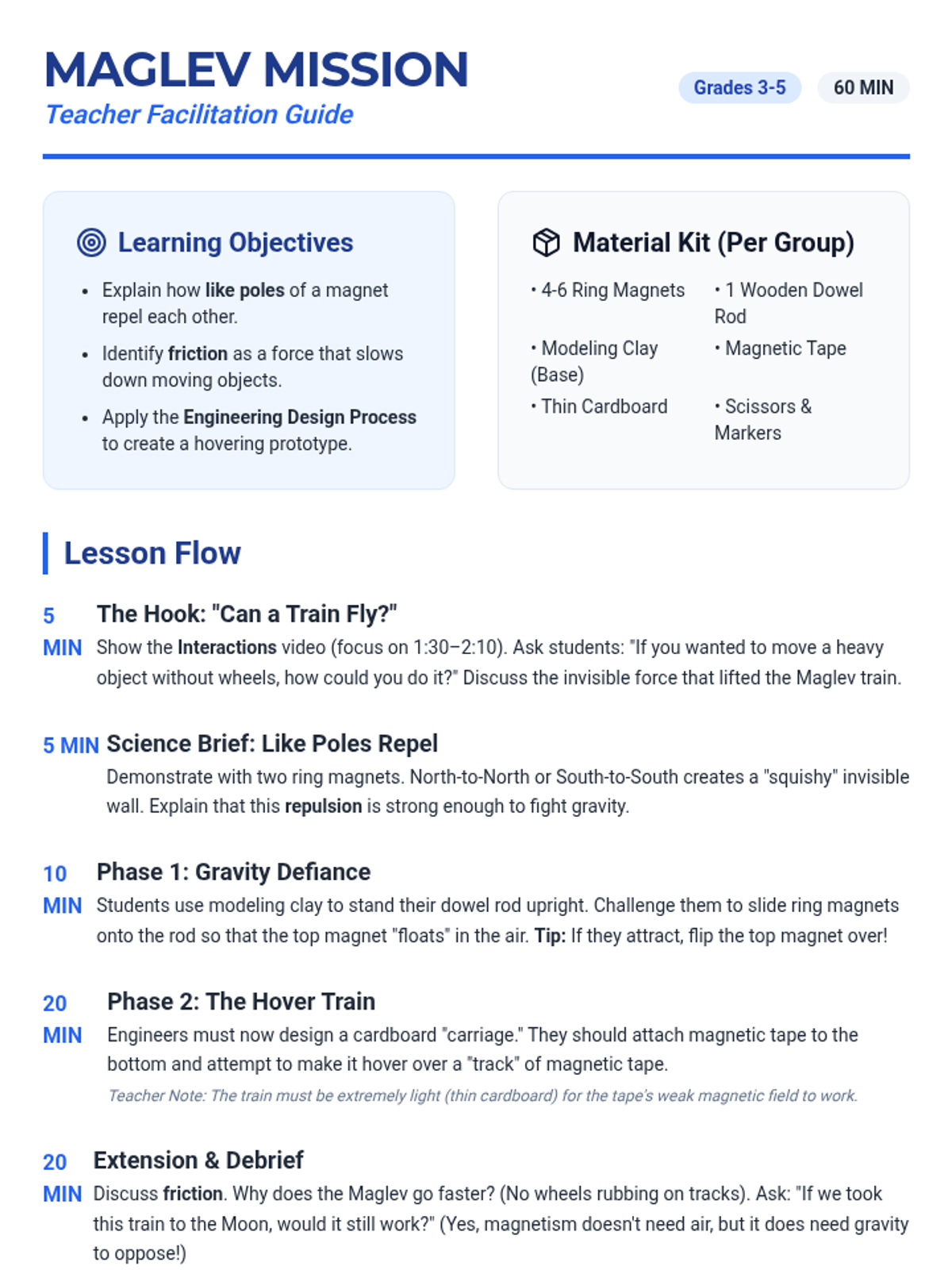 A hands-on STEM lesson for 3rd-5th graders exploring magnetic levitation. Students learn about magnetic repulsion, friction, and the engineering design process by building a hovering cardboard 'train'.