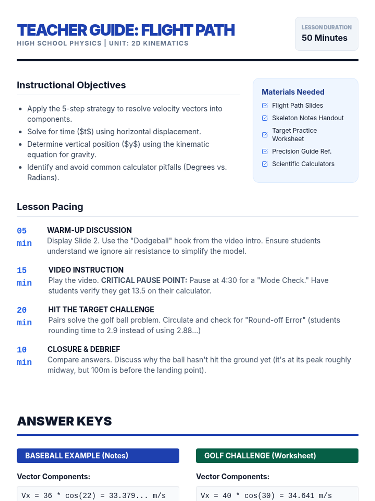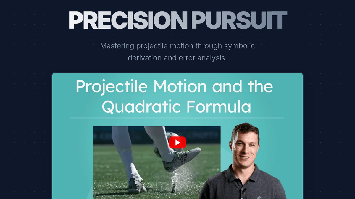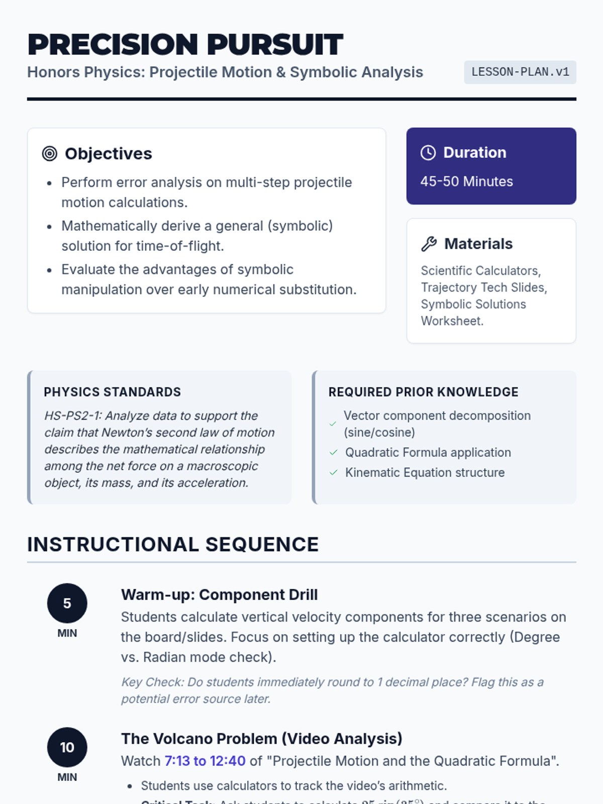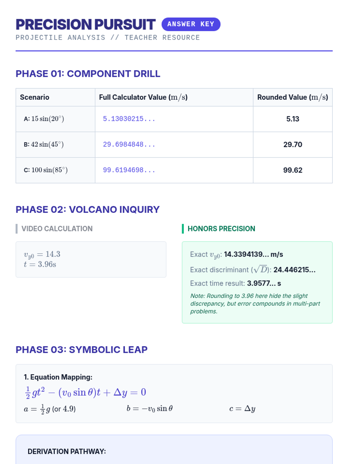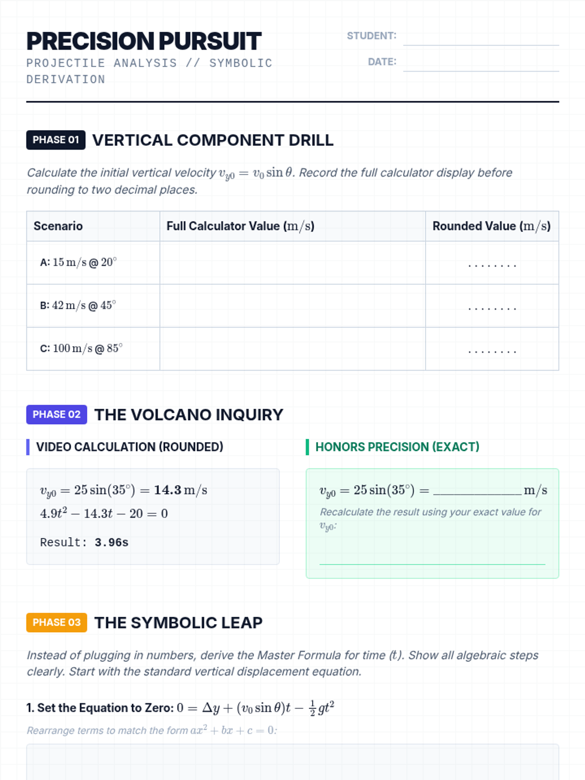 This lesson focuses on high-precision projectile motion calculations, challenging students to move beyond numerical substitution into symbolic derivation. Students will analyze potential rounding errors in textbook problems and derive a 'Master Formula' for time-of-flight using the quadratic formula.
