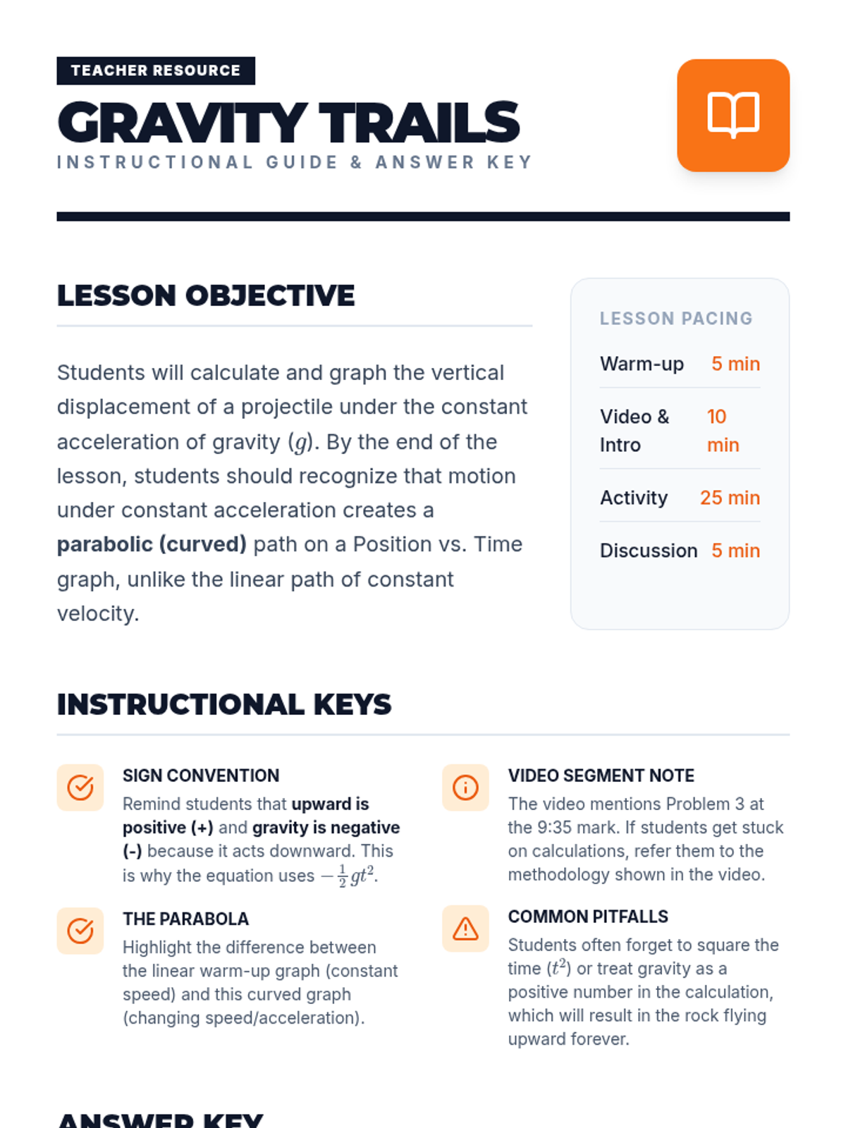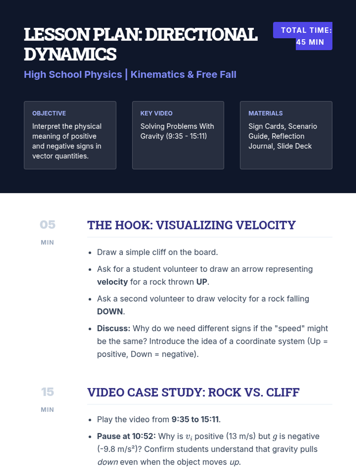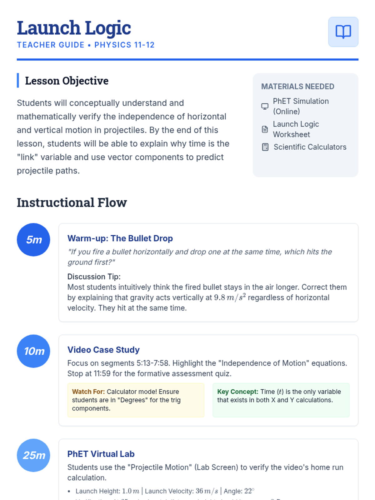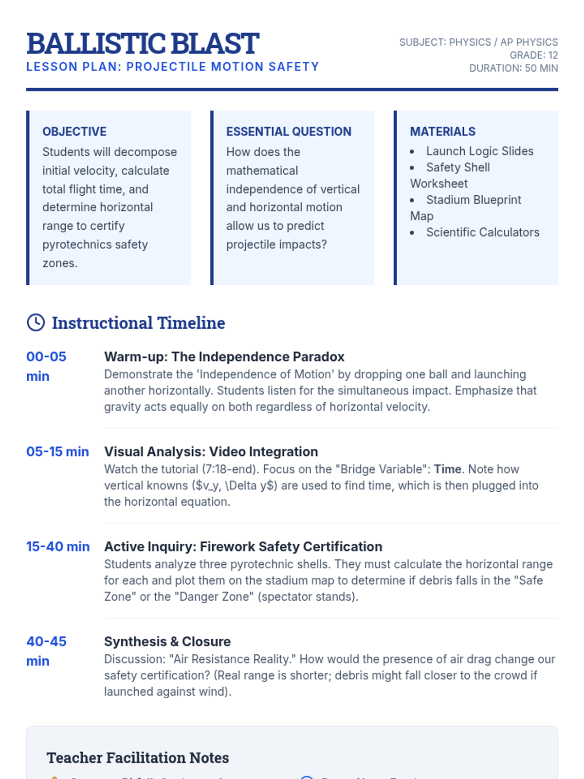 This lesson focuses on high-precision projectile motion calculations, challenging students to move beyond numerical substitution into symbolic derivation. Students will analyze potential rounding errors in textbook problems and derive a 'Master Formula' for time-of-flight using the quadratic formula.