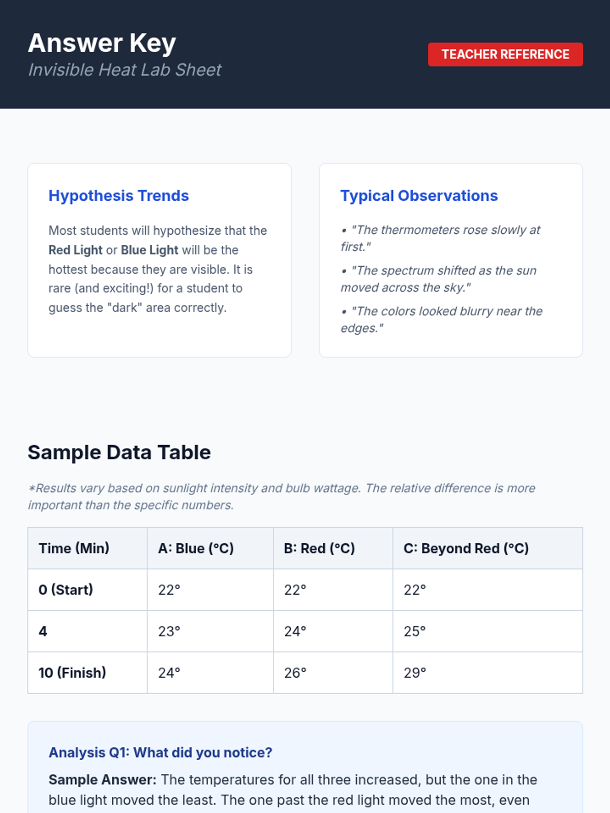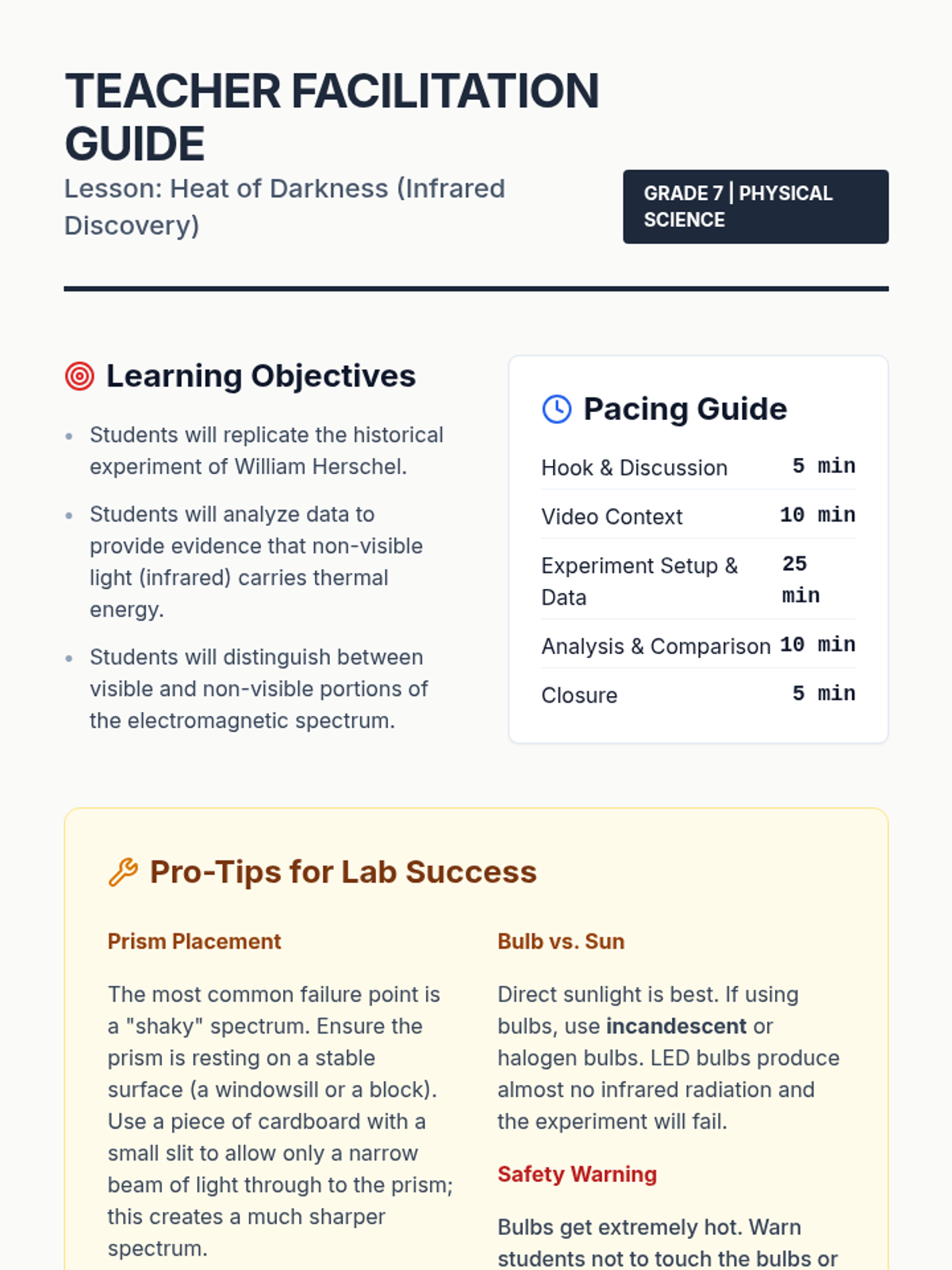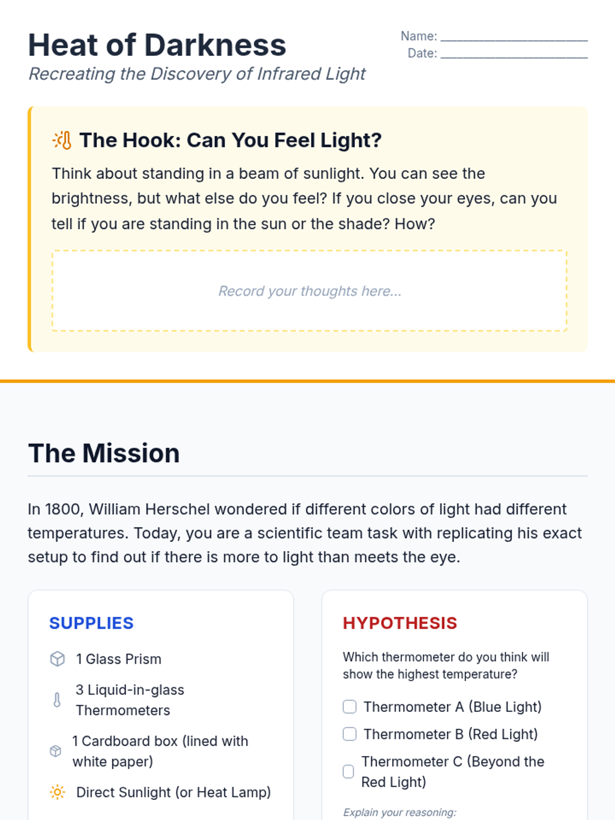 A hands-on investigation into the discovery of infrared light, recreating William Herschel's 1800 experiment to prove that light exists beyond the visible spectrum. Students will use prisms and thermometers to detect 'invisible' heat.