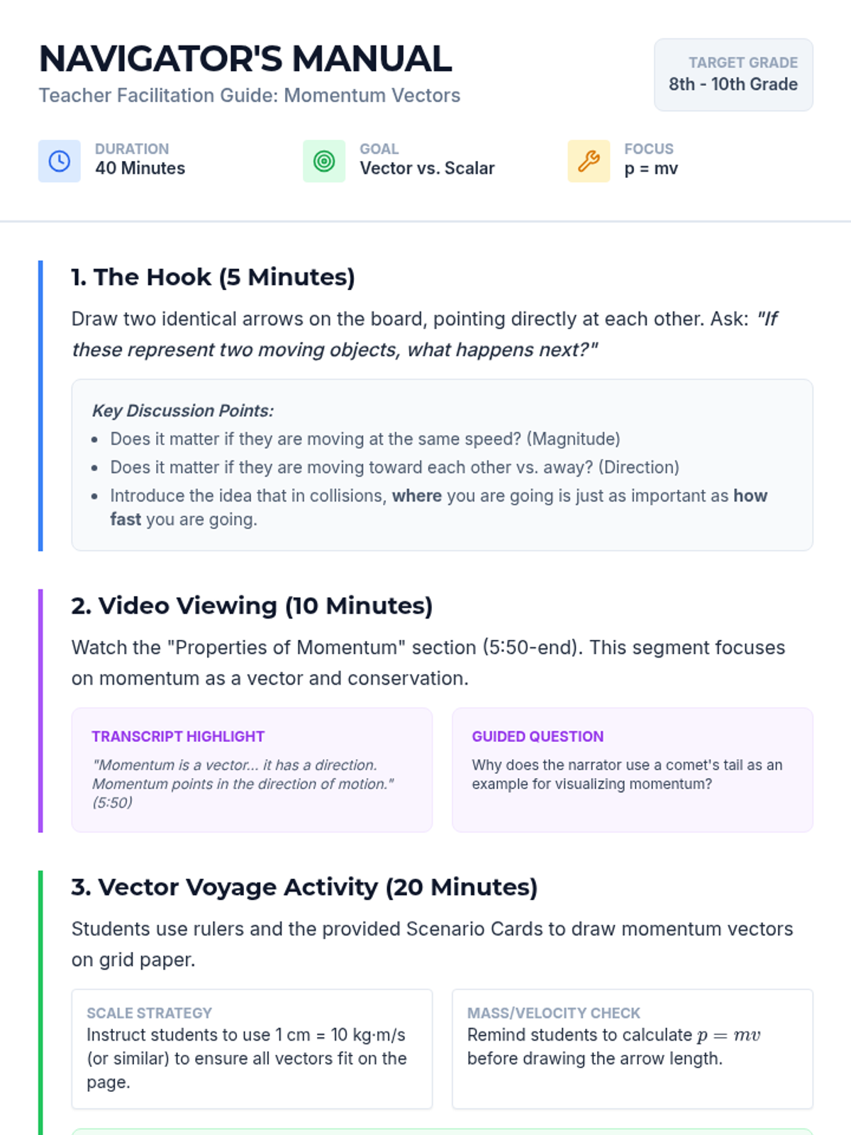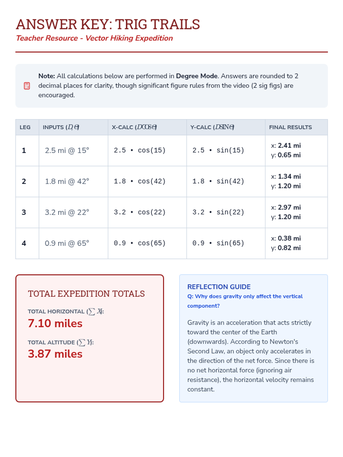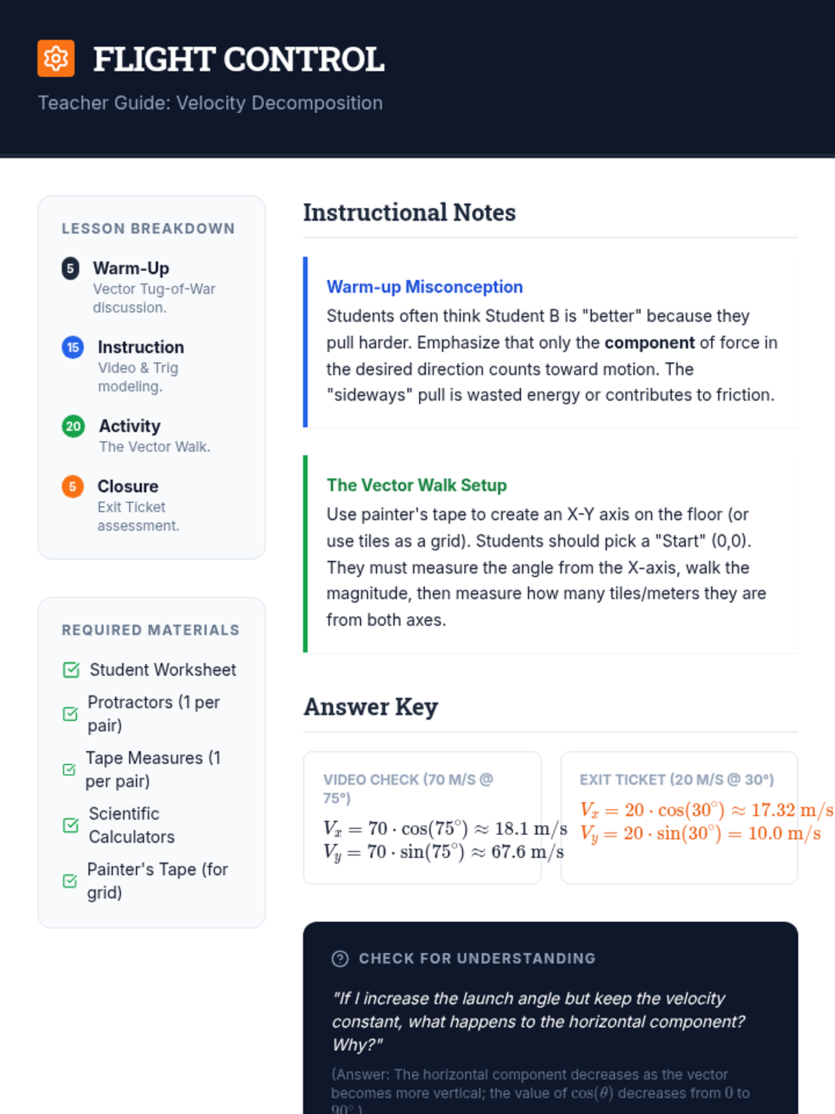 This lesson guides students through the process of decomposing two-dimensional velocity vectors into their horizontal and vertical components using trigonometry, featuring a hands-on 'Vector Walk' activity and video-based modeling.