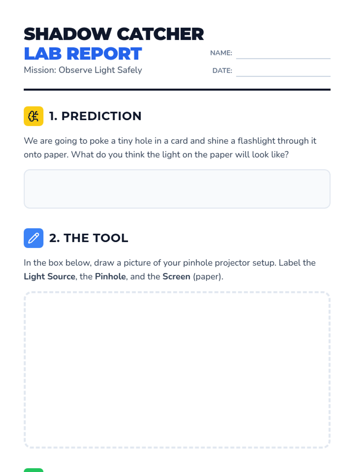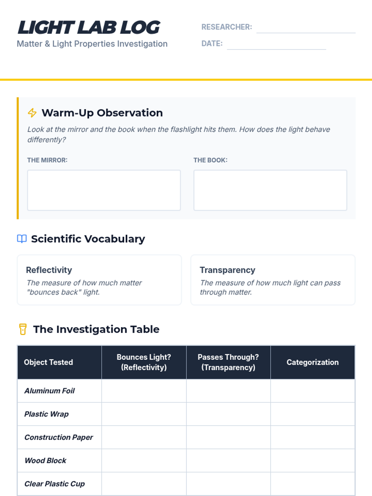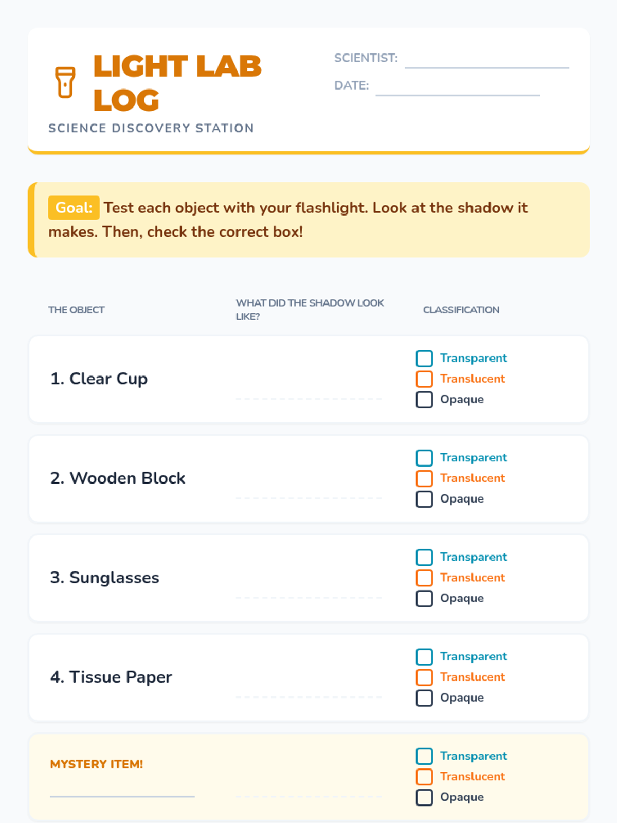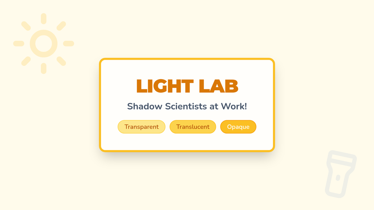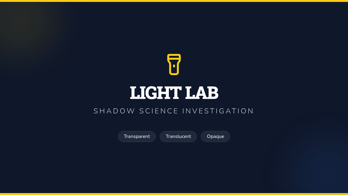 An interactive 2nd-grade science lesson where students explore how light interacts with different materials through a 'Light Lab' hands-on experiment. Students will learn to classify objects as transparent, translucent, or opaque based on how much light they let through.