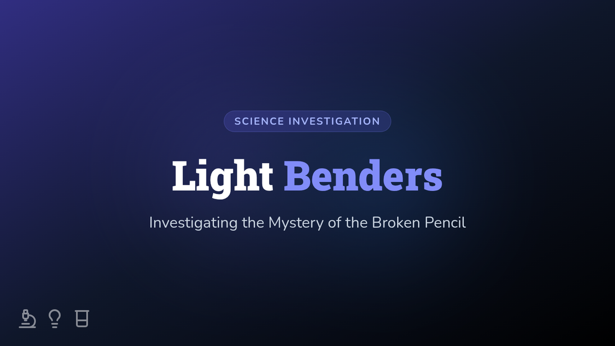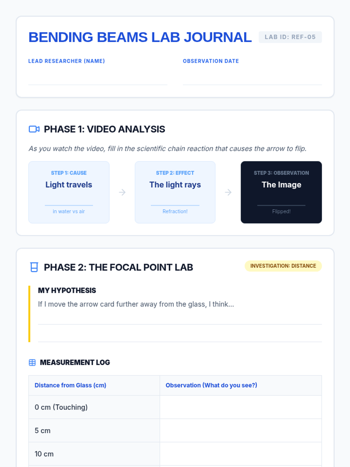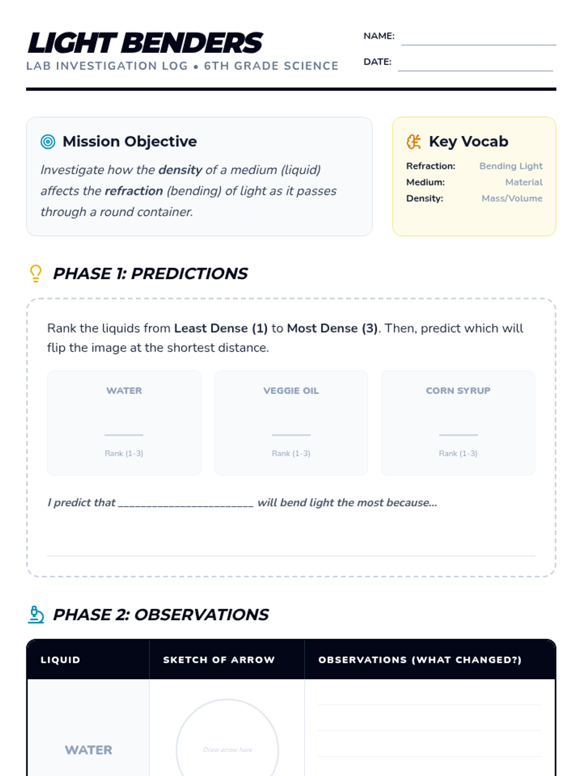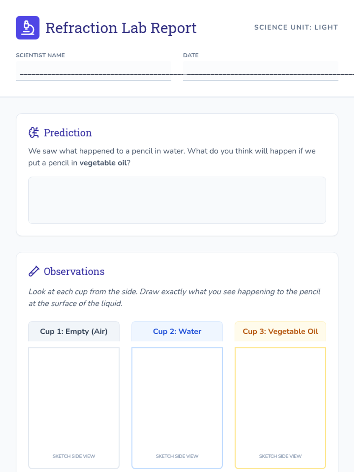 Students investigate how light bends when it passes through different mediums like water or glass.