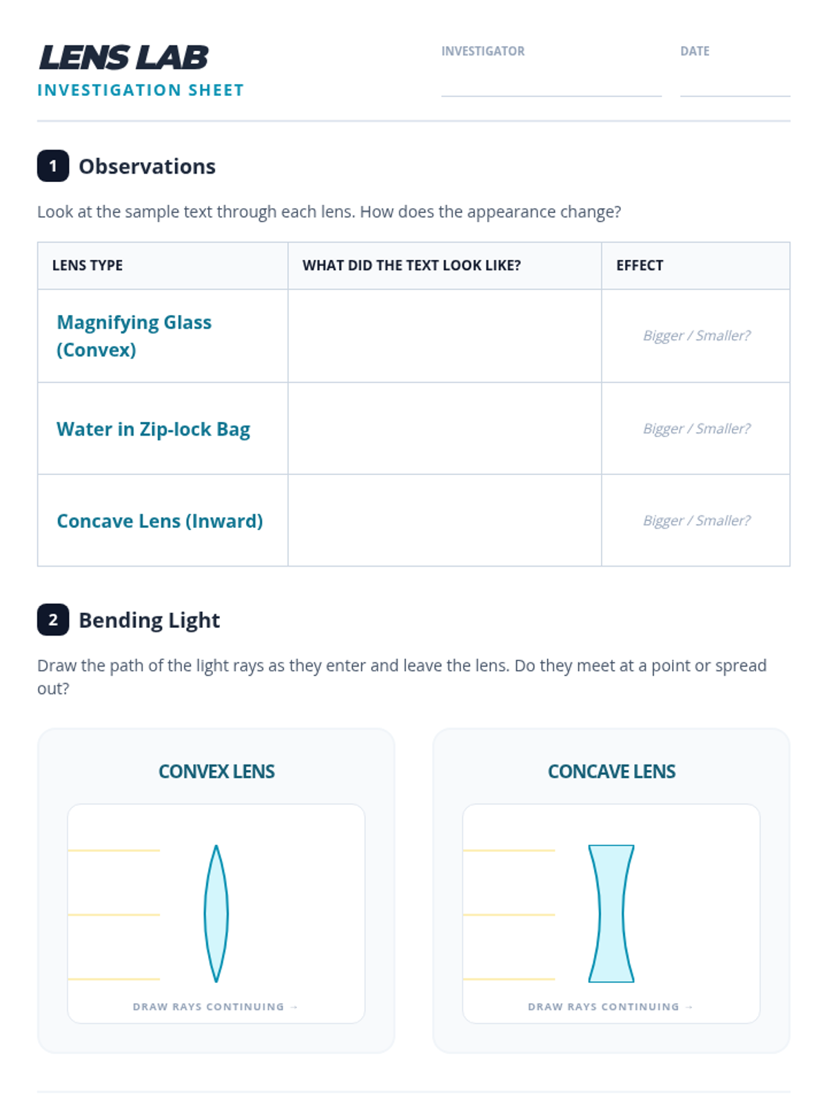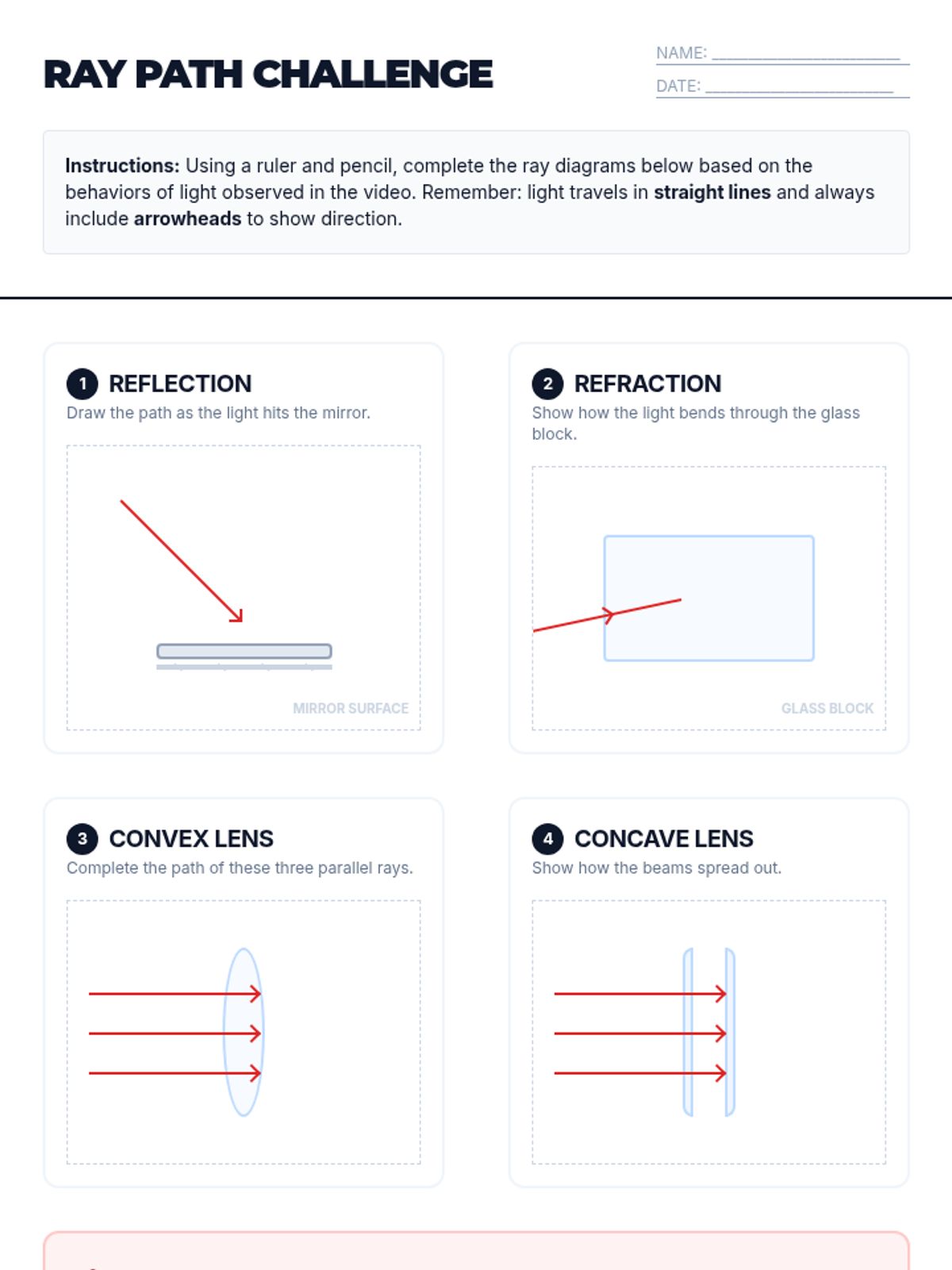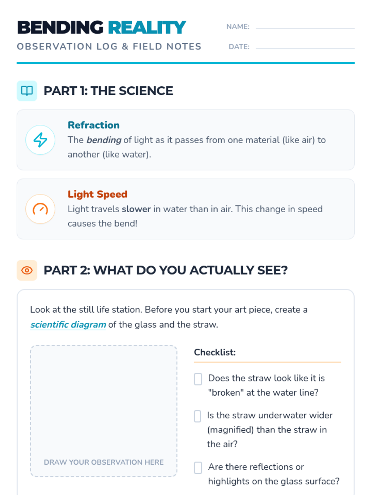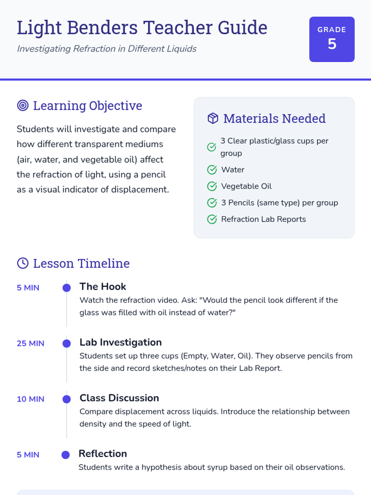 Students investigate how light bends when it passes through different mediums like water or glass.