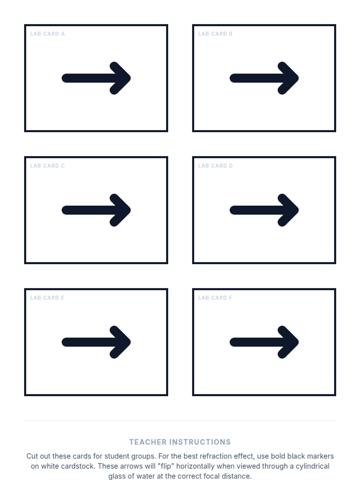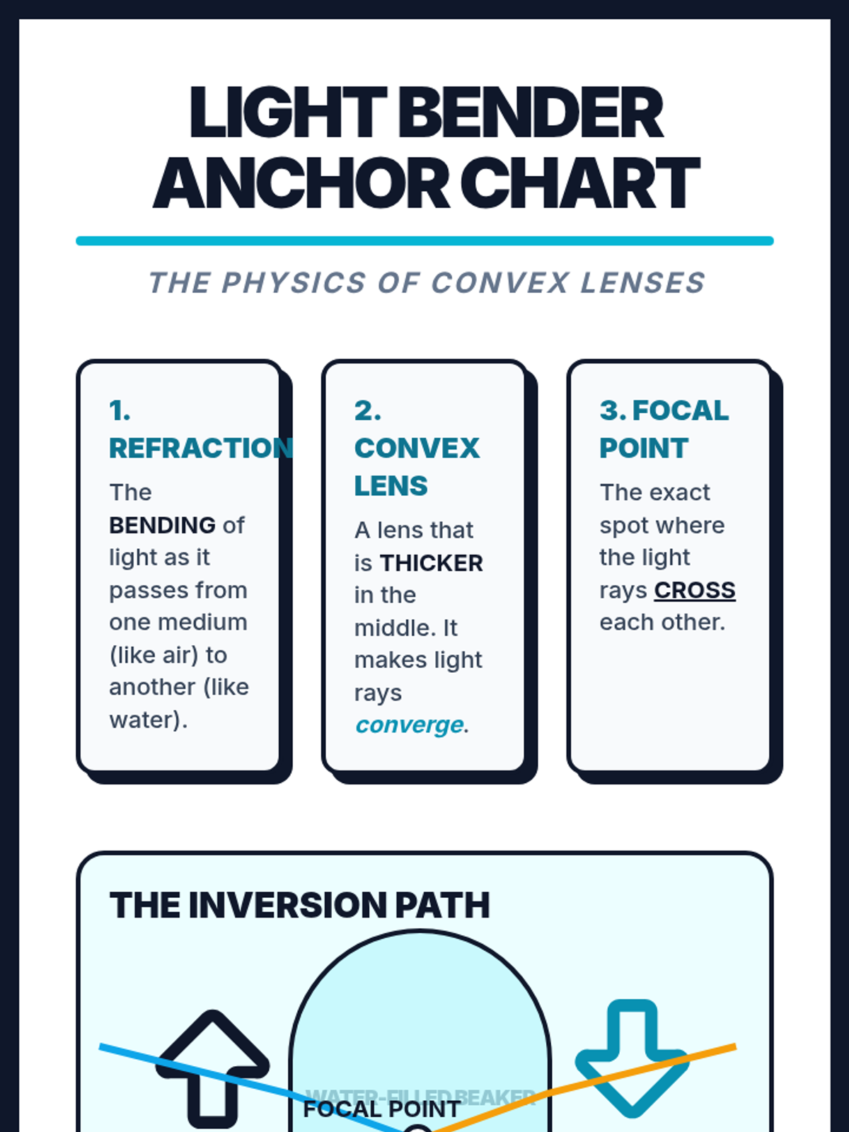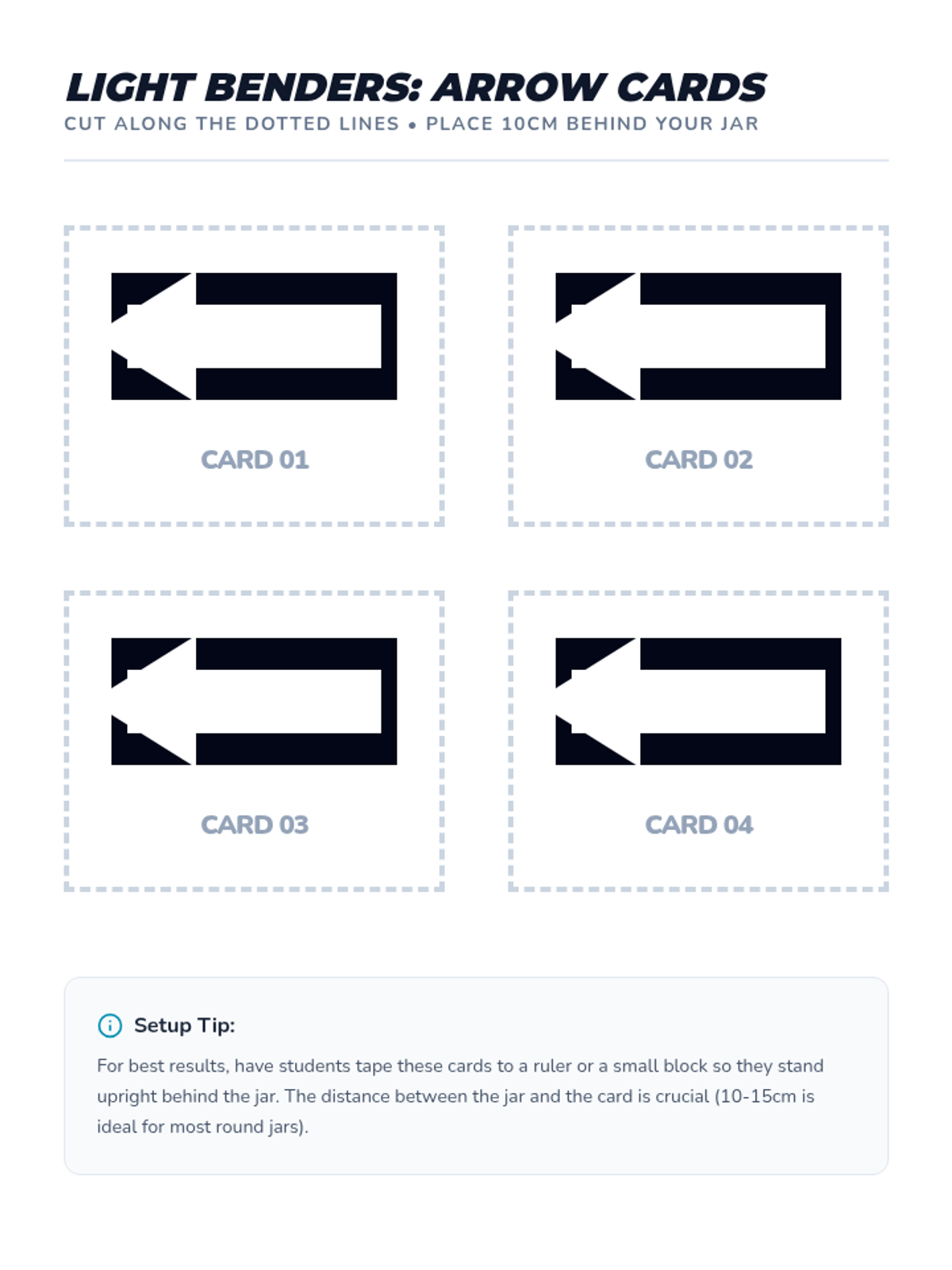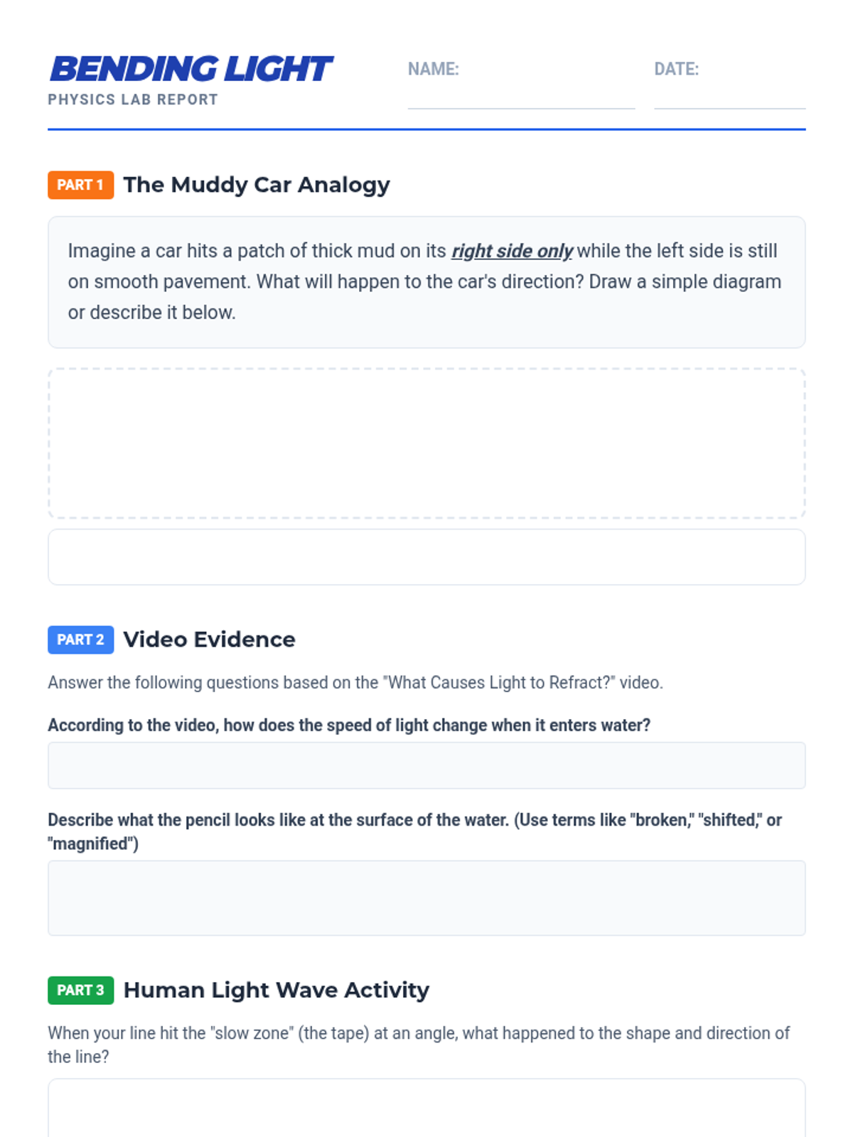 Students investigate how light bends when it passes through different mediums like water or glass.
