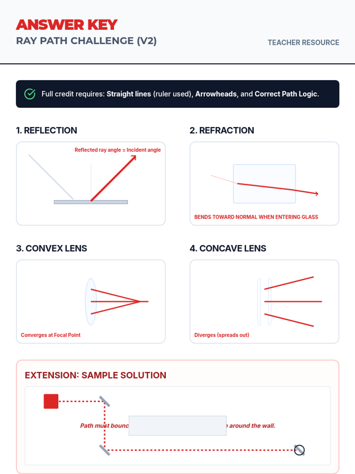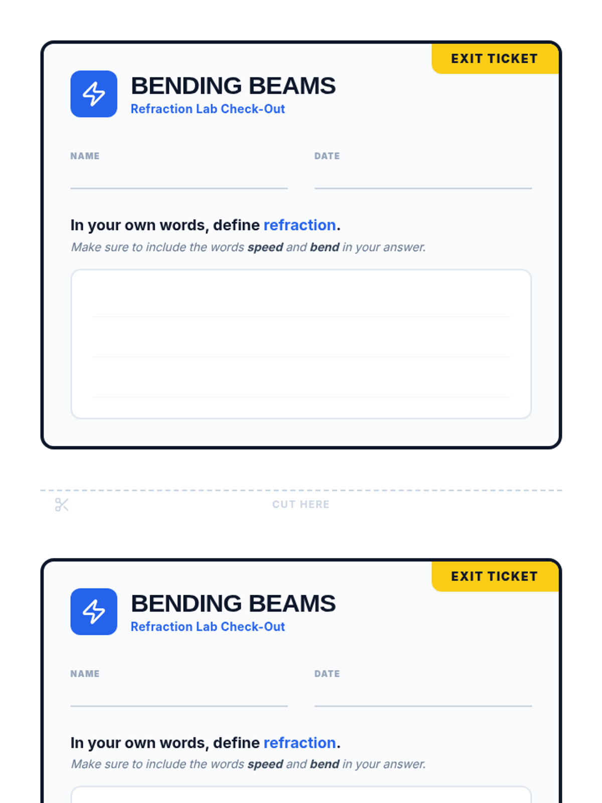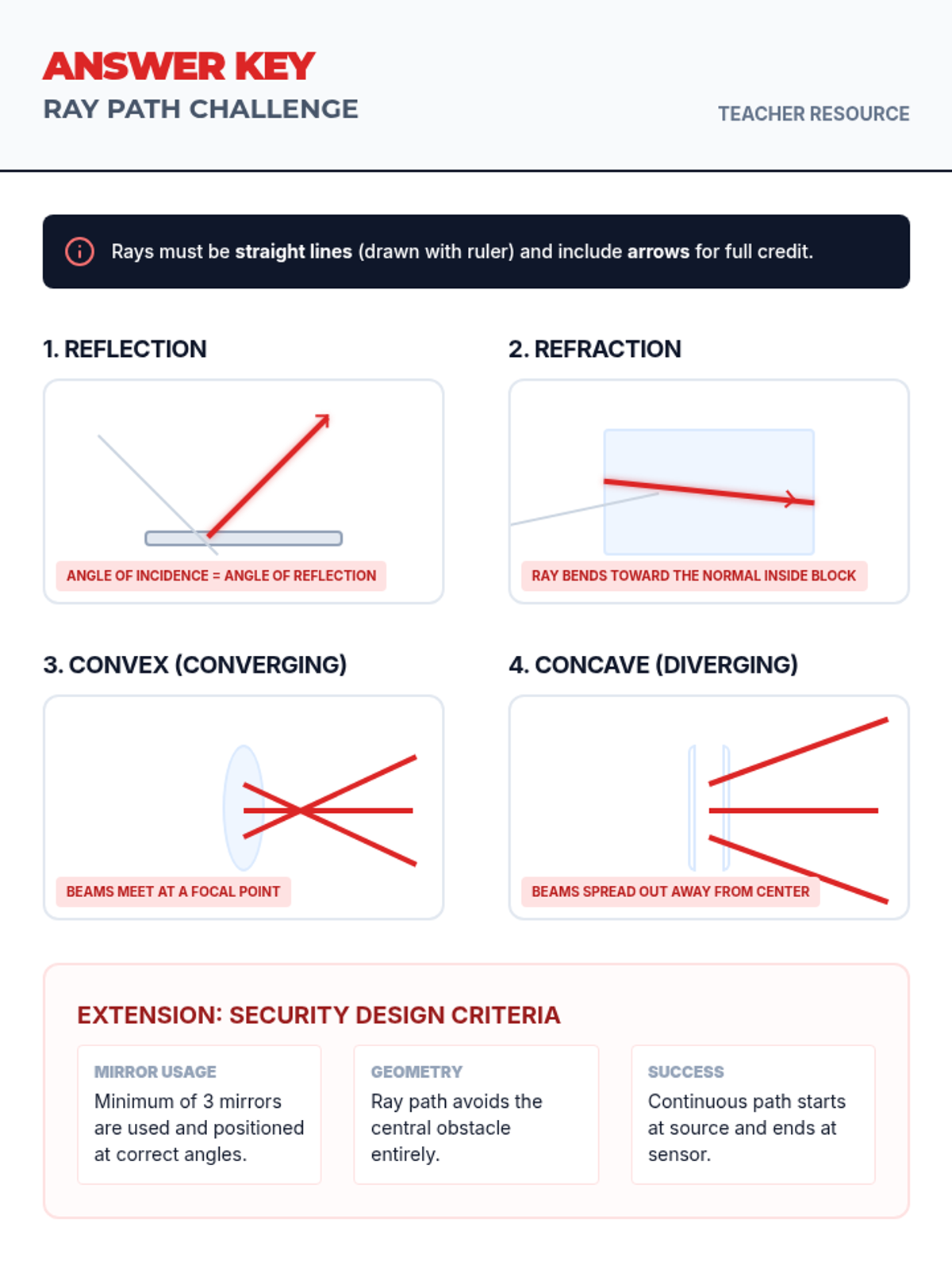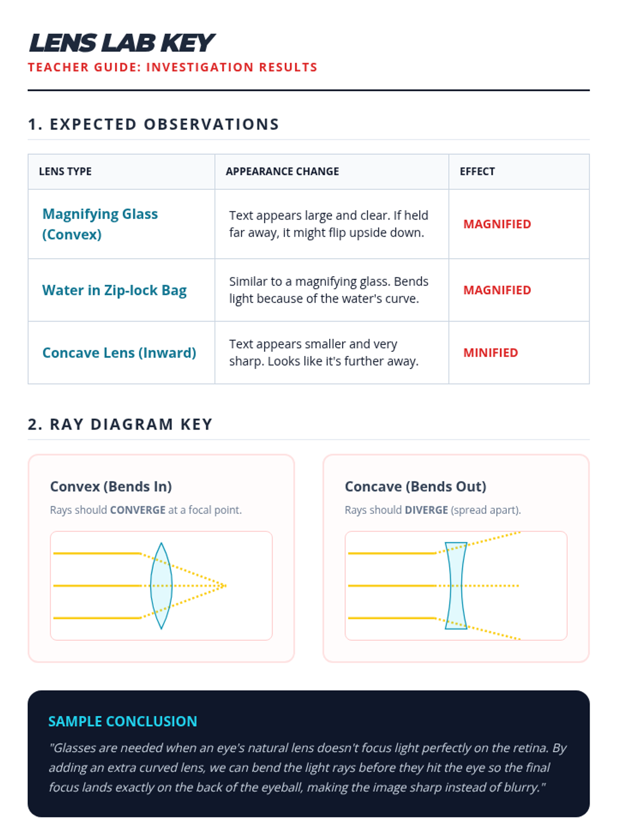 Students investigate how light bends when it passes through different mediums like water or glass.