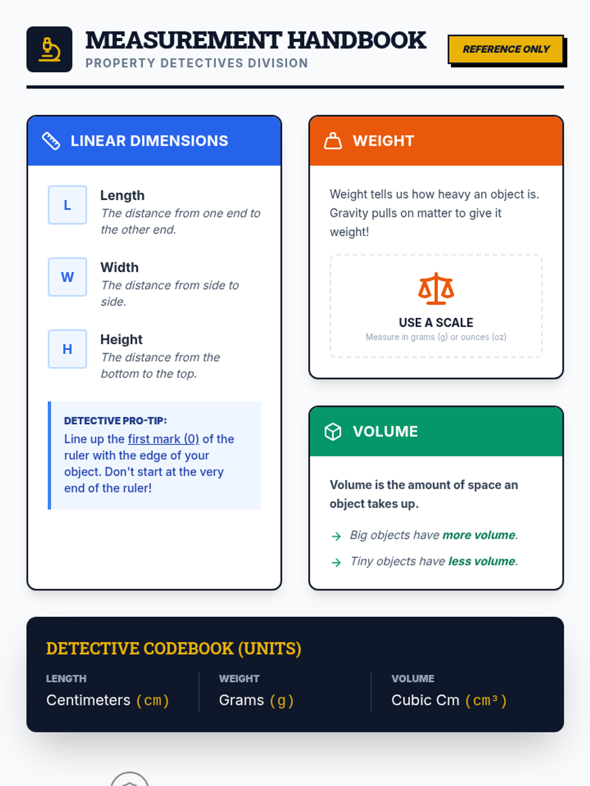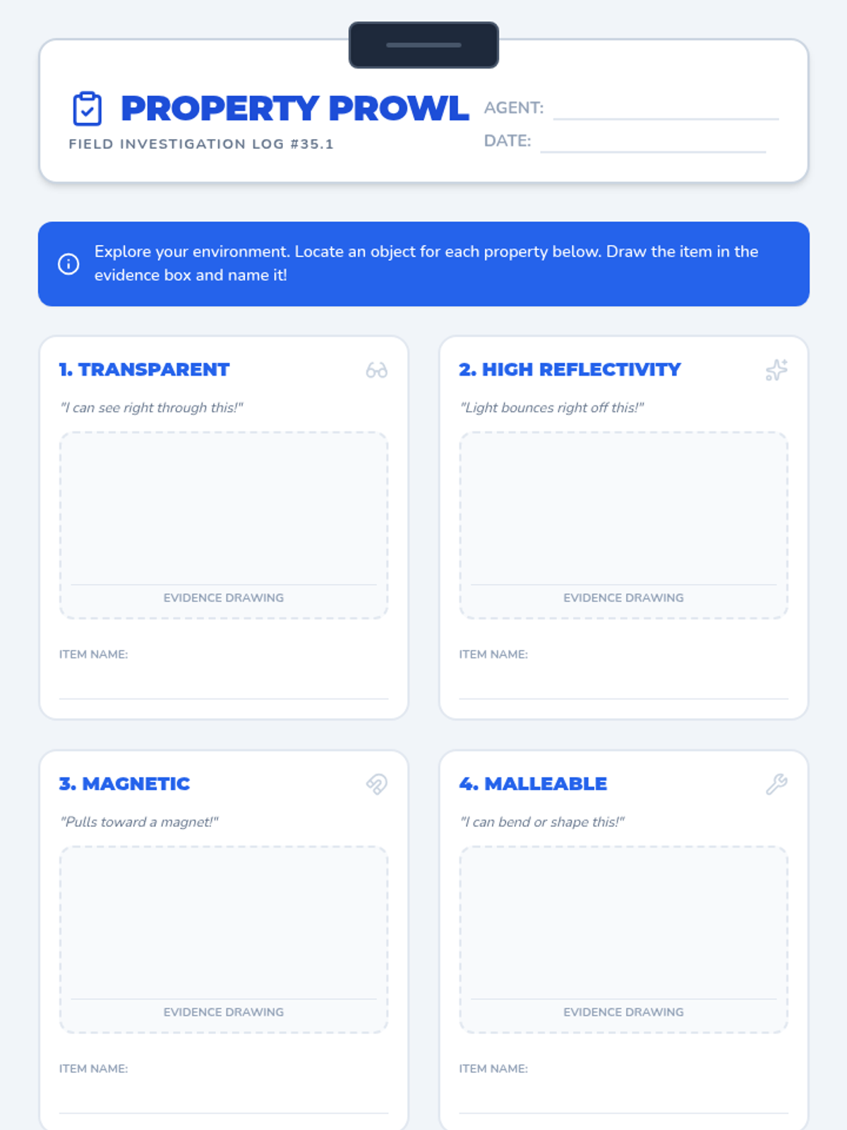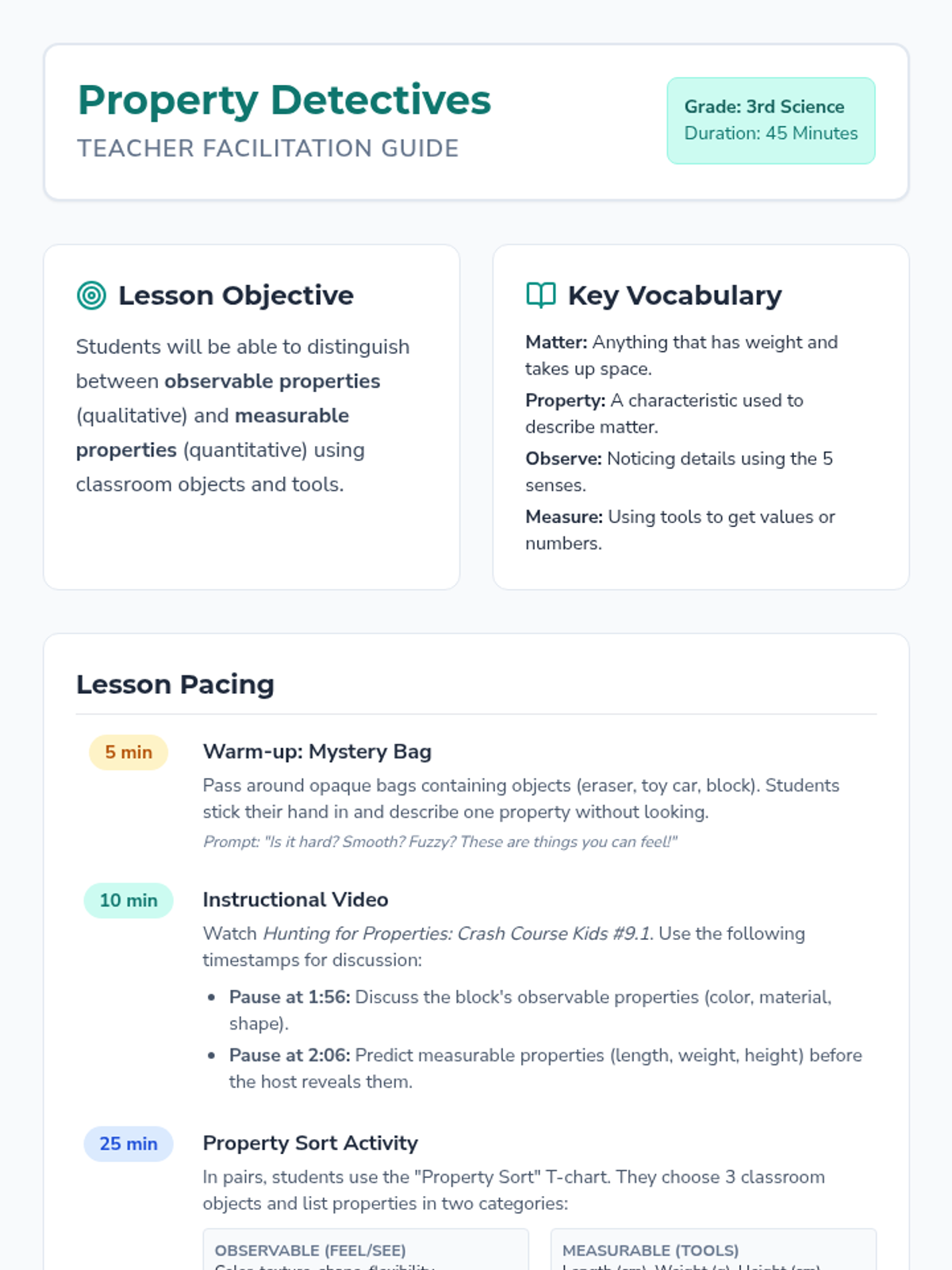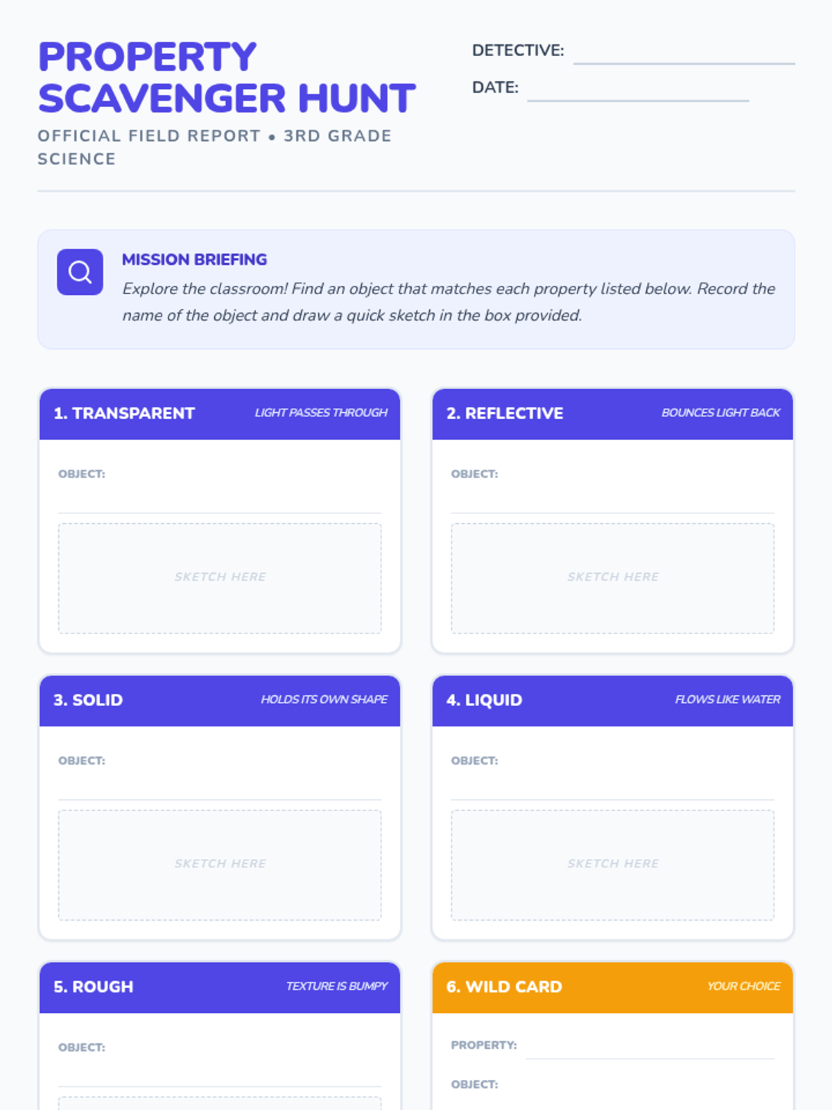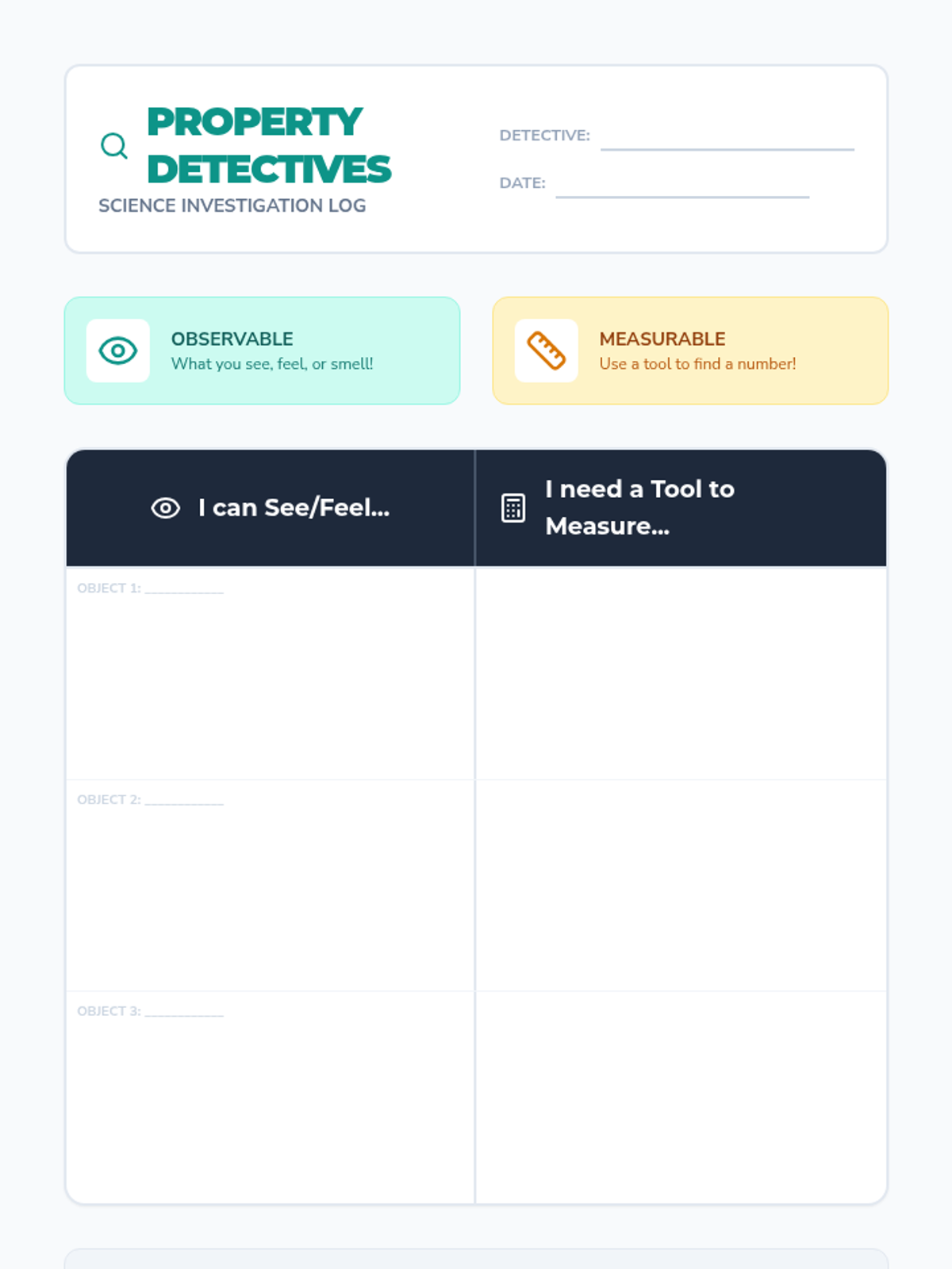 Students will act as "Property Detectives" to identify classroom objects based on their physical properties. They will learn to distinguish between observable and measurable properties and use scientific tools like rulers and scales to gather quantitative data.