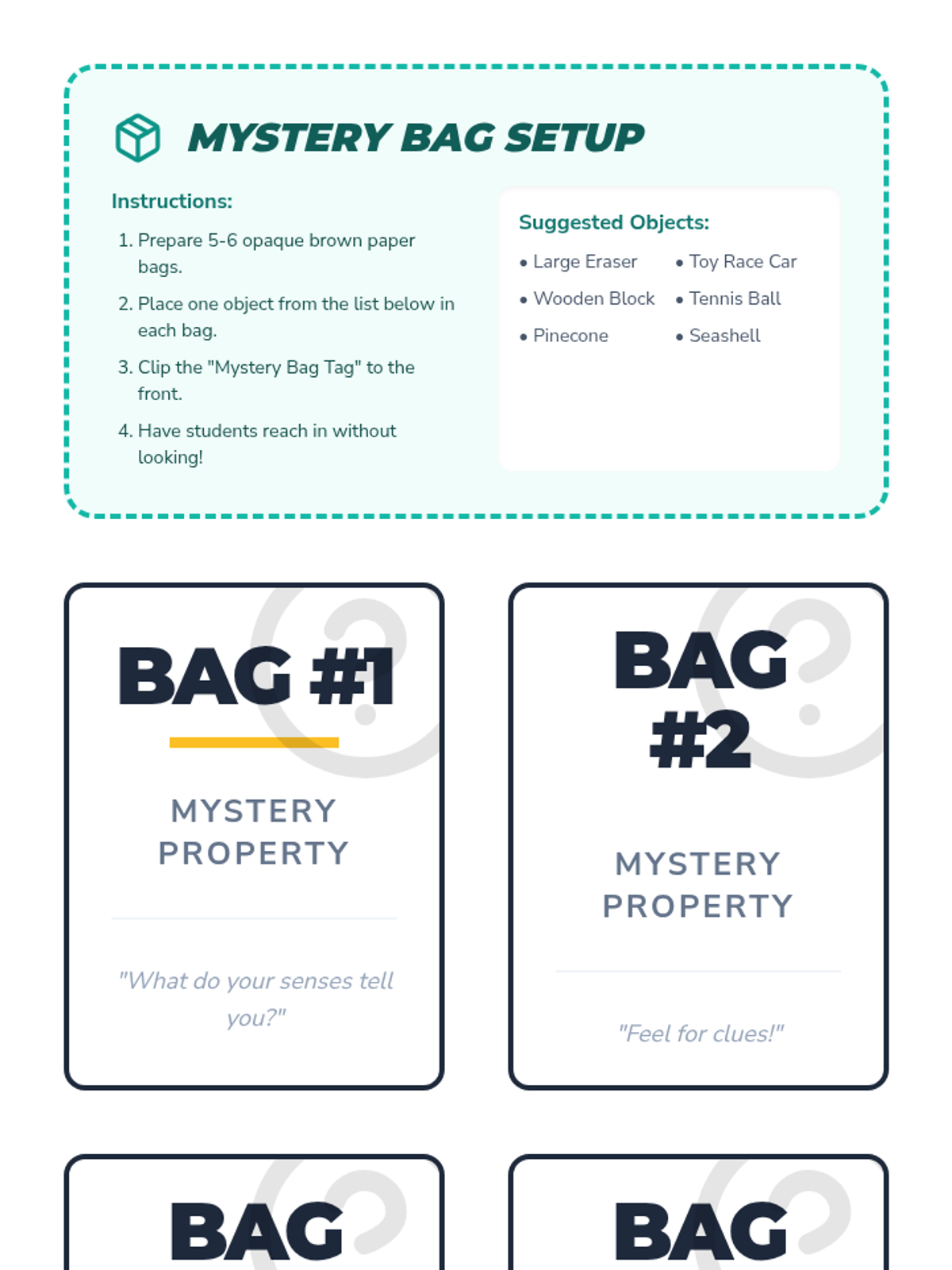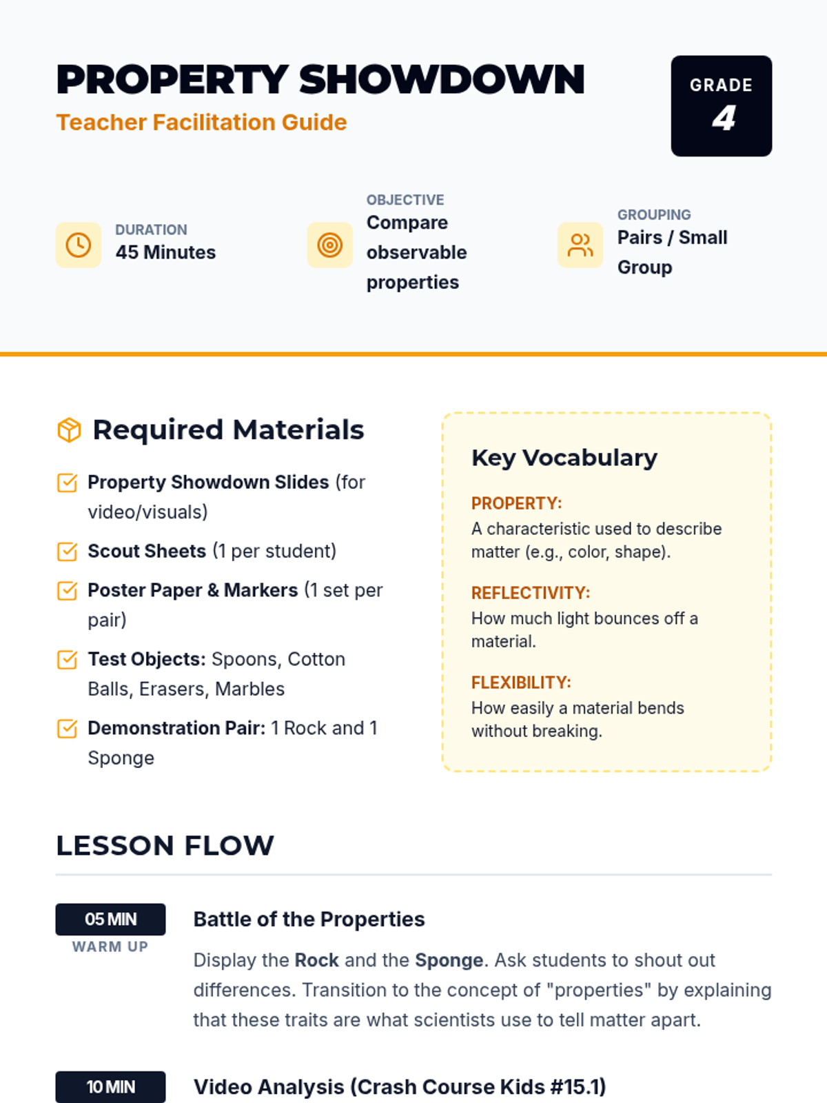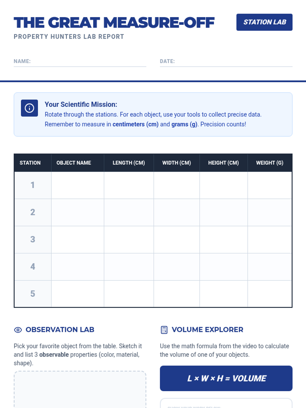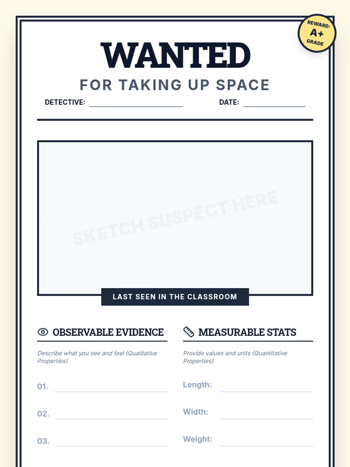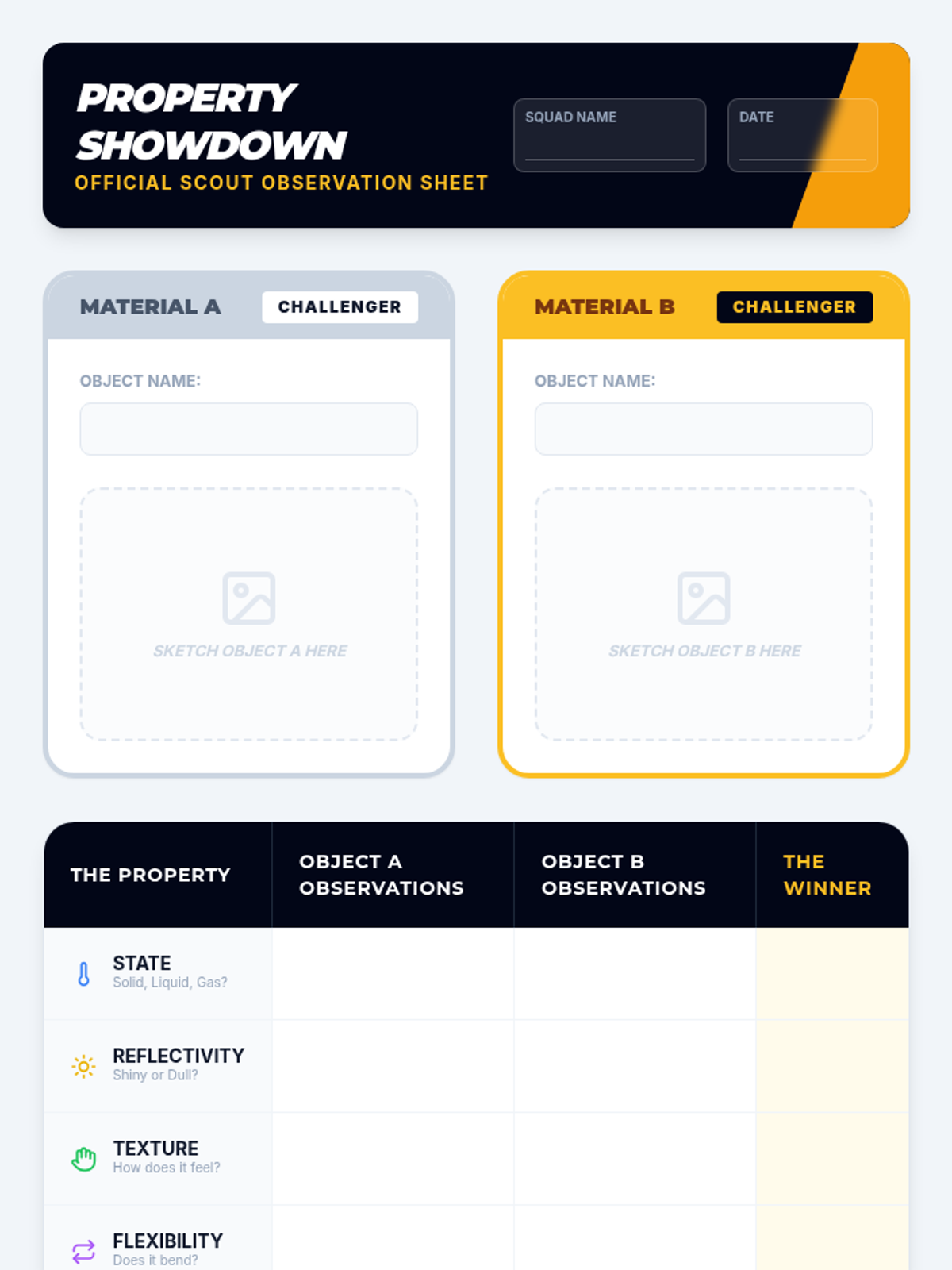 Students will act as "Property Detectives" to identify classroom objects based on their physical properties. They will learn to distinguish between observable and measurable properties and use scientific tools like rulers and scales to gather quantitative data.