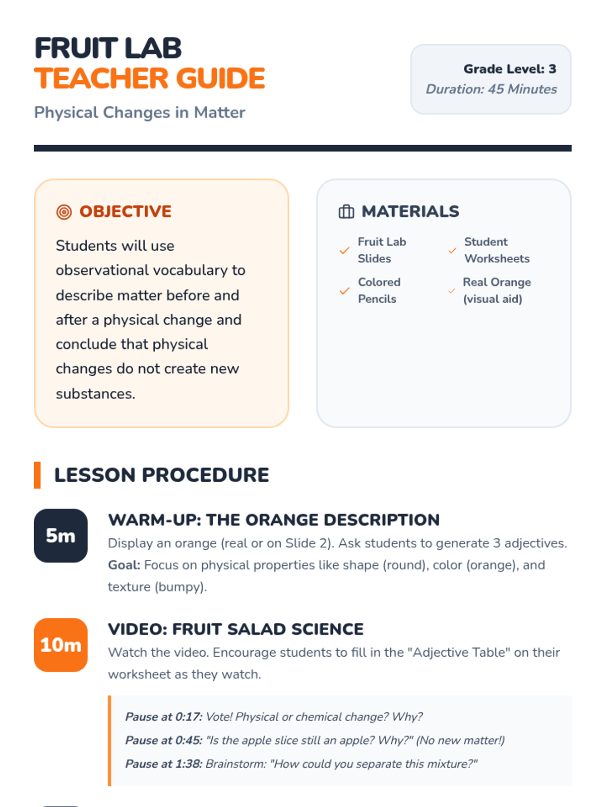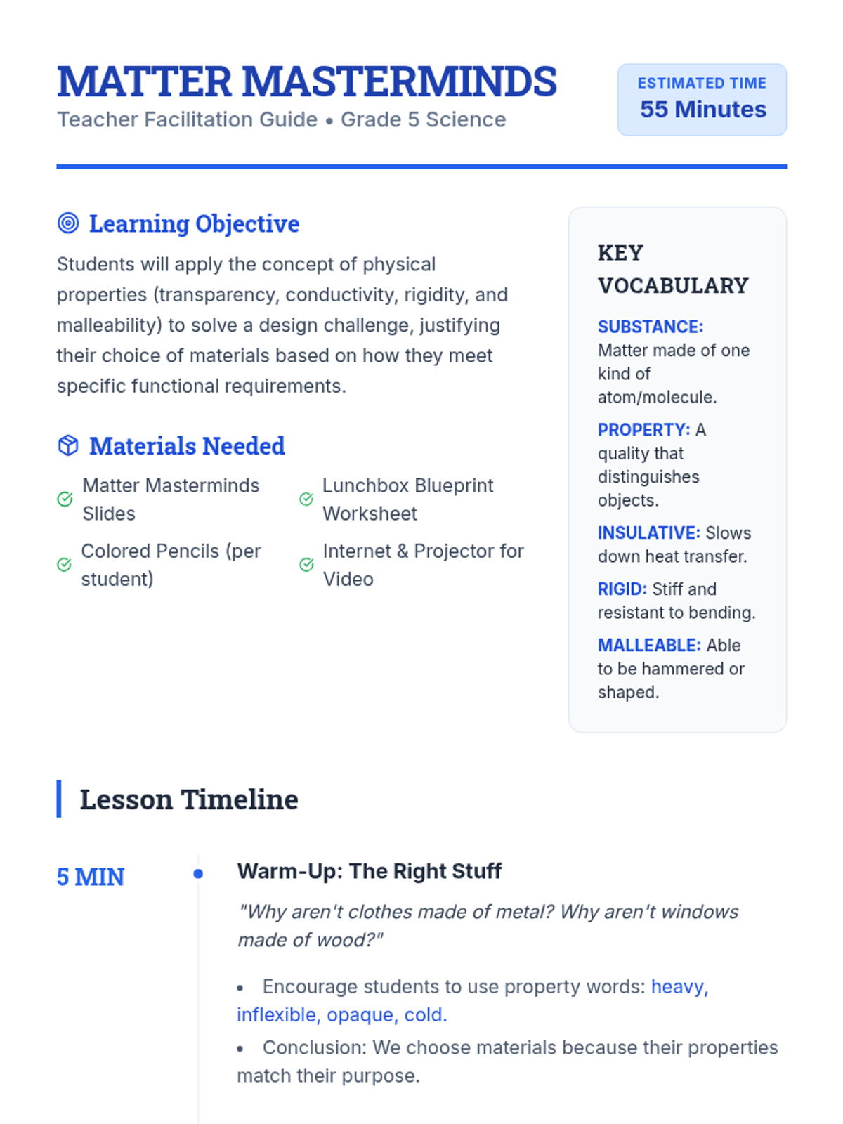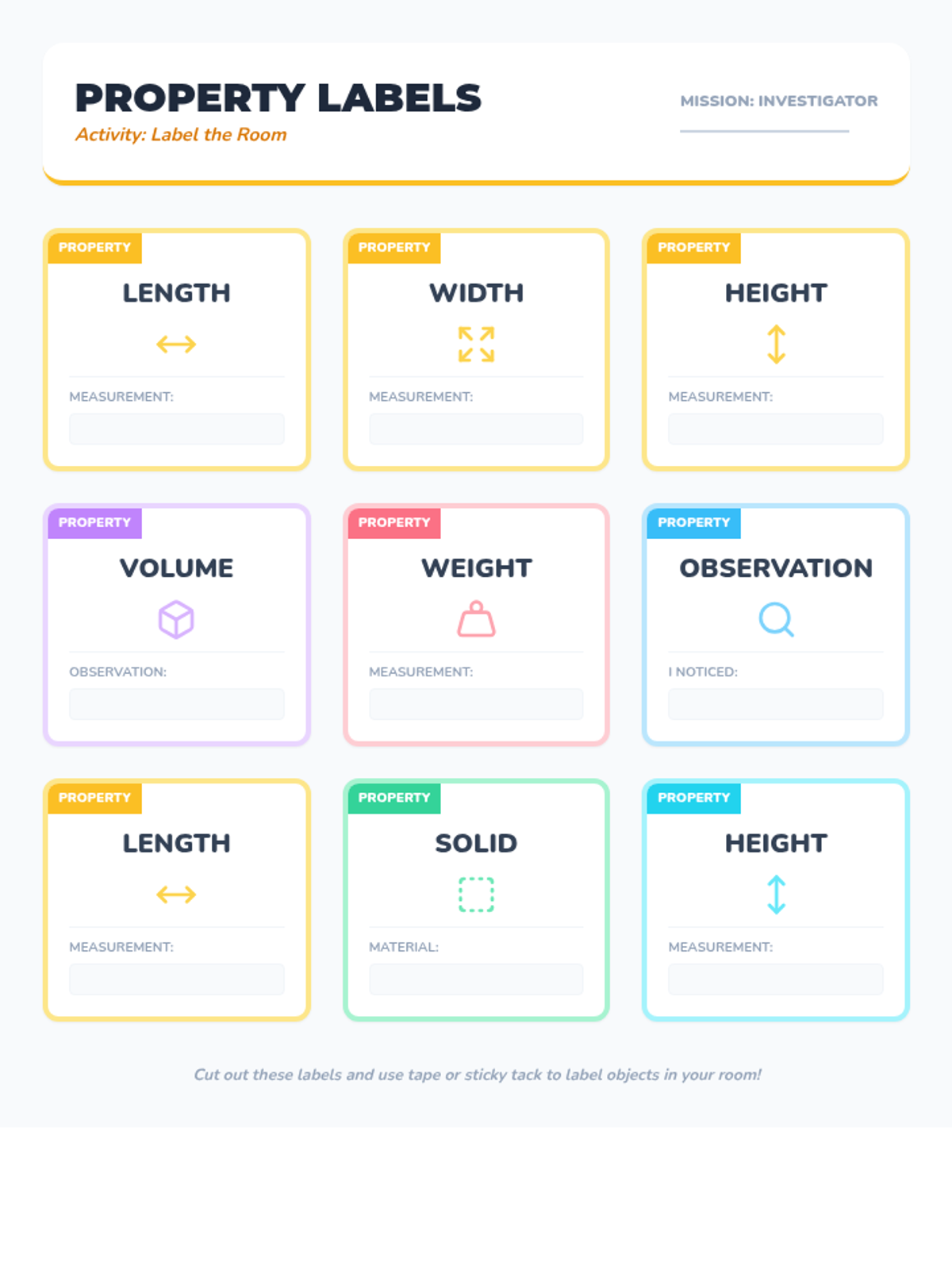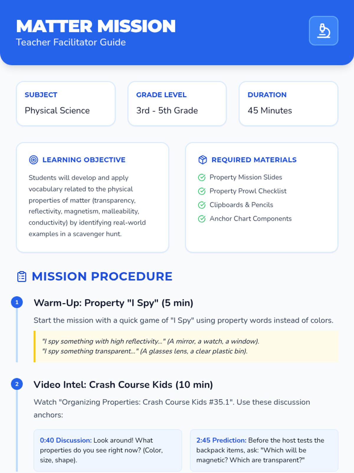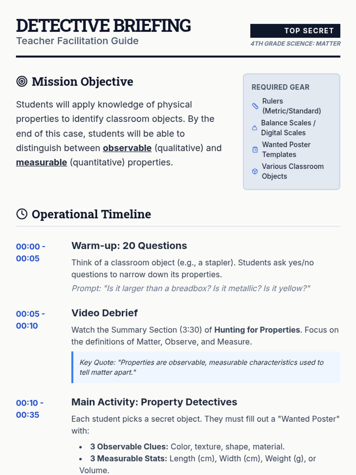 Students will act as "Property Detectives" to identify classroom objects based on their physical properties. They will learn to distinguish between observable and measurable properties and use scientific tools like rulers and scales to gather quantitative data.