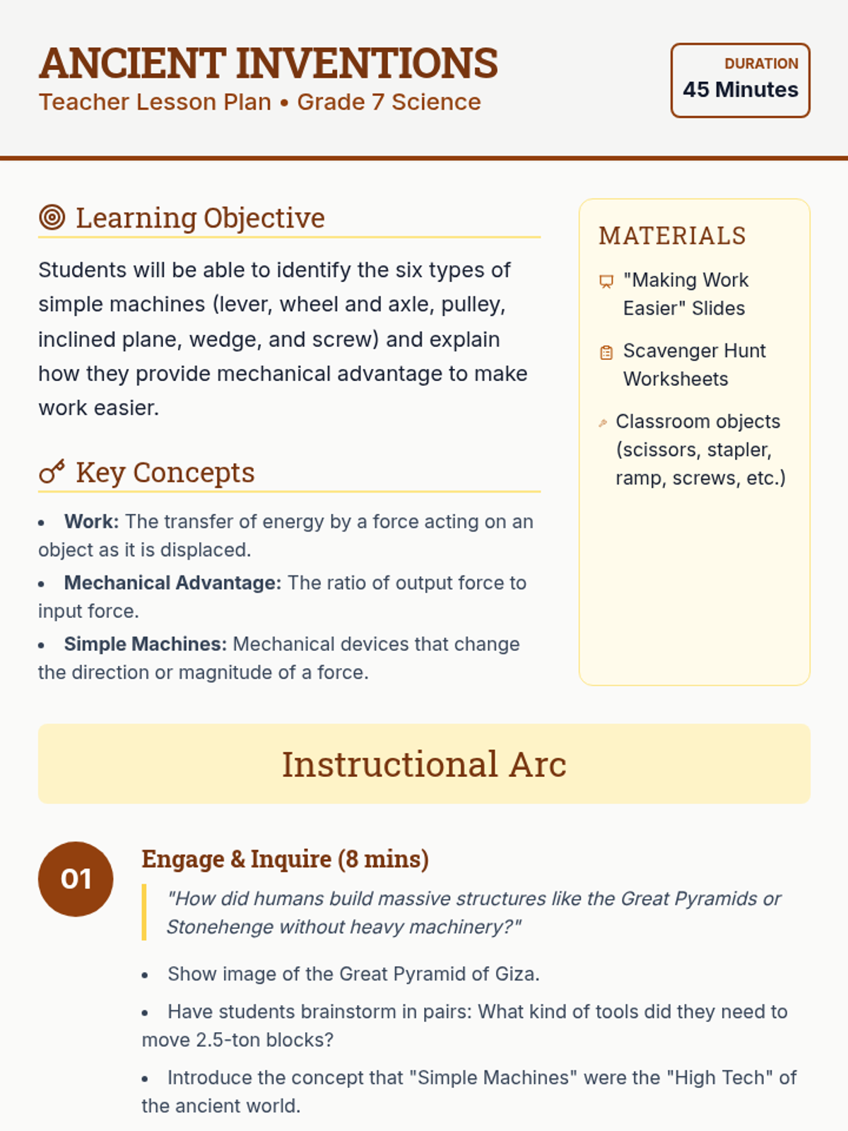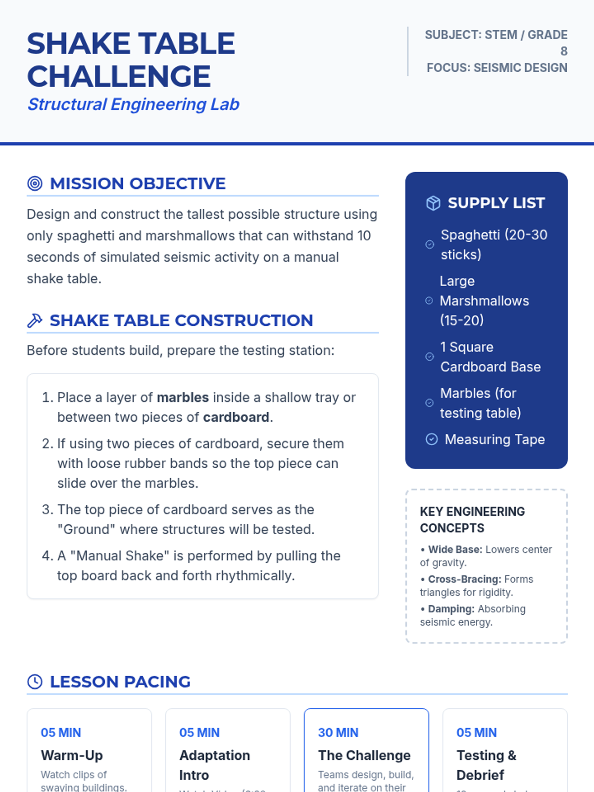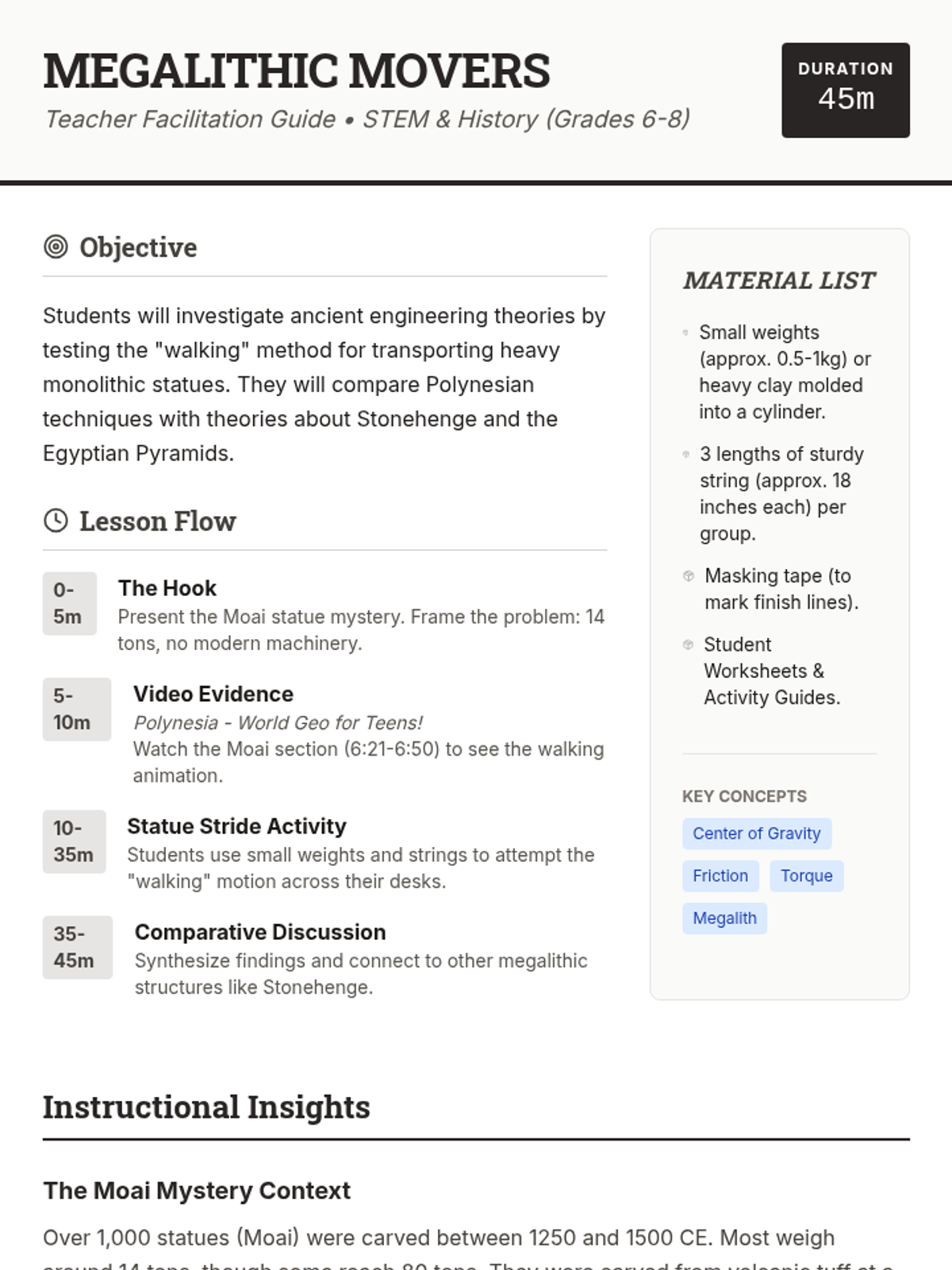 A STEM-focused lesson where students explore the engineering secrets of ancient wonders, focusing on materials, erosion, and seismic stability. Students build their own structures to test against simulated earthquakes.
