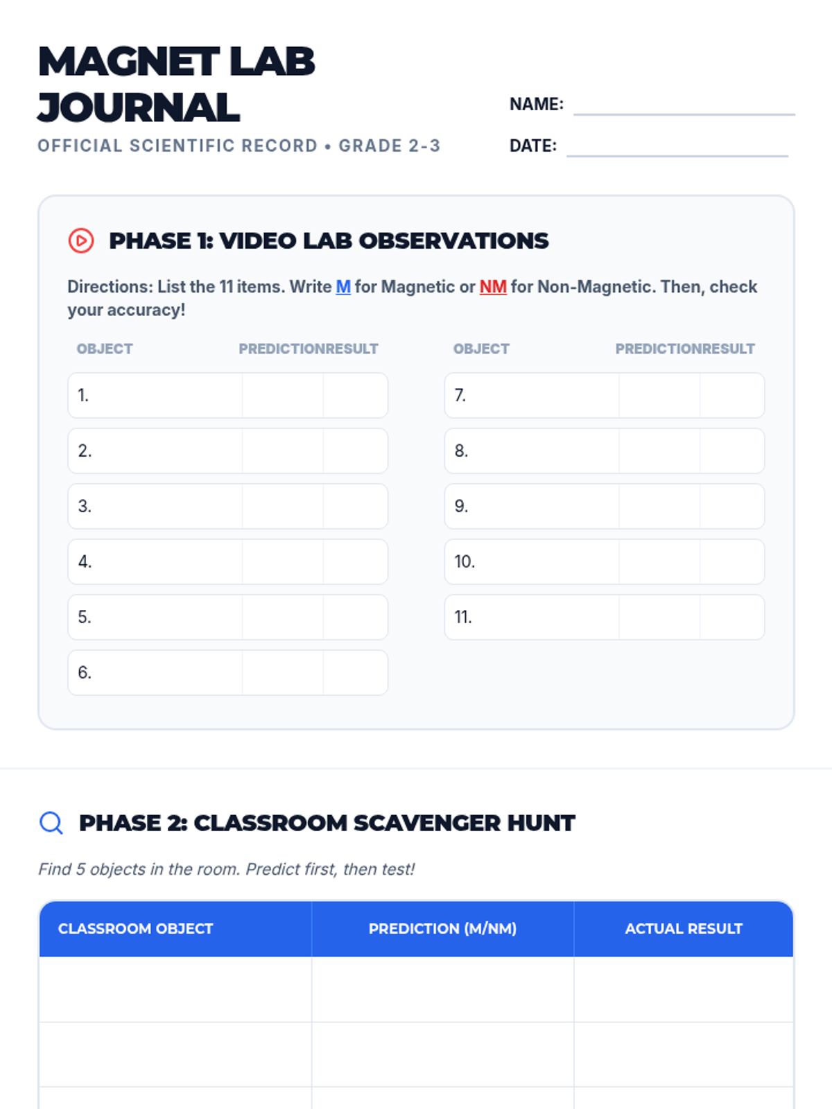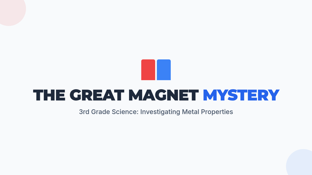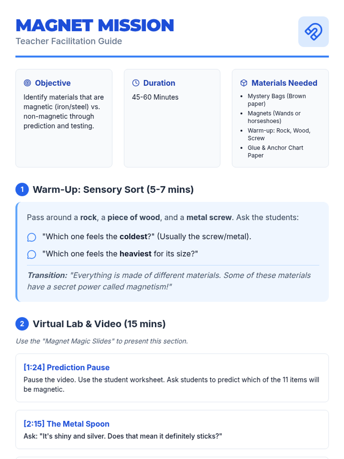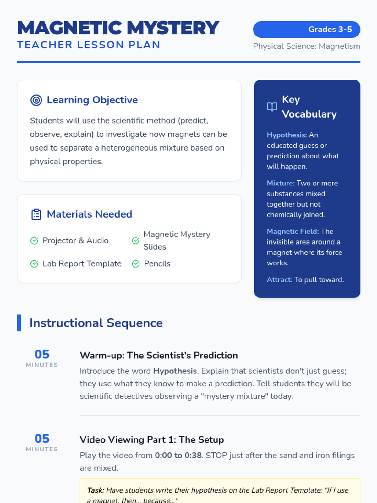 A hands-on introductory lesson on magnetism for 1st-2nd grade students, featuring a virtual lab video, sensory warm-up, and the 'Mystery Bag' investigation. Students learn to distinguish between magnetic and non-magnetic materials with a focus on 'attraction' and iron/steel properties.