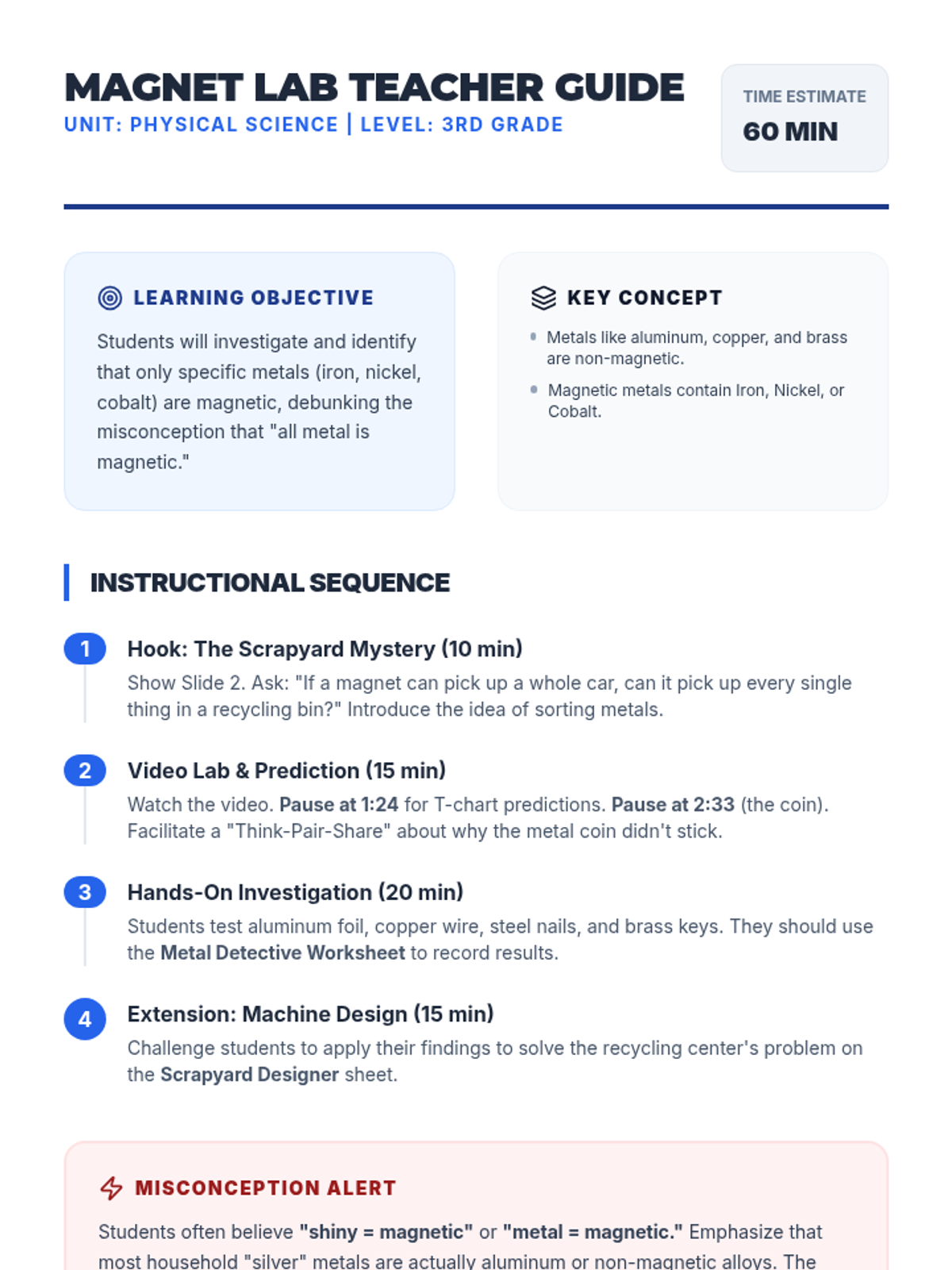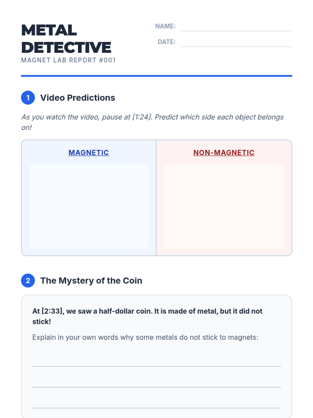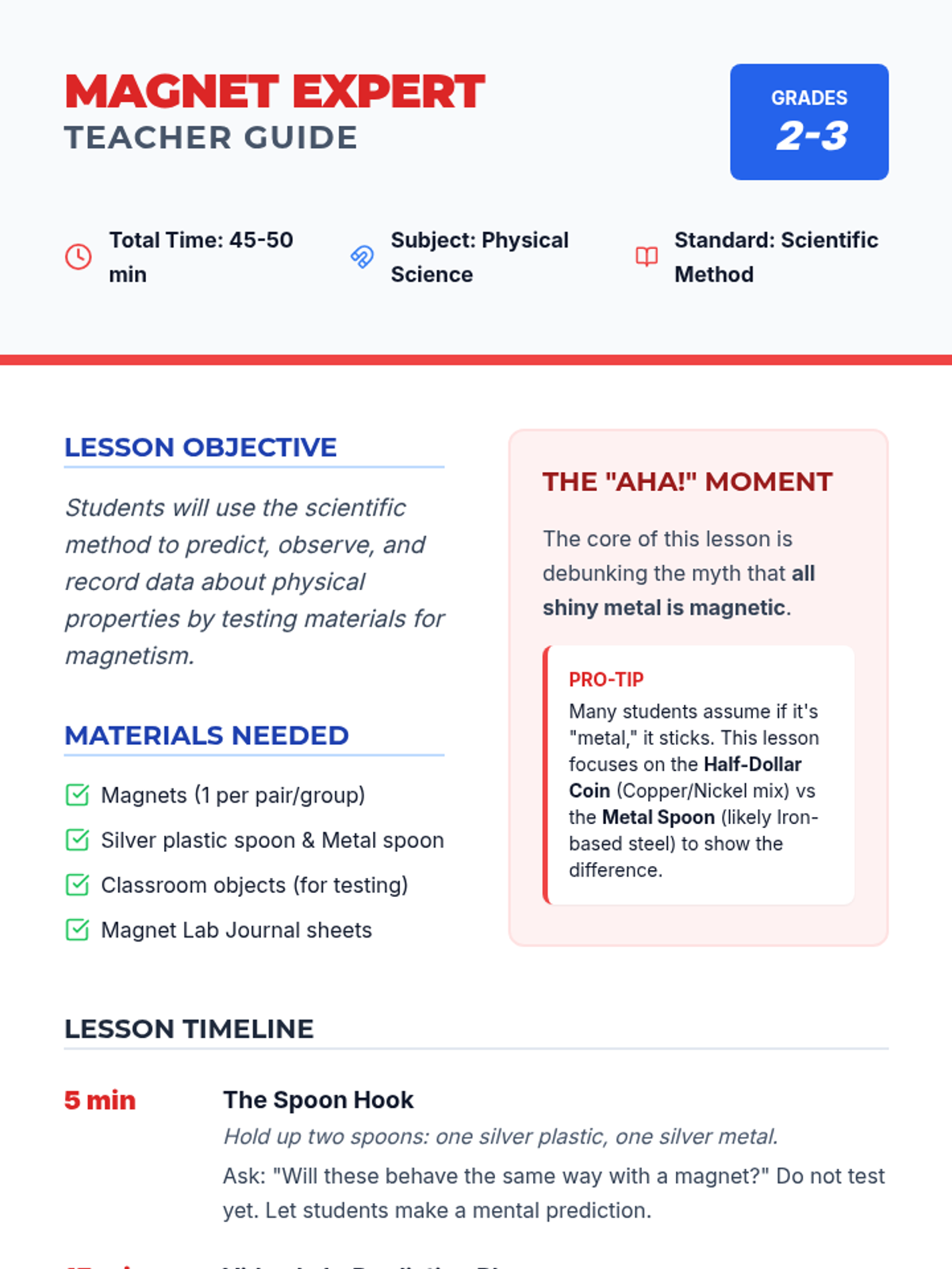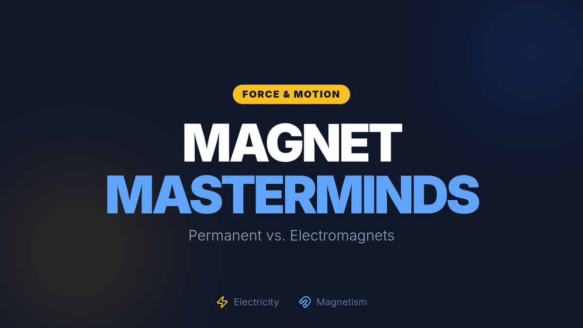 A hands-on introductory lesson on magnetism for 1st-2nd grade students, featuring a virtual lab video, sensory warm-up, and the 'Mystery Bag' investigation. Students learn to distinguish between magnetic and non-magnetic materials with a focus on 'attraction' and iron/steel properties.