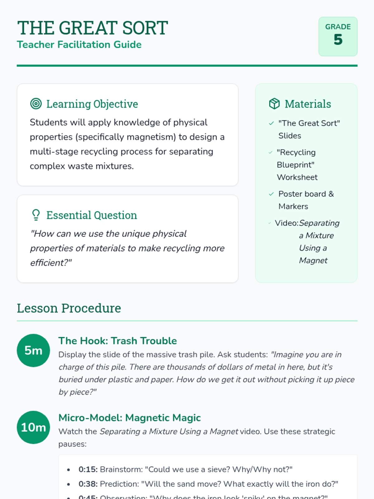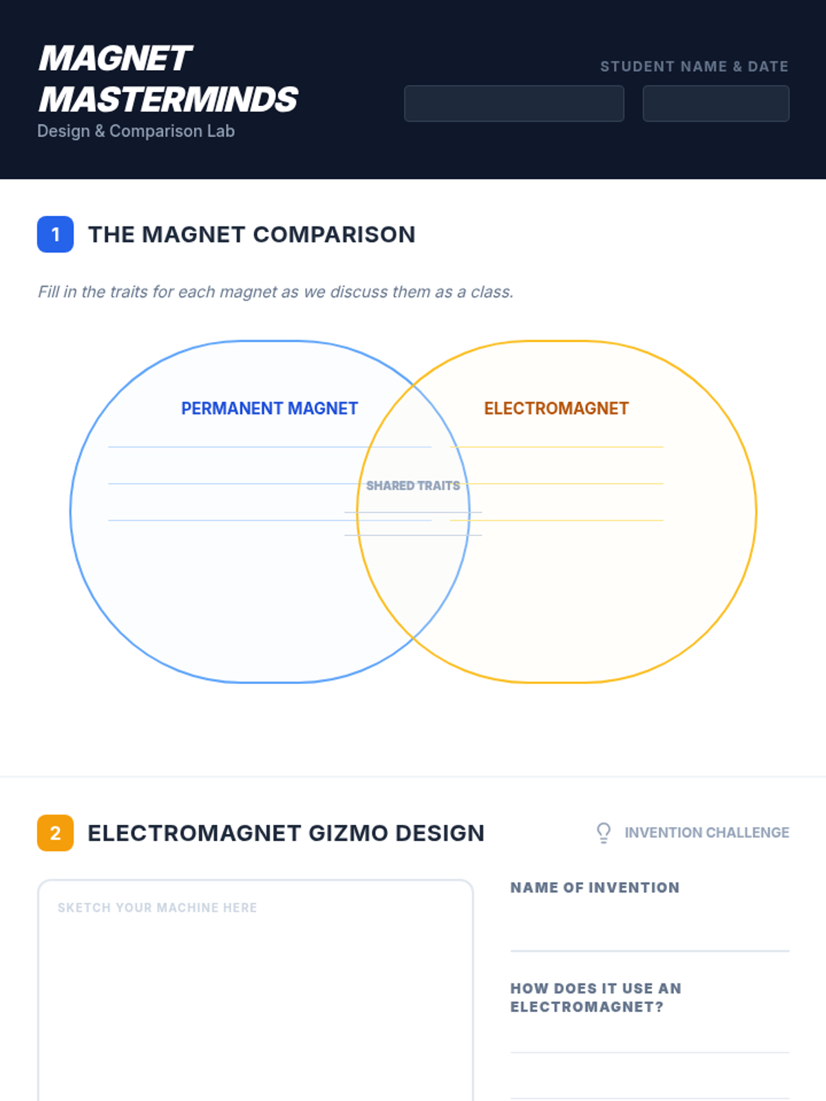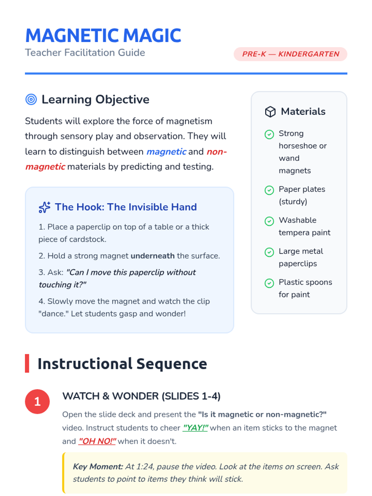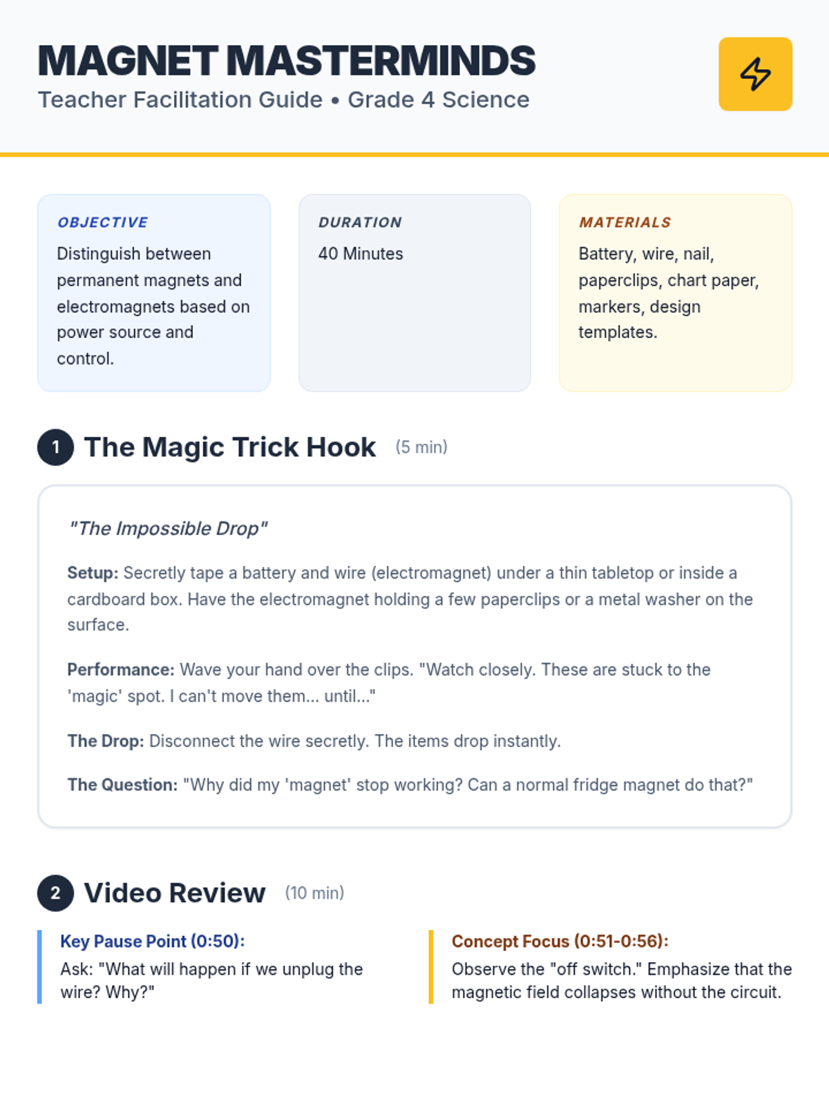 A hands-on introductory lesson on magnetism for 1st-2nd grade students, featuring a virtual lab video, sensory warm-up, and the 'Mystery Bag' investigation. Students learn to distinguish between magnetic and non-magnetic materials with a focus on 'attraction' and iron/steel properties.