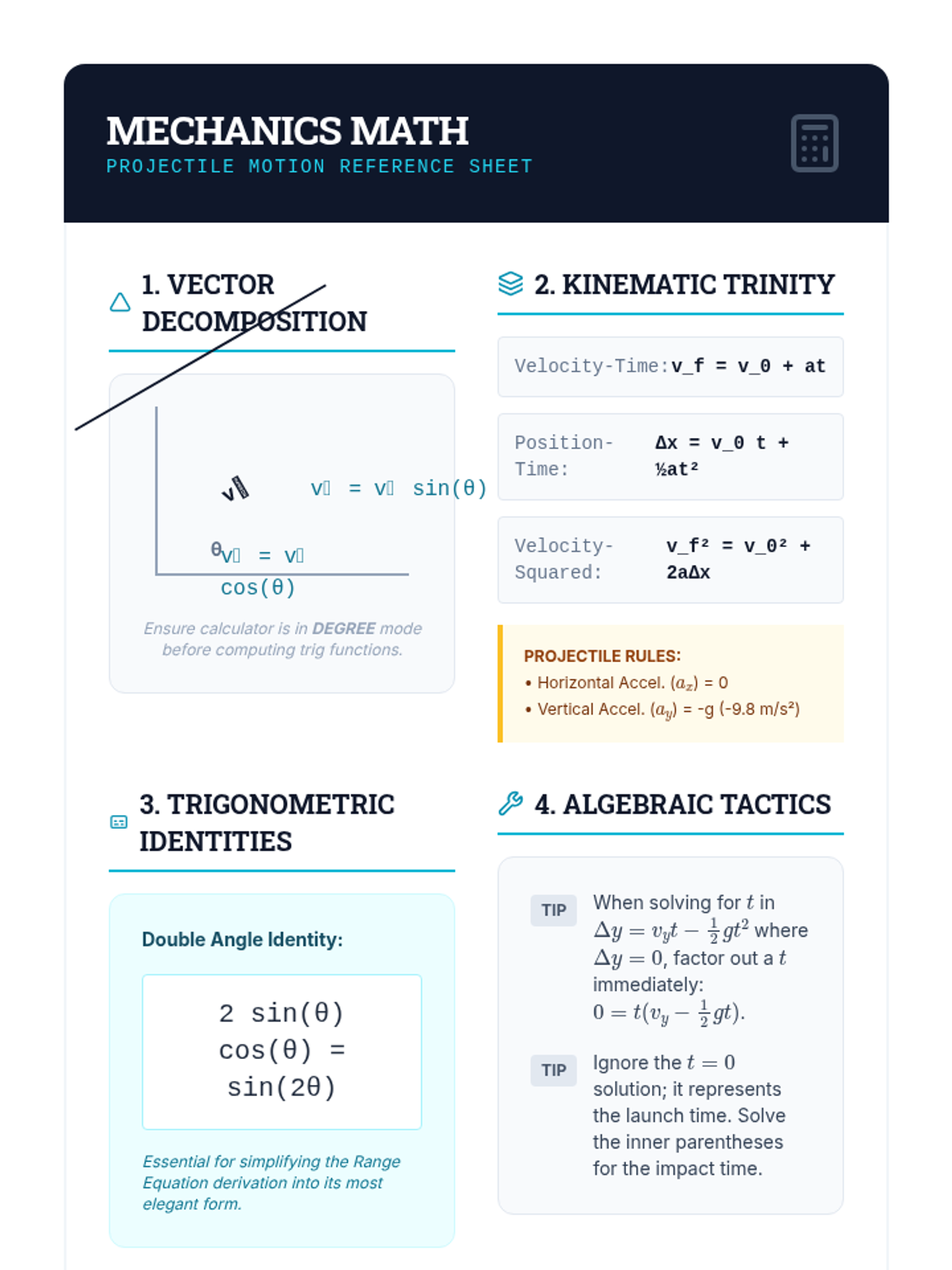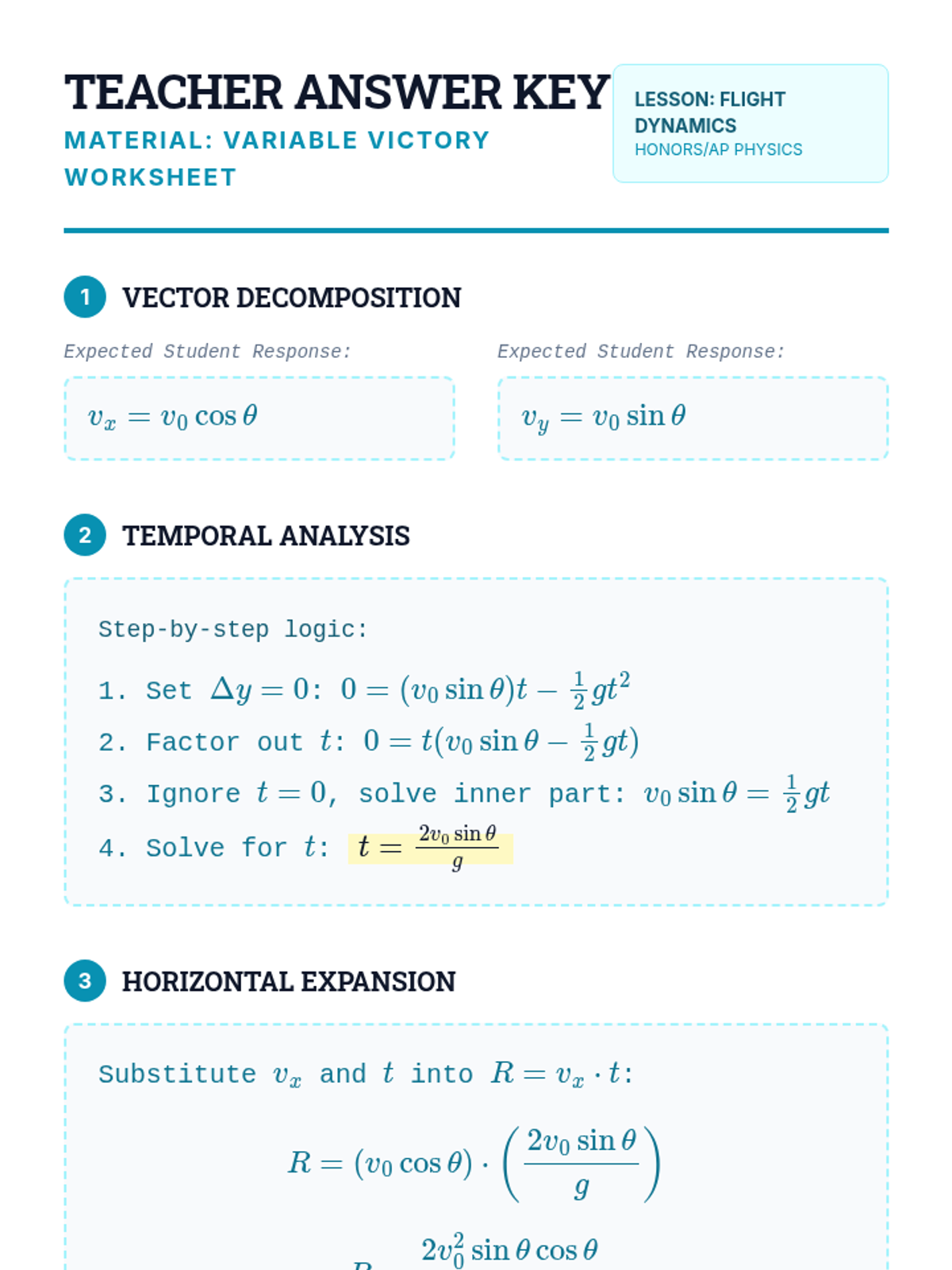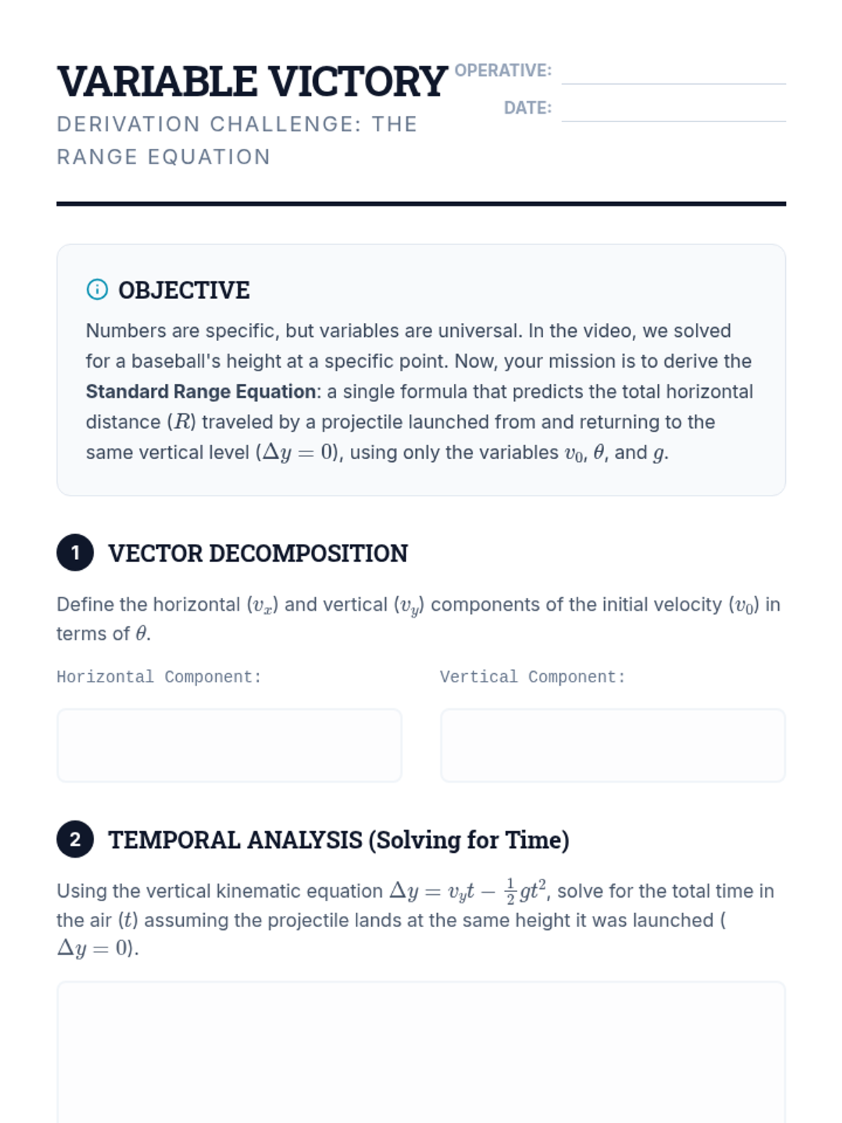 A high-level physics lesson focused on deriving the Range Equation for projectiles using algebraic manipulation and trigonometric identities. Students move beyond numerical solutions to create a universal predictive model.