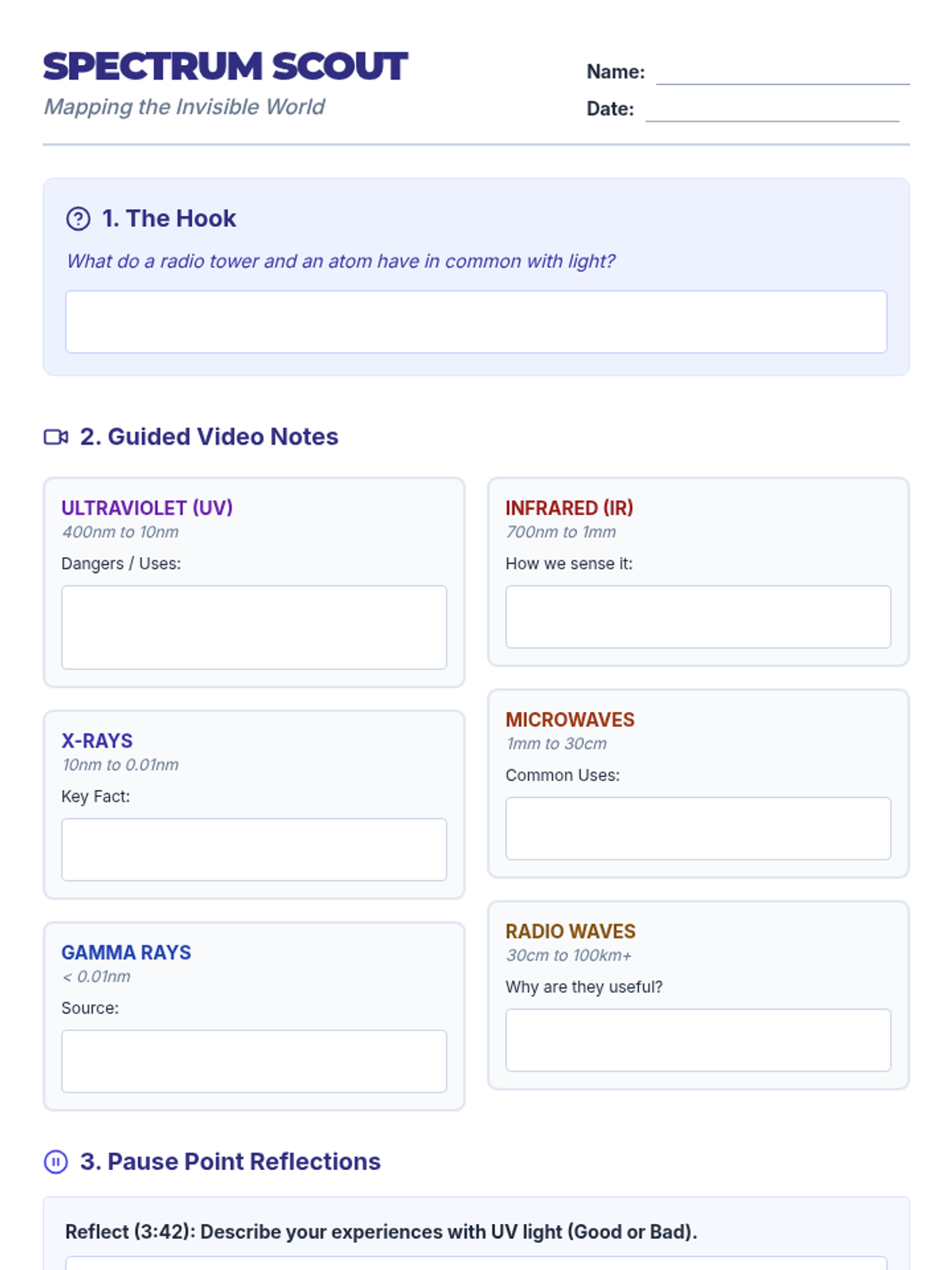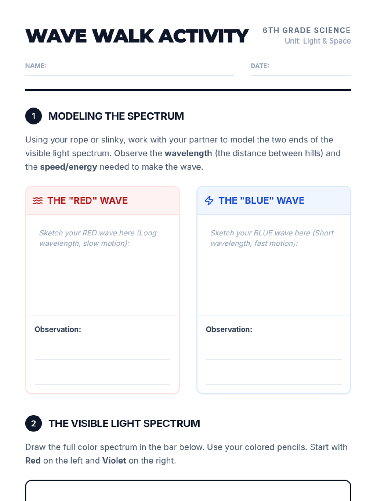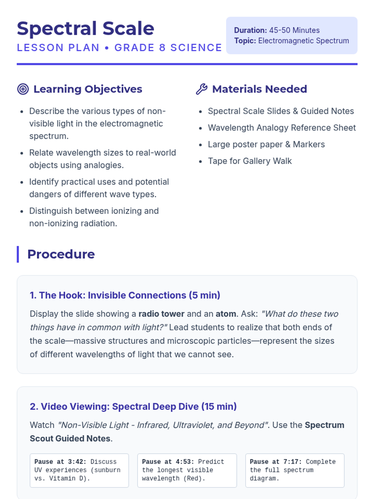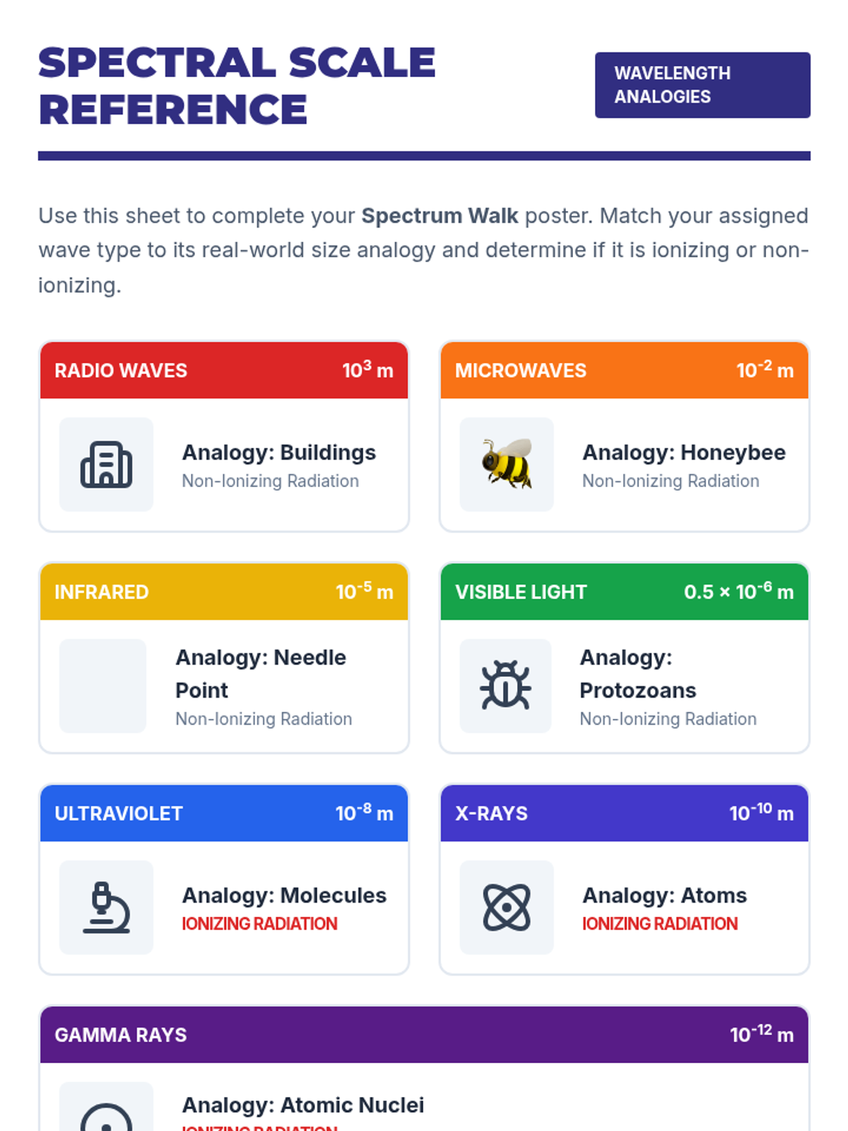 A collaborative 8th-grade science lesson exploring the electromagnetic spectrum through wavelength analogies, video analysis, and a 'Spectrum Walk' project. students map the scale of non-visible light from radio waves to gamma rays.