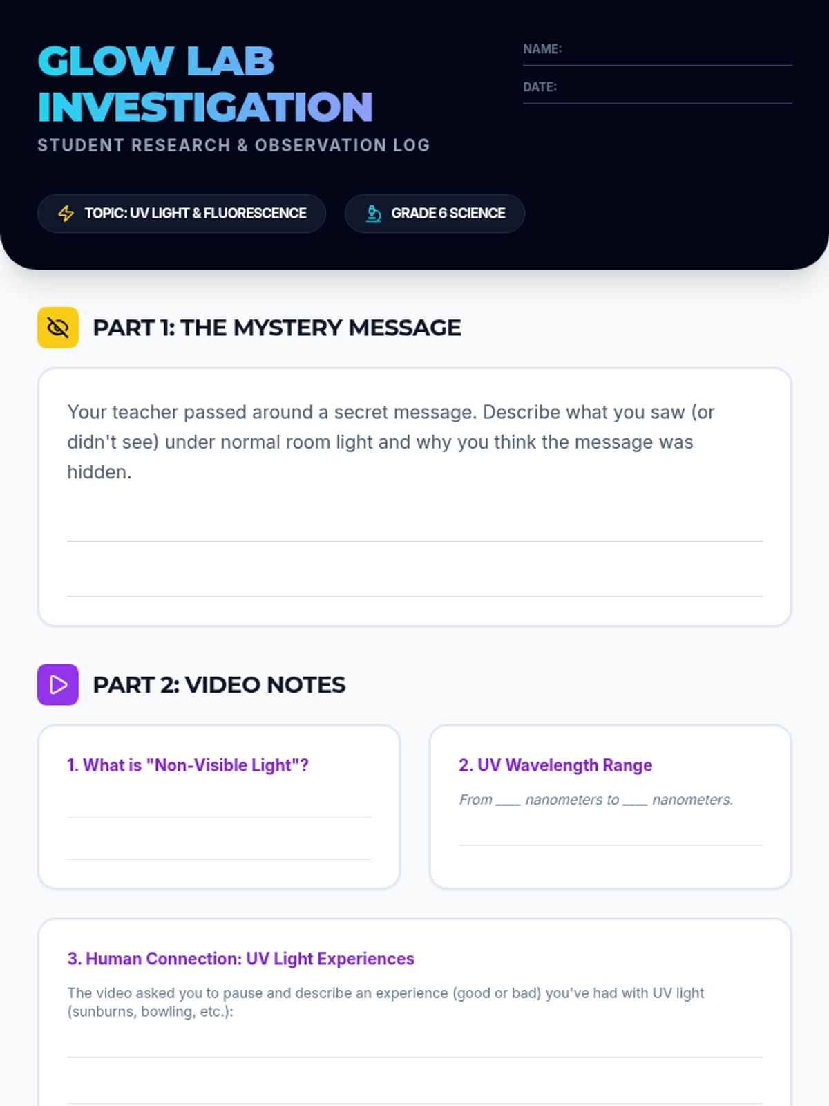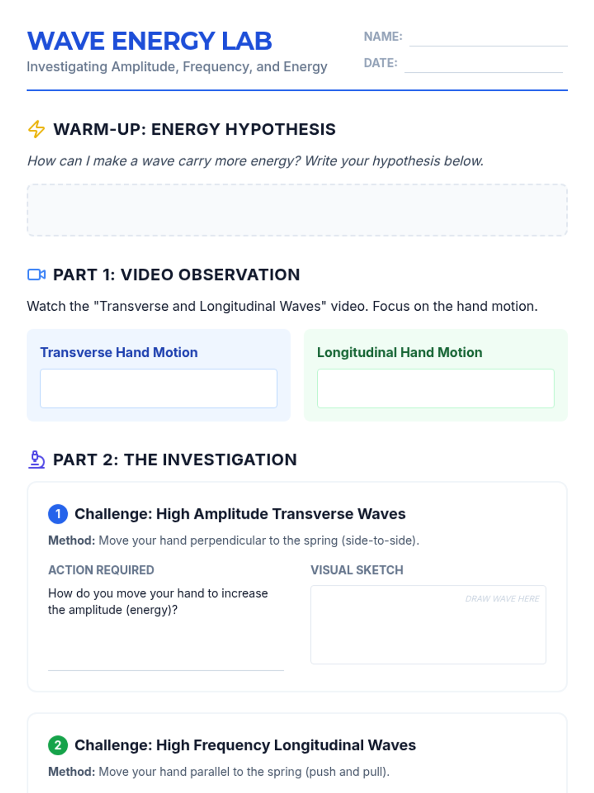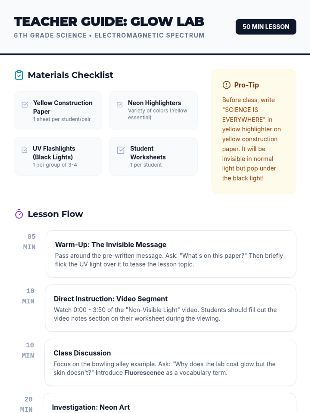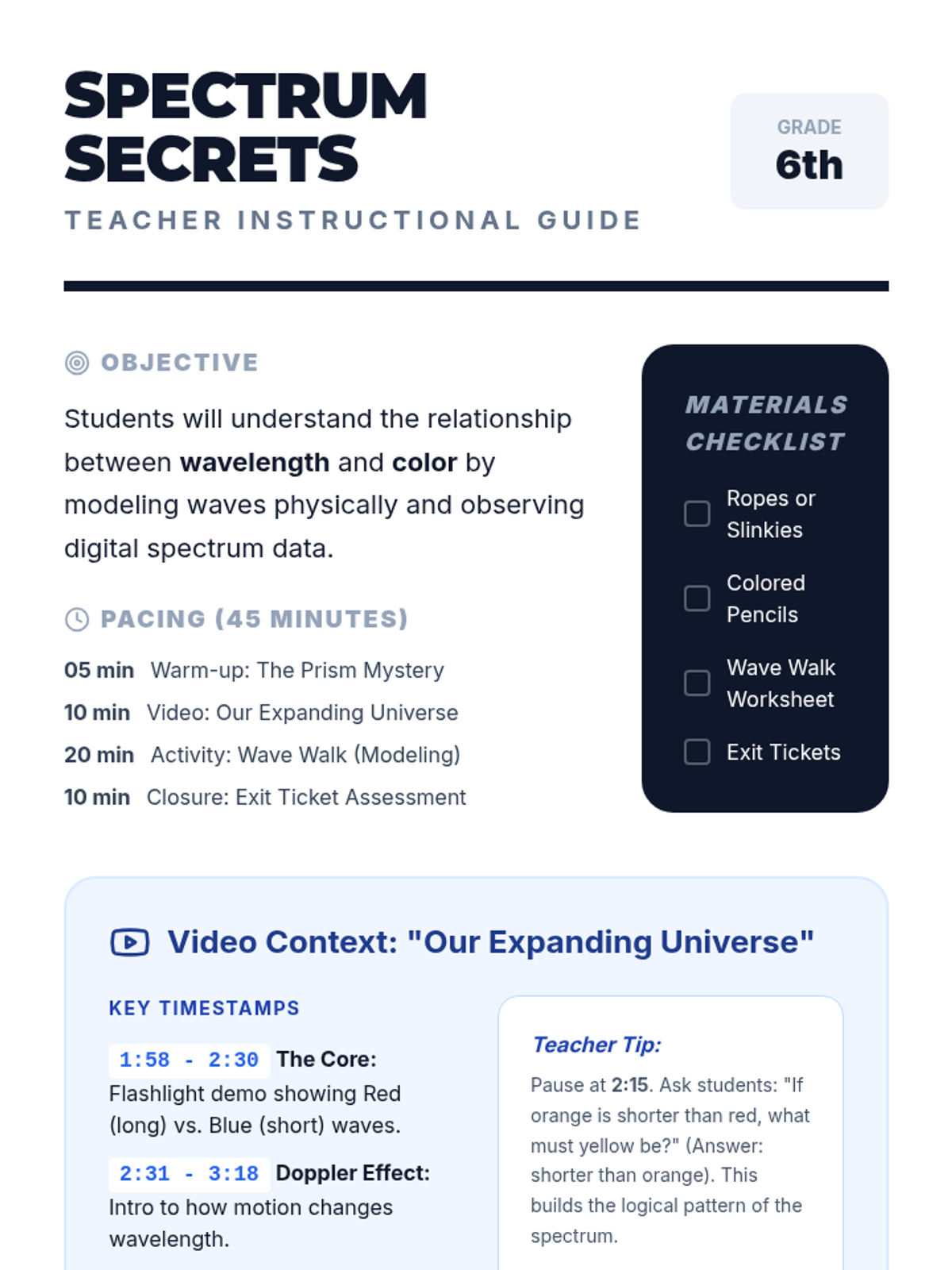 A collaborative 8th-grade science lesson exploring the electromagnetic spectrum through wavelength analogies, video analysis, and a 'Spectrum Walk' project. students map the scale of non-visible light from radio waves to gamma rays.