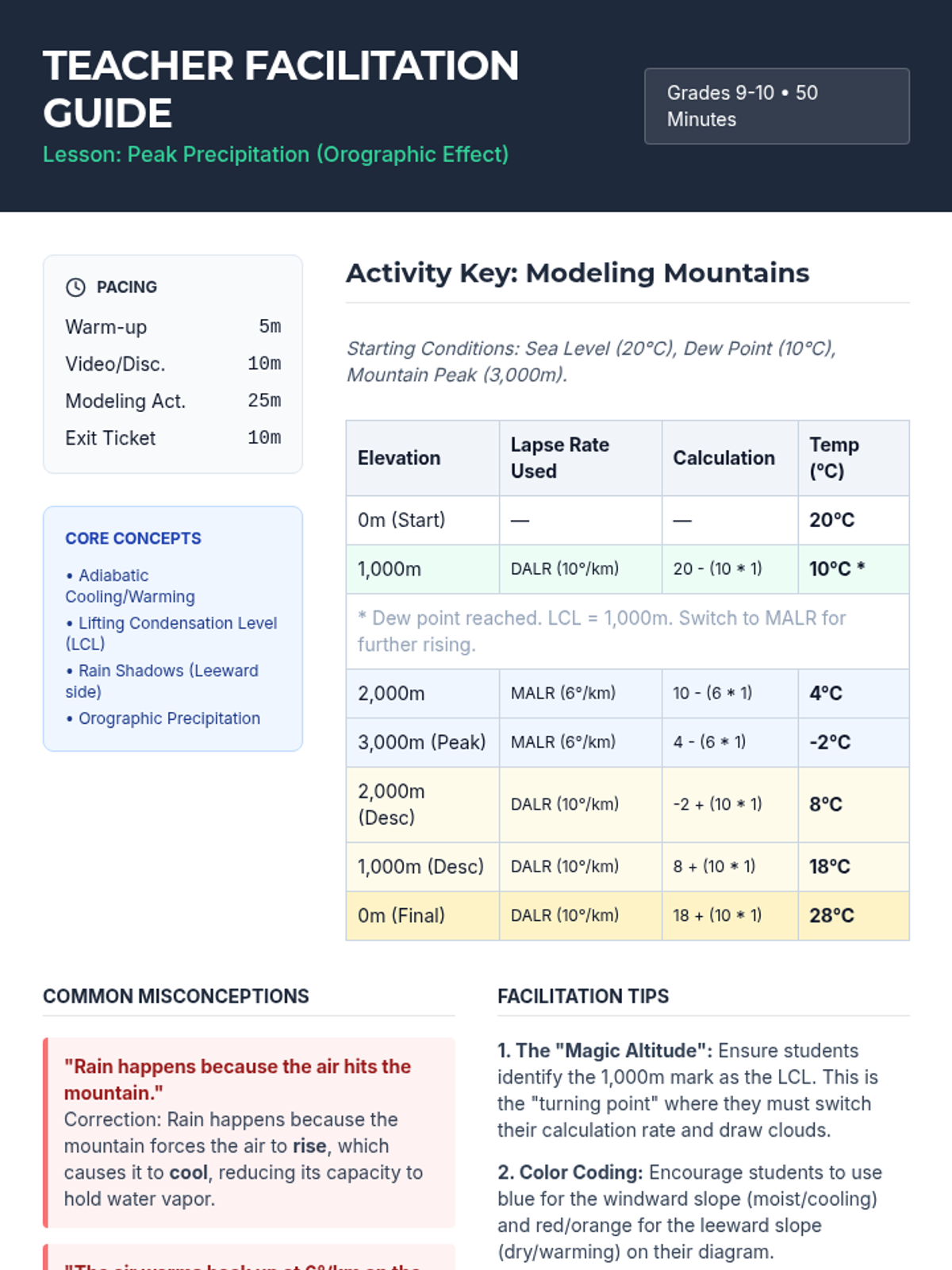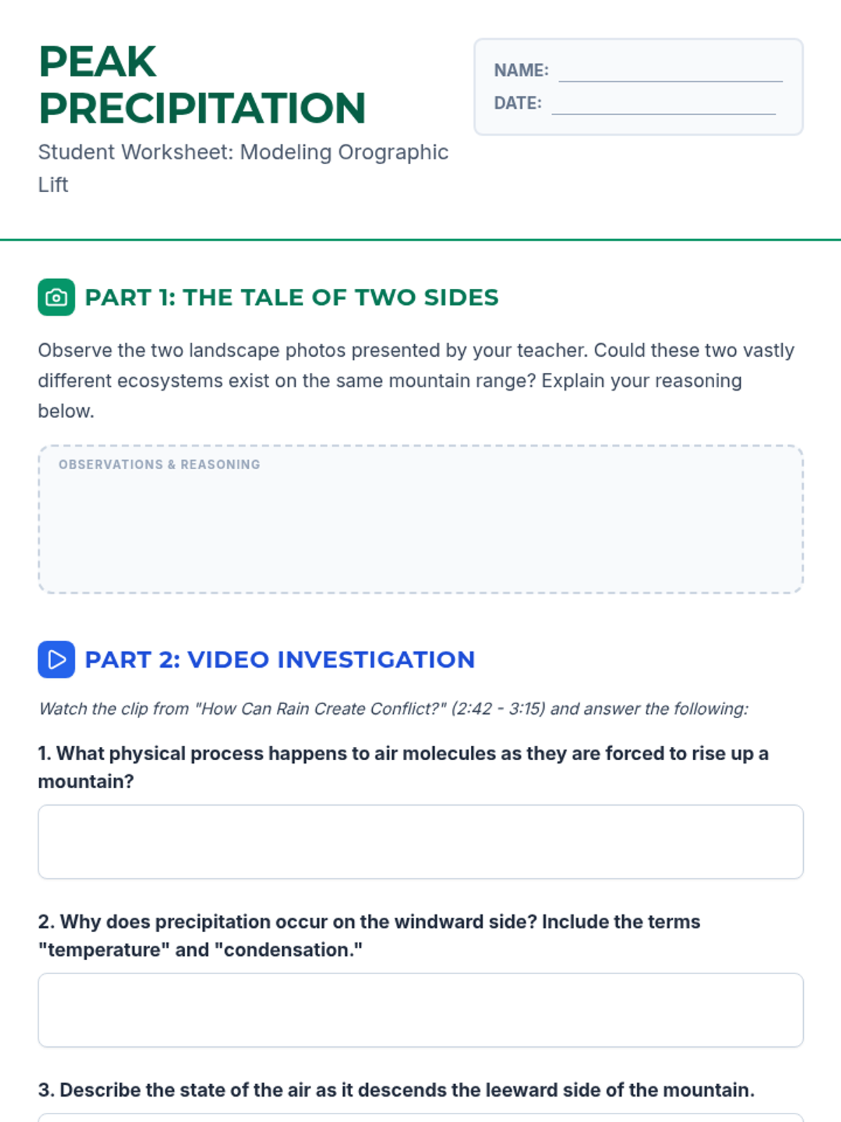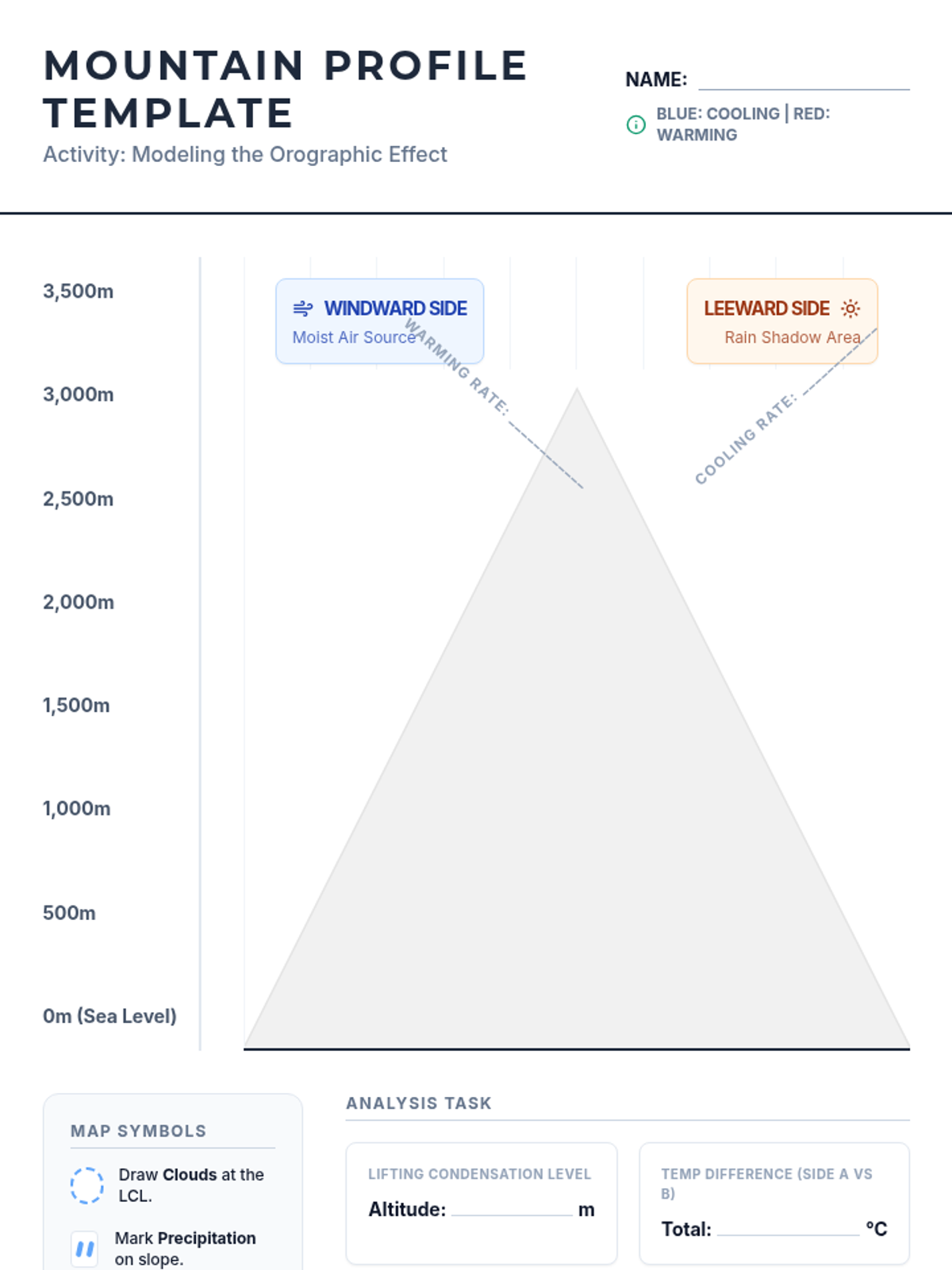 Students explore the orographic effect and rain shadows through a mix of video analysis and mathematical modeling. They calculate temperature changes using lapse rates to predict where precipitation and deserts form on a mountain range.