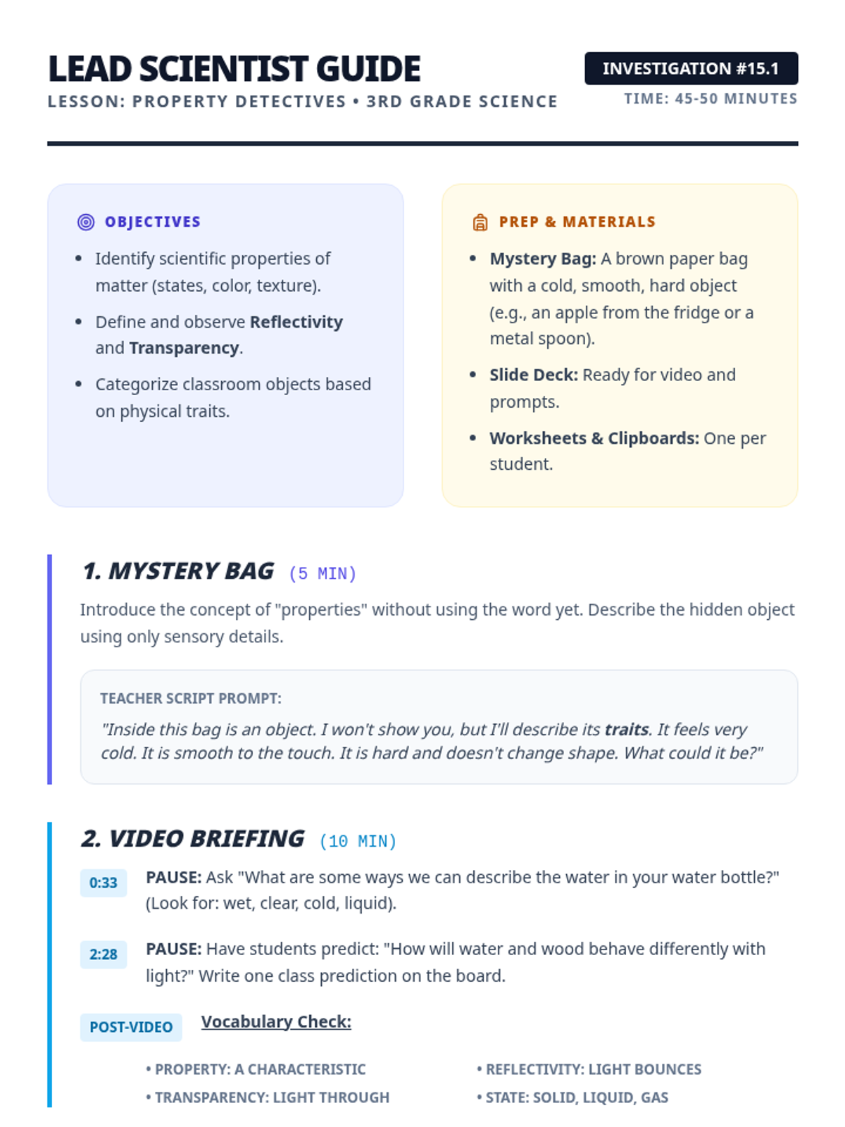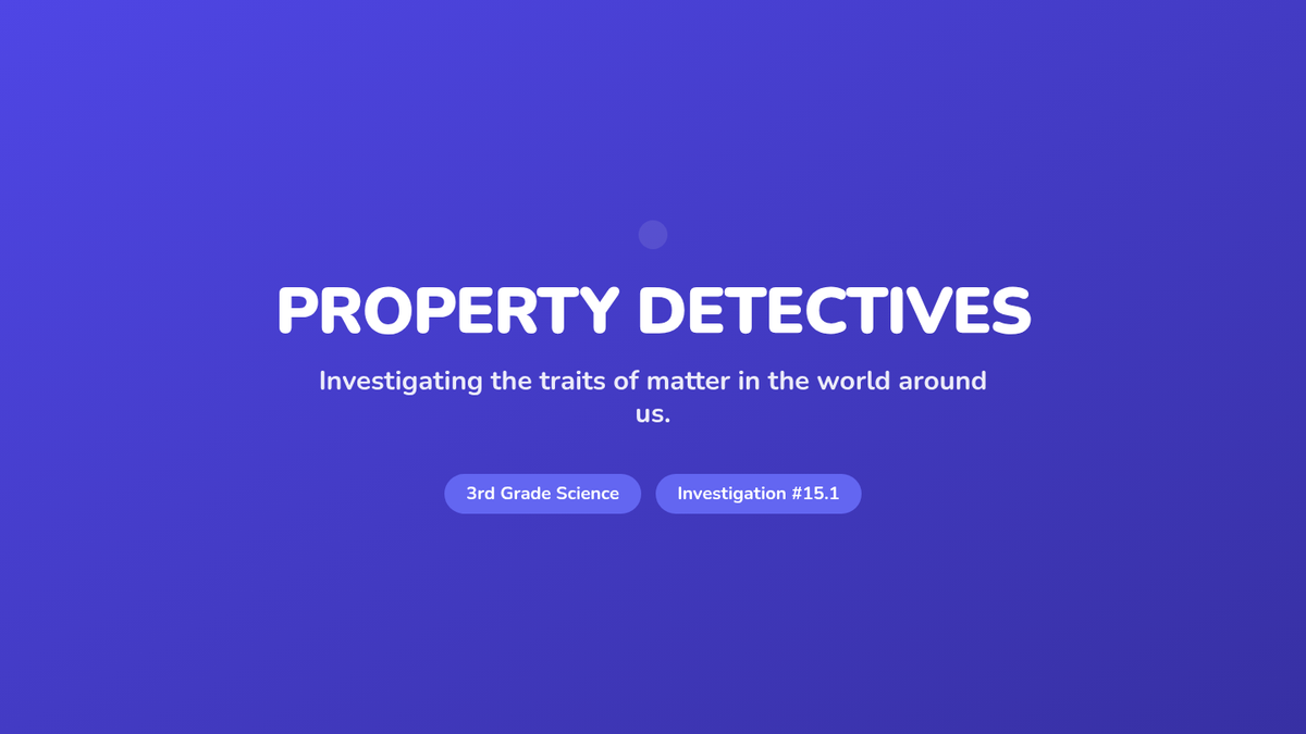 A hands-on 3rd-grade science lesson where students become 'Property Detectives' to identify and describe matter using scientific traits like reflectivity, transparency, and states of matter.