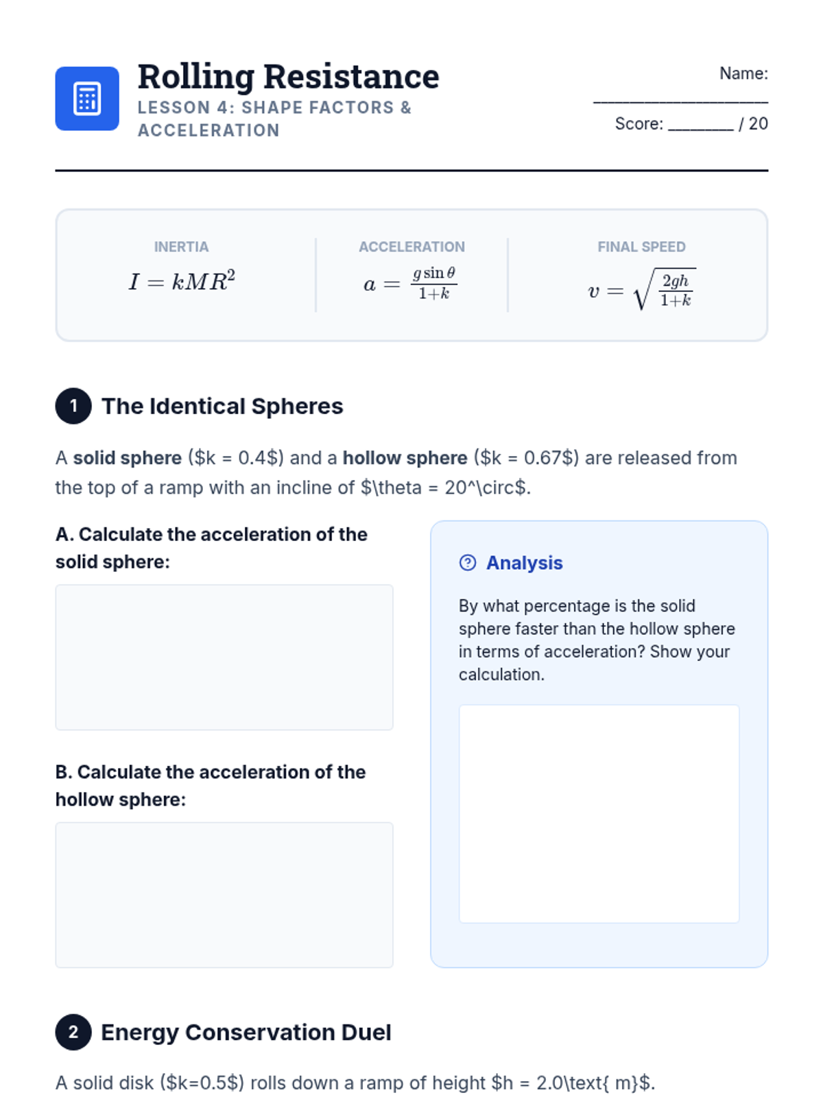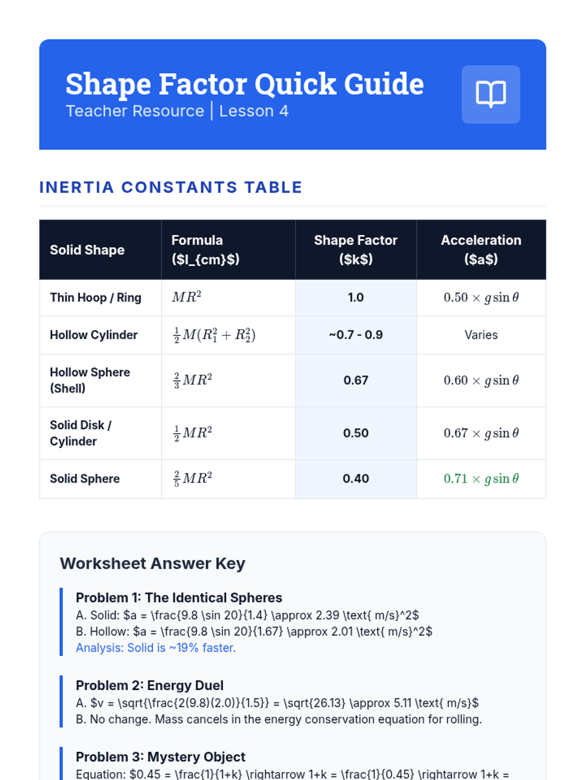 Students calculate 'shape factors' for various geometric solids and analyze how these constants determine rotational acceleration and energy conservation.