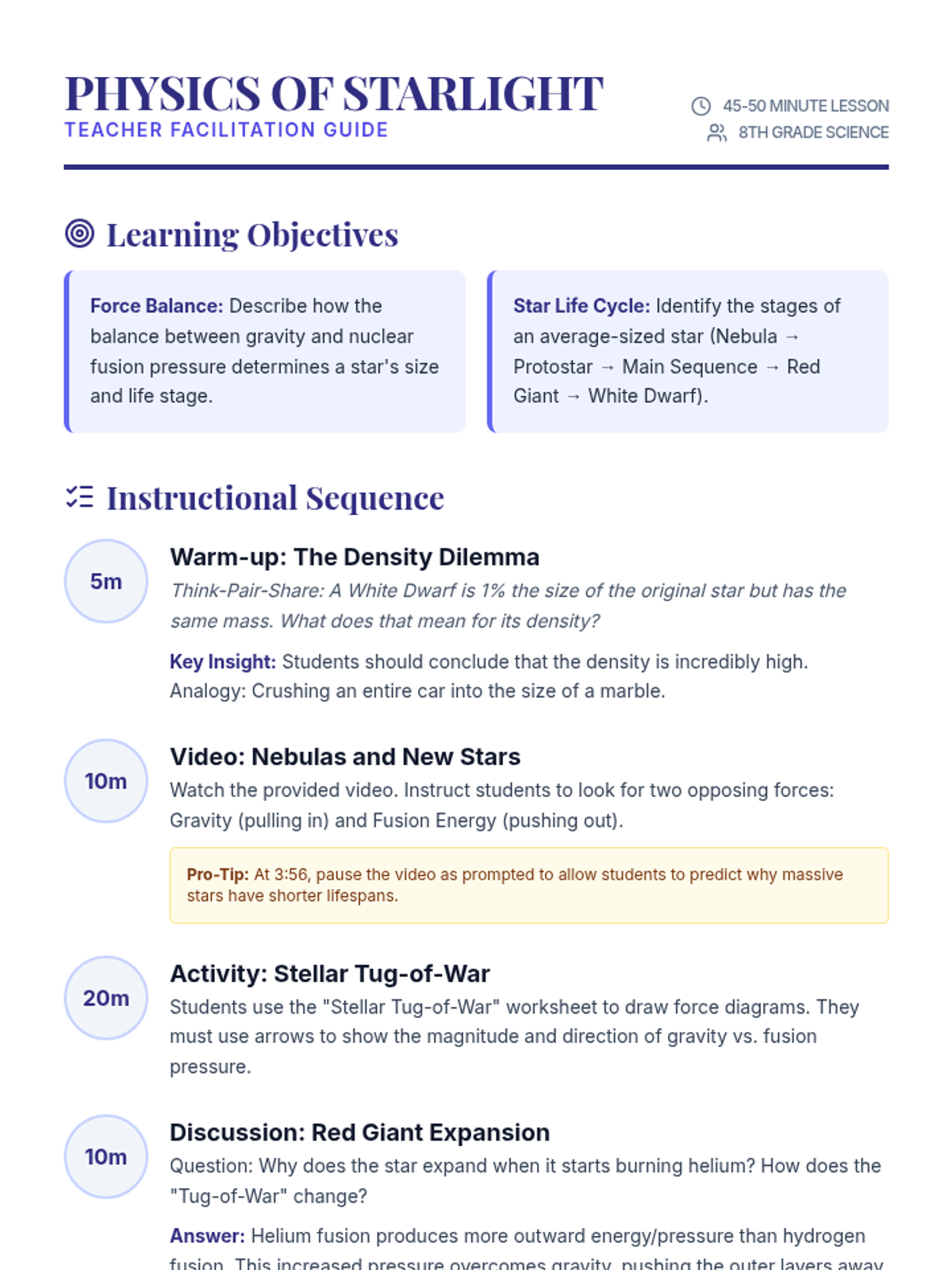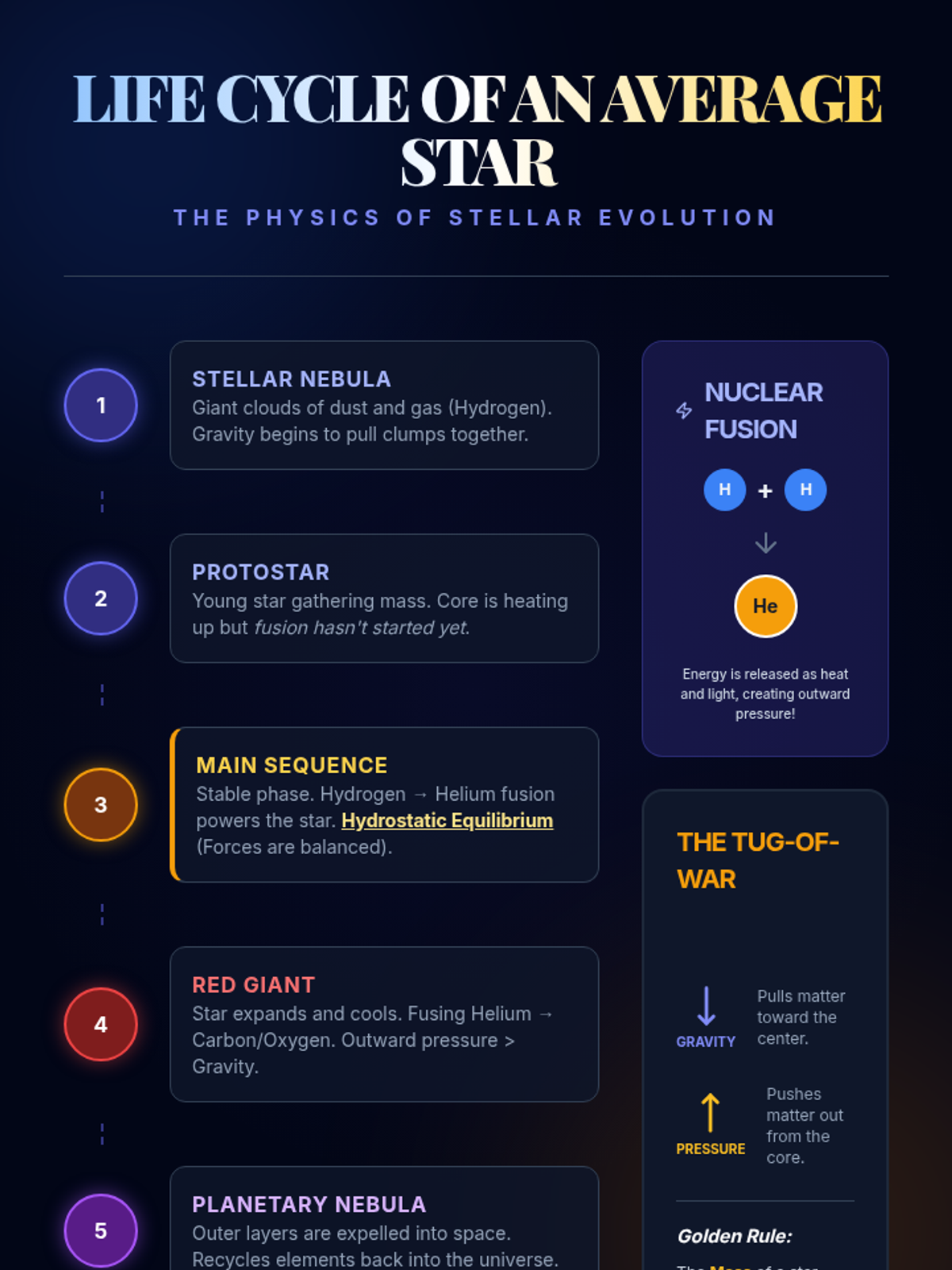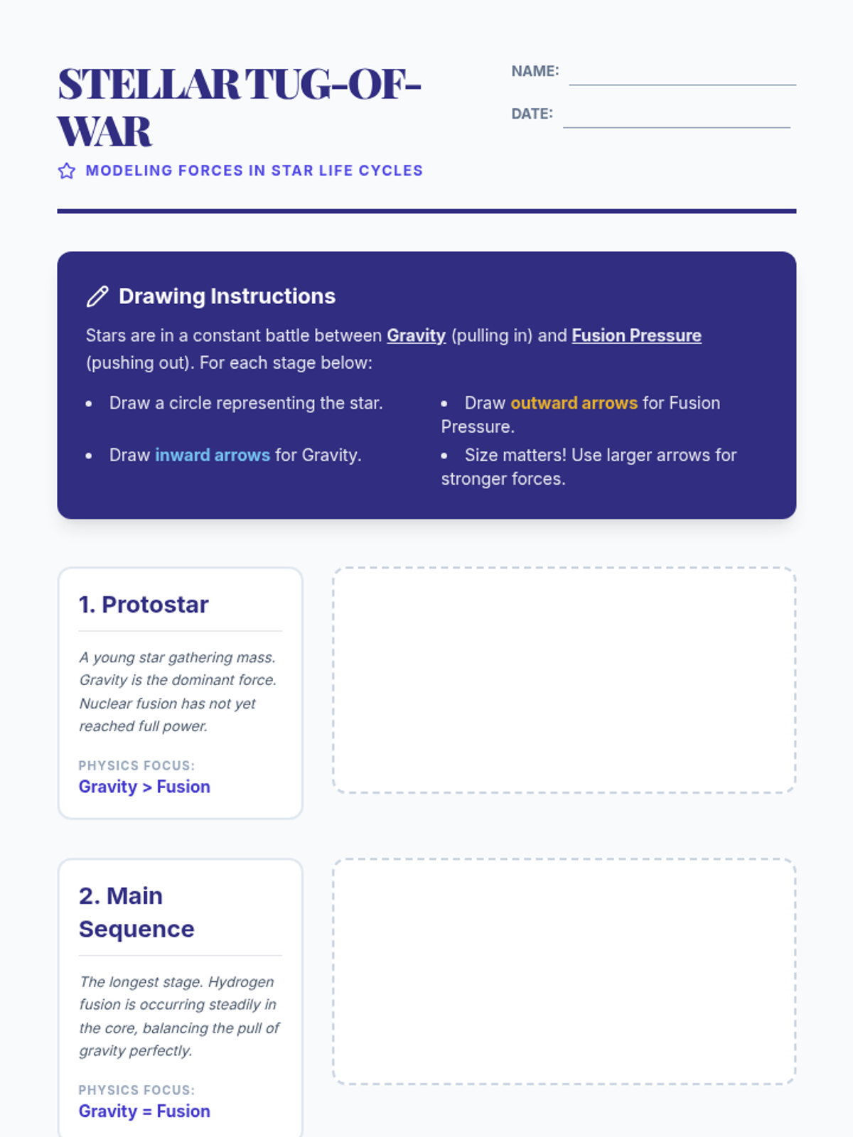 Explore the life cycle of average-sized stars through the lens of physics, focusing on the battle between gravity and nuclear fusion. Students will visualize stellar stages using 'Tug-of-War' diagrams to understand how forces shape the universe.
