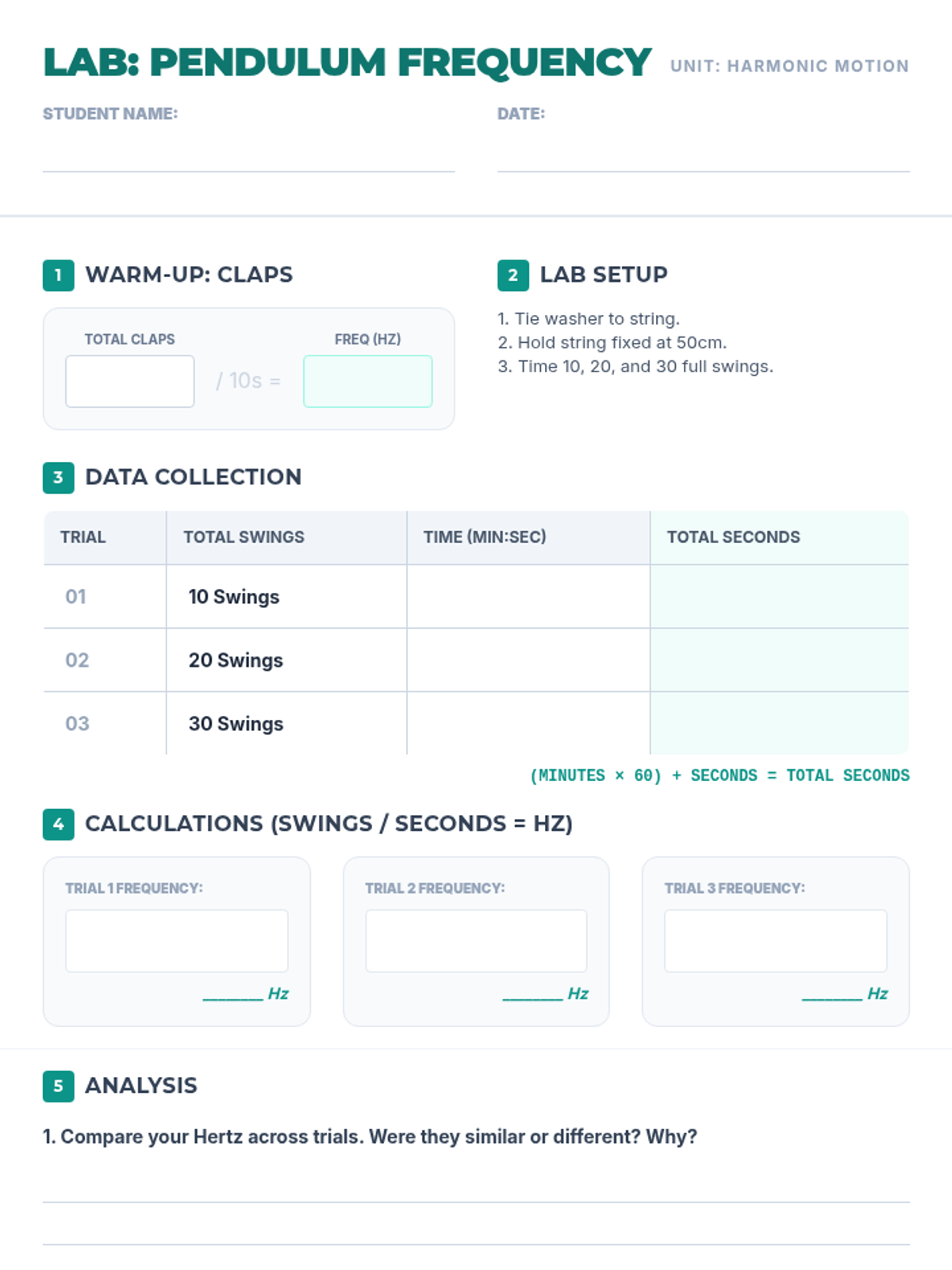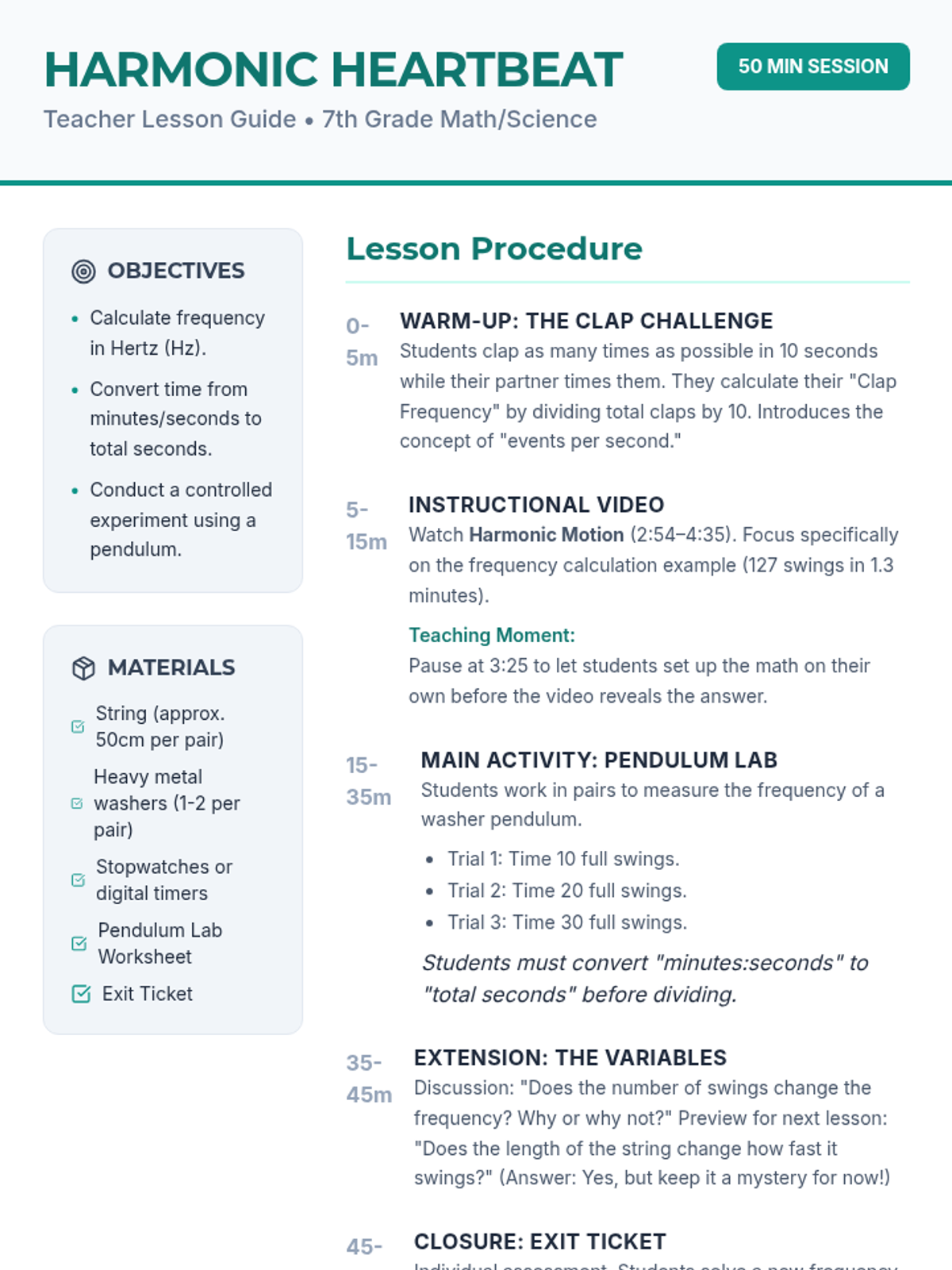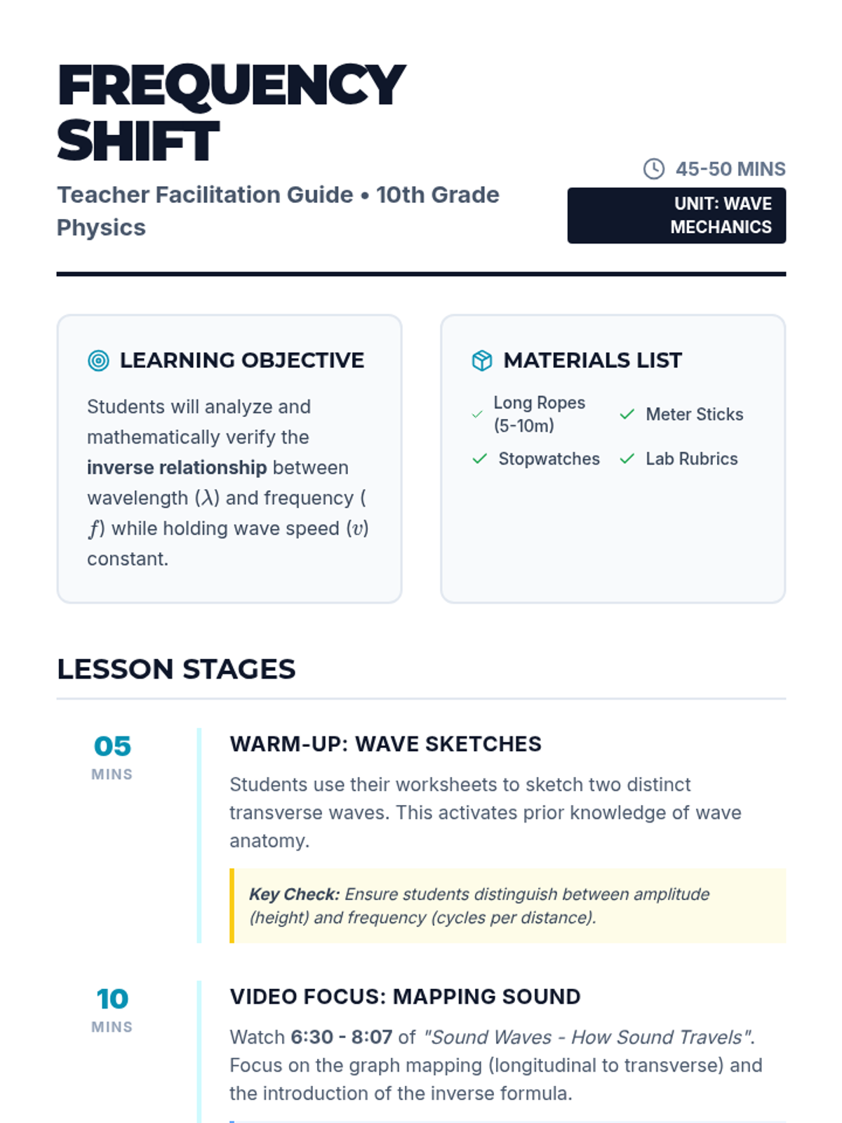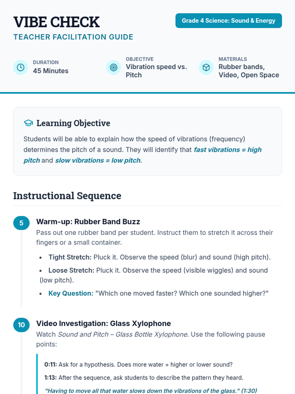 A hands-on inquiry lesson exploring how the speed of vibrations (frequency) affects the pitch of a sound using rubber bands, water bottles, and kinesthetic movement.
