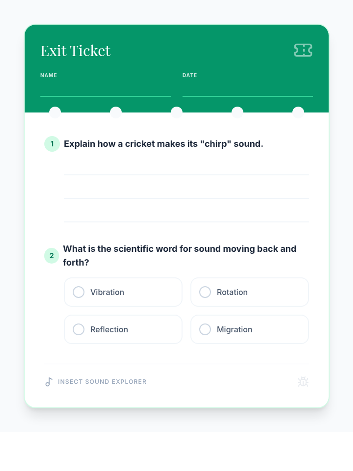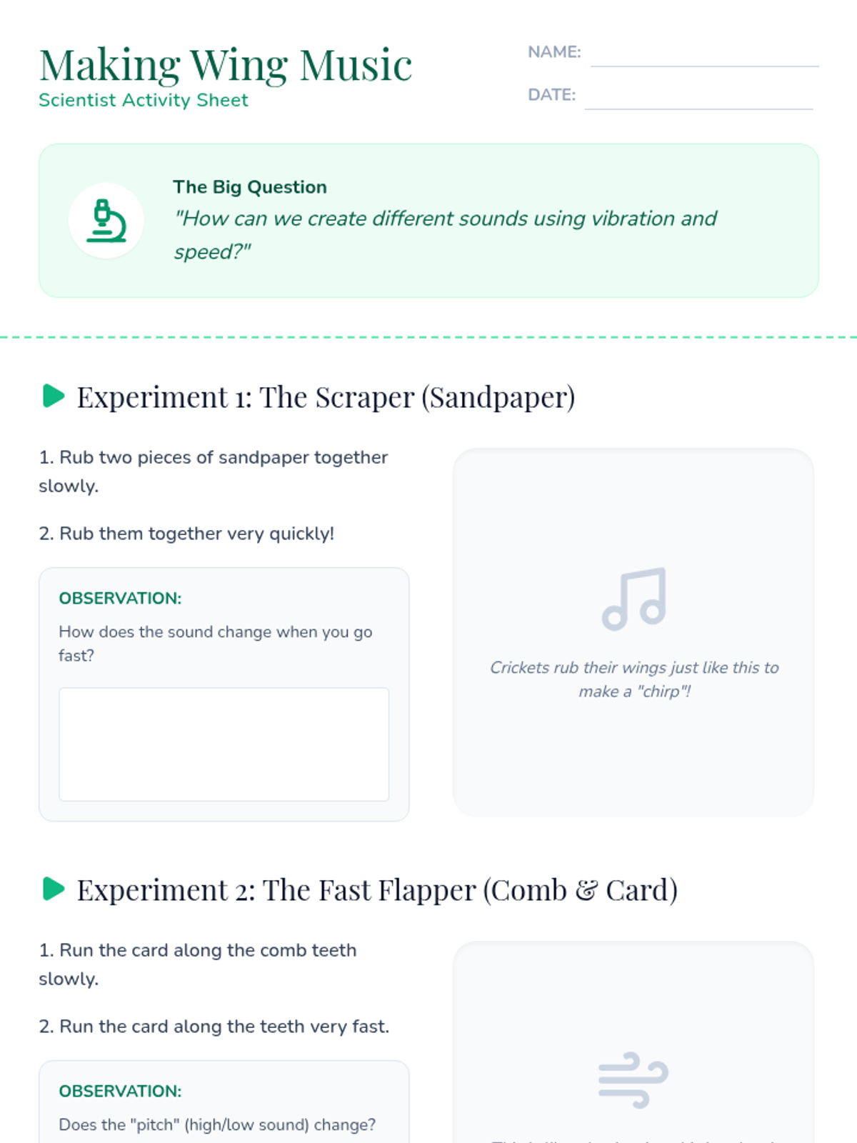 A hands-on investigation into how insects produce sound through vibration, featuring a video-led discussion and a tactile 'Wing Music' experiment using sandpaper and combs.