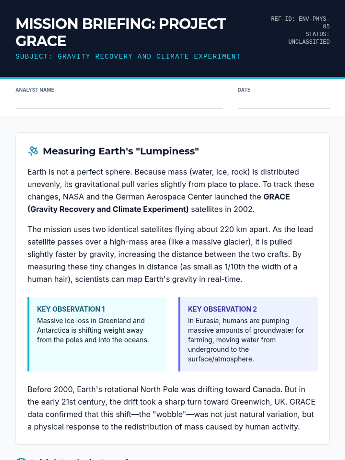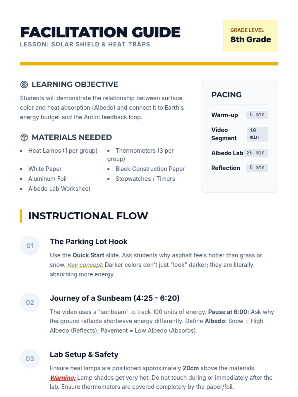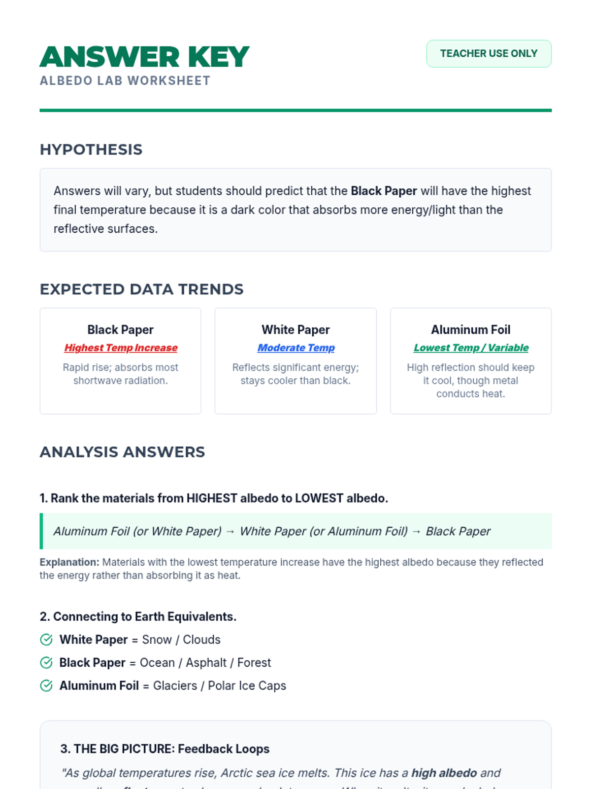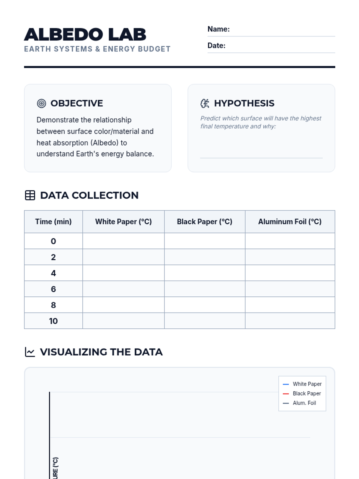 Students explore the concept of Albedo through a hands-on lab and a 'Thought Bubble' video segment, connecting surface reflectivity to Earth's overall energy budget and climate change.