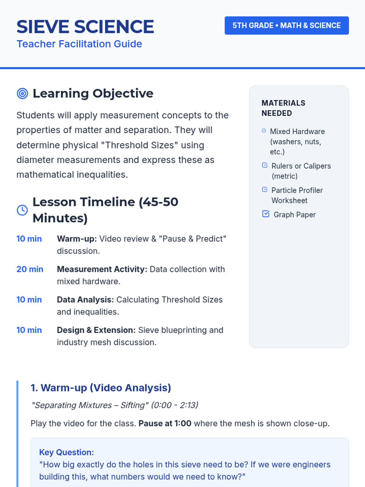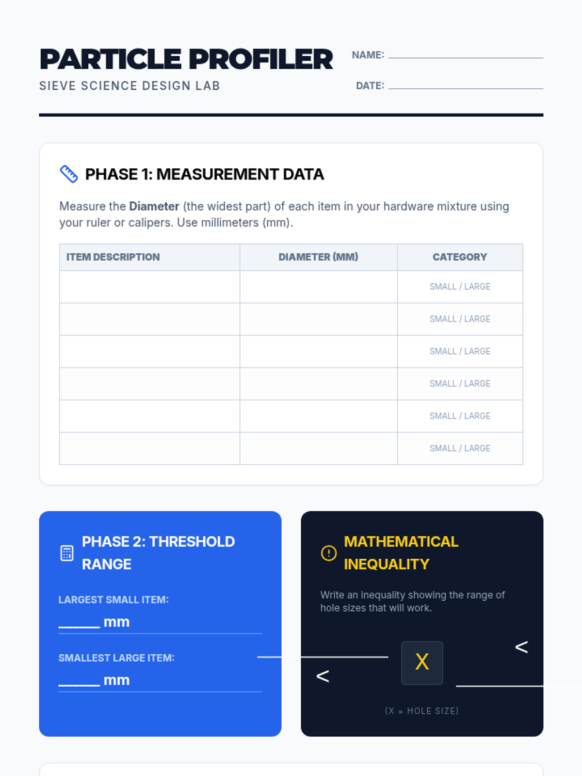 A 5th-grade math and science lesson where students measure mixed hardware to determine the 'Threshold Size' for a sieve, applying concepts of diameter and inequalities to physical properties of matter.