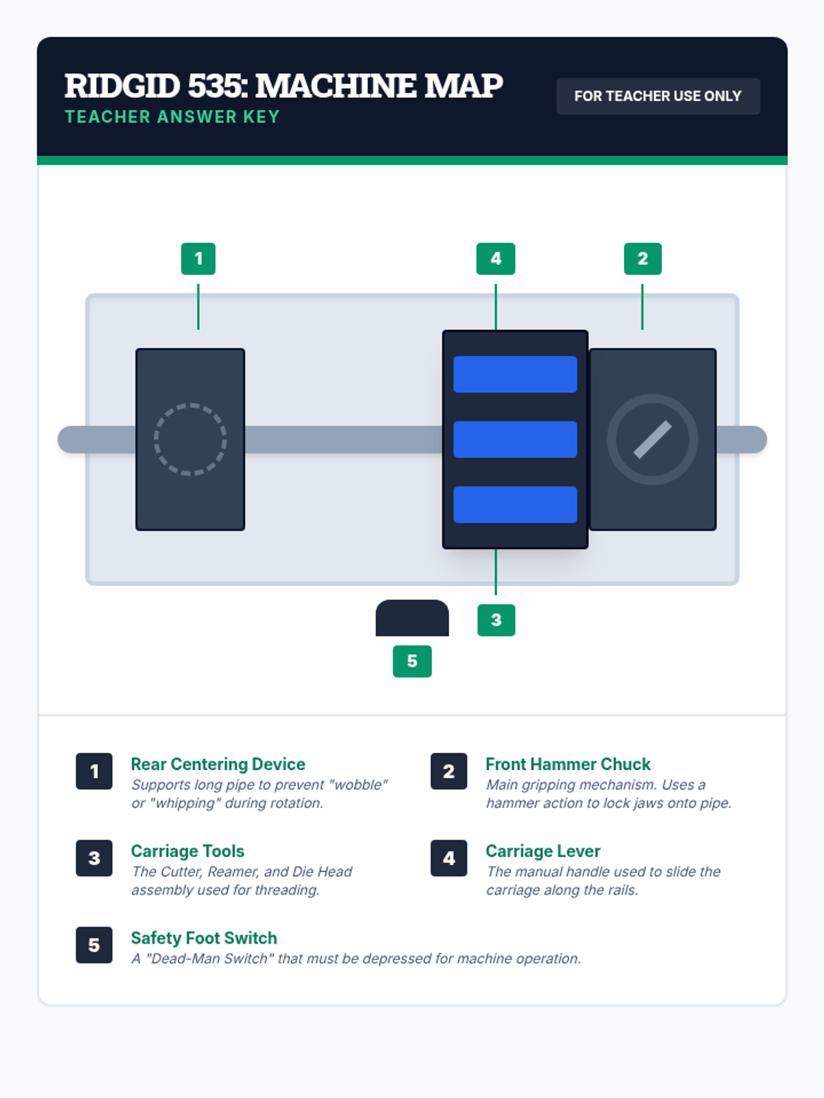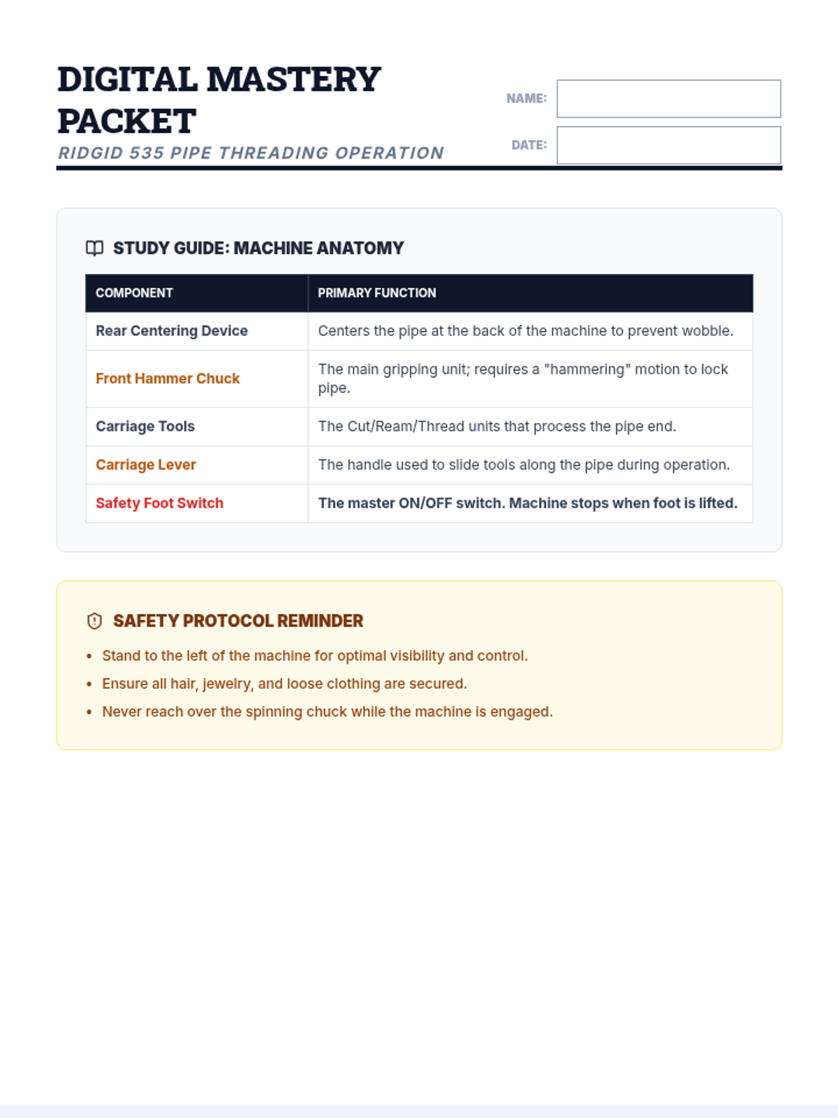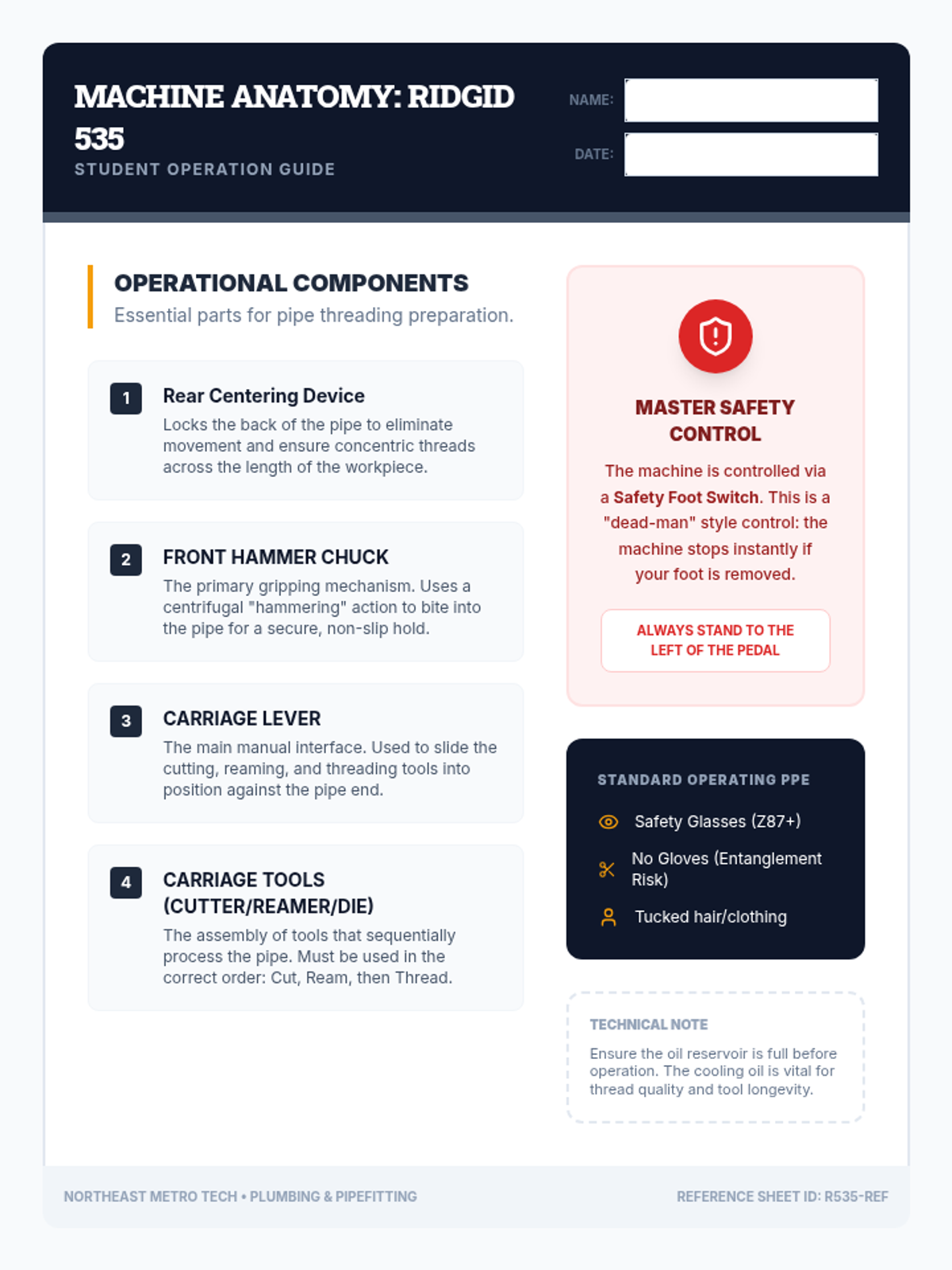 A 10-minute introductory lesson for 10th-grade students on the safe and basic operation of the Ridgid 535 pipe threader, focusing on safety protocols and component identification.