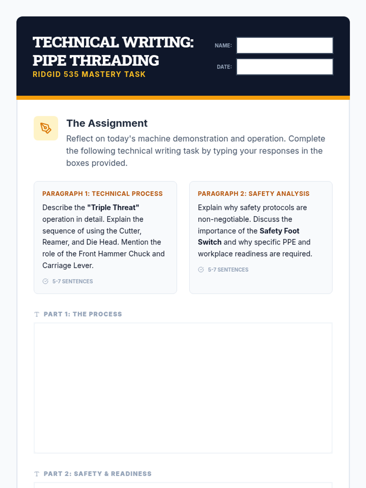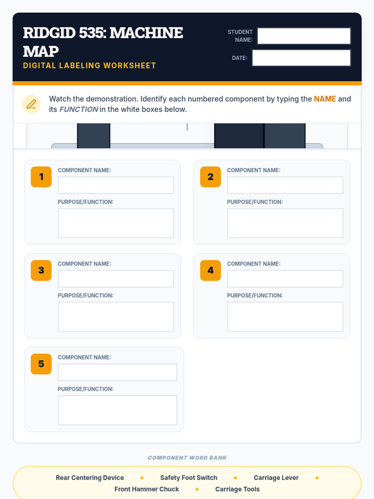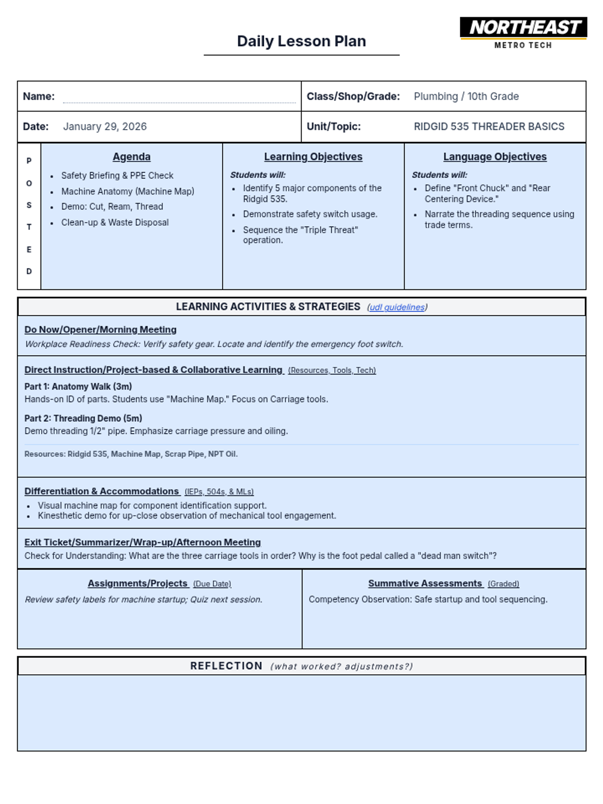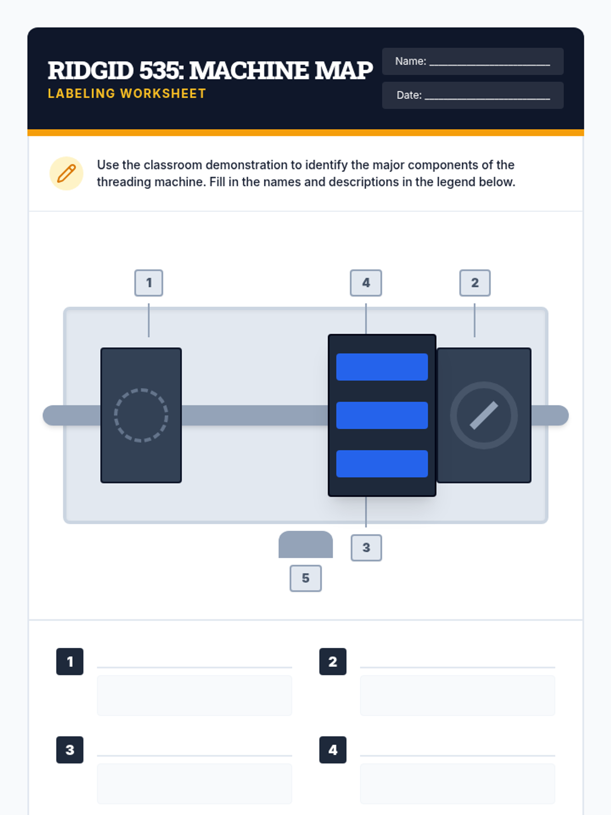 A 10-minute introductory lesson for 10th-grade students on the safe and basic operation of the Ridgid 535 pipe threader, focusing on safety protocols and component identification.