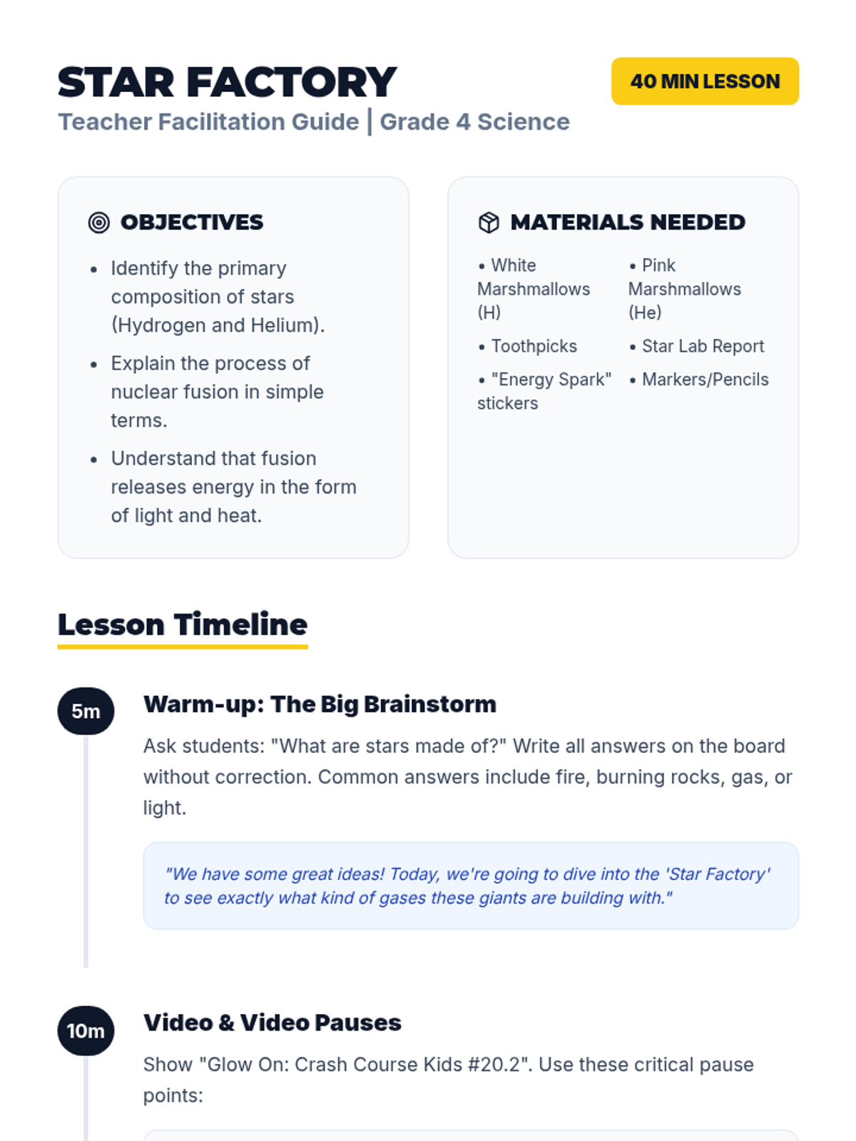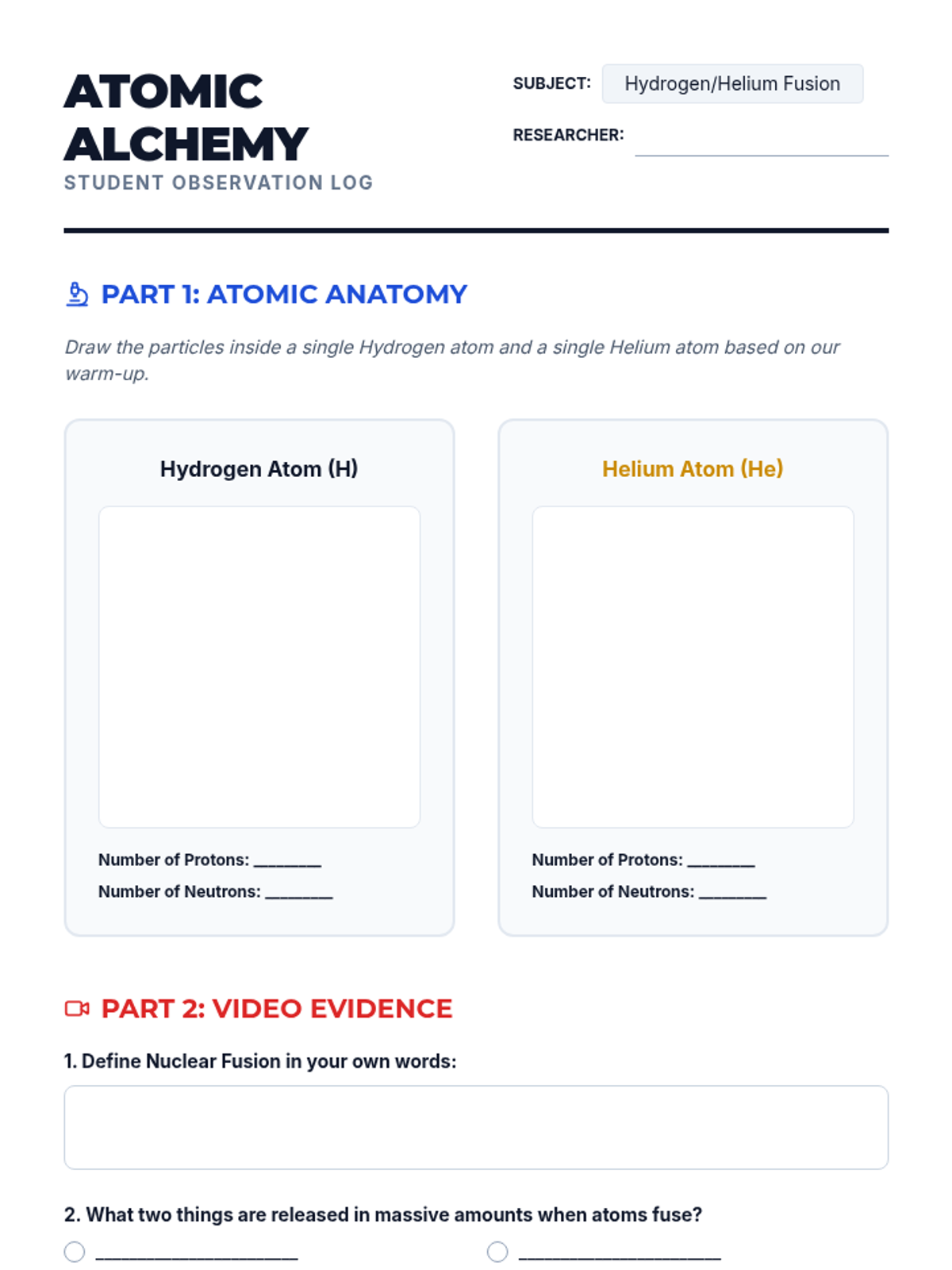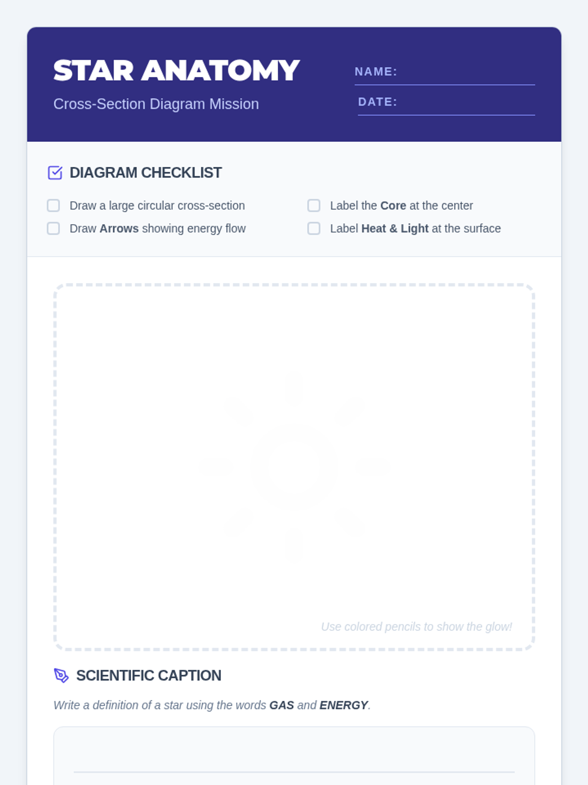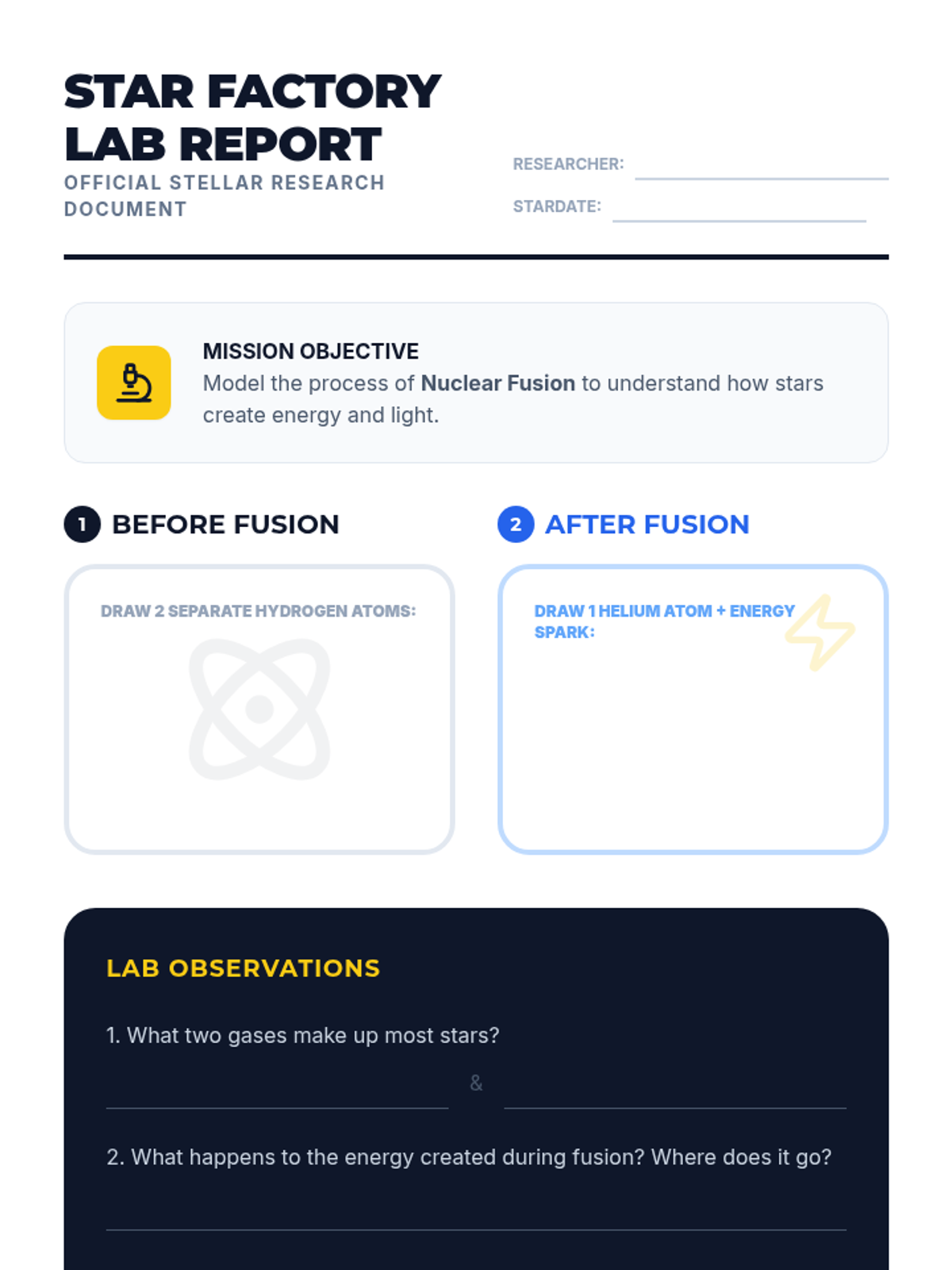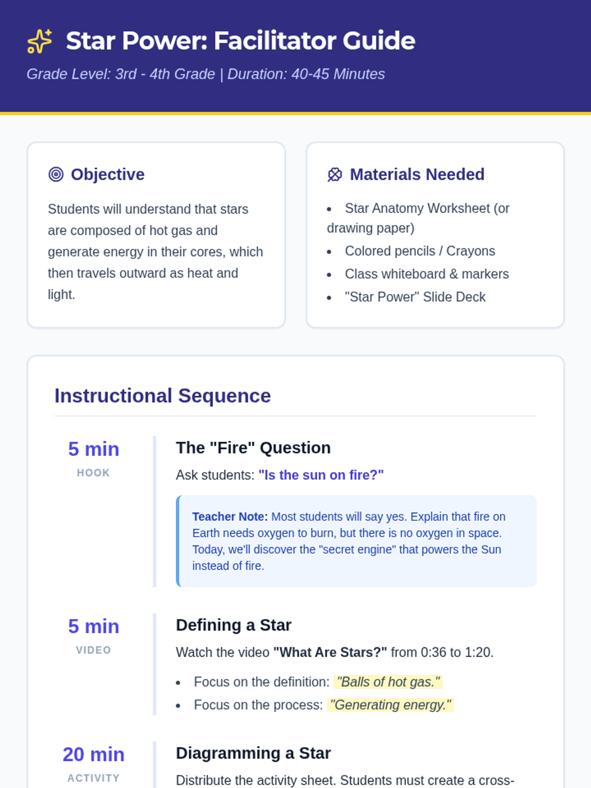 A lesson exploring what stars are made of and how they generate energy, featuring a hands-on diagramming activity and a deep dive into the Sun and other extreme stars.