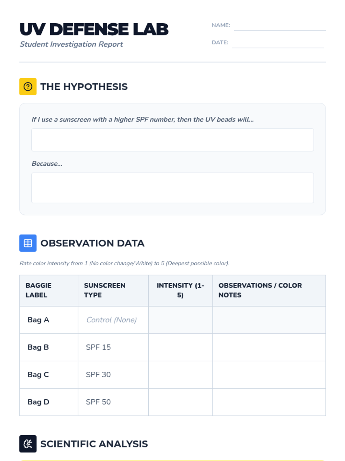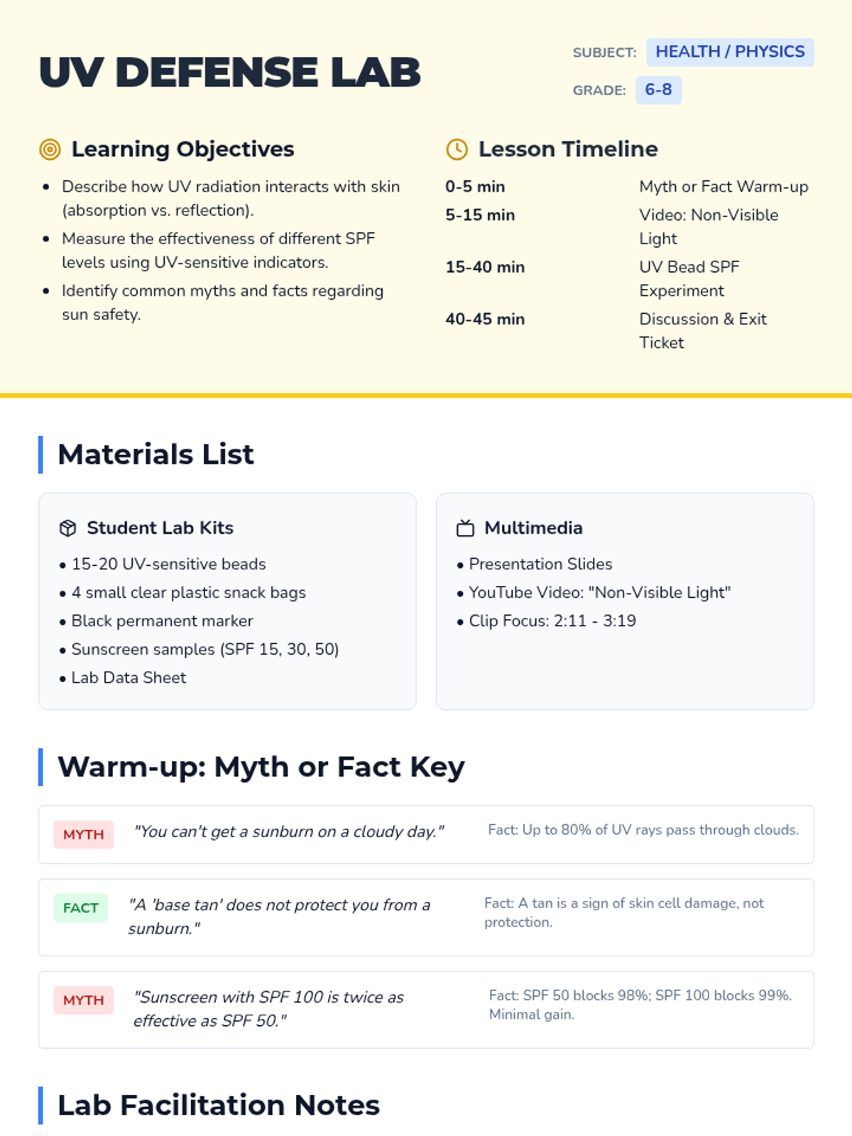 A middle school science and health lesson exploring the physics and biology of UV radiation and sunscreen effectiveness through hands-on experimentation with UV-sensitive beads.