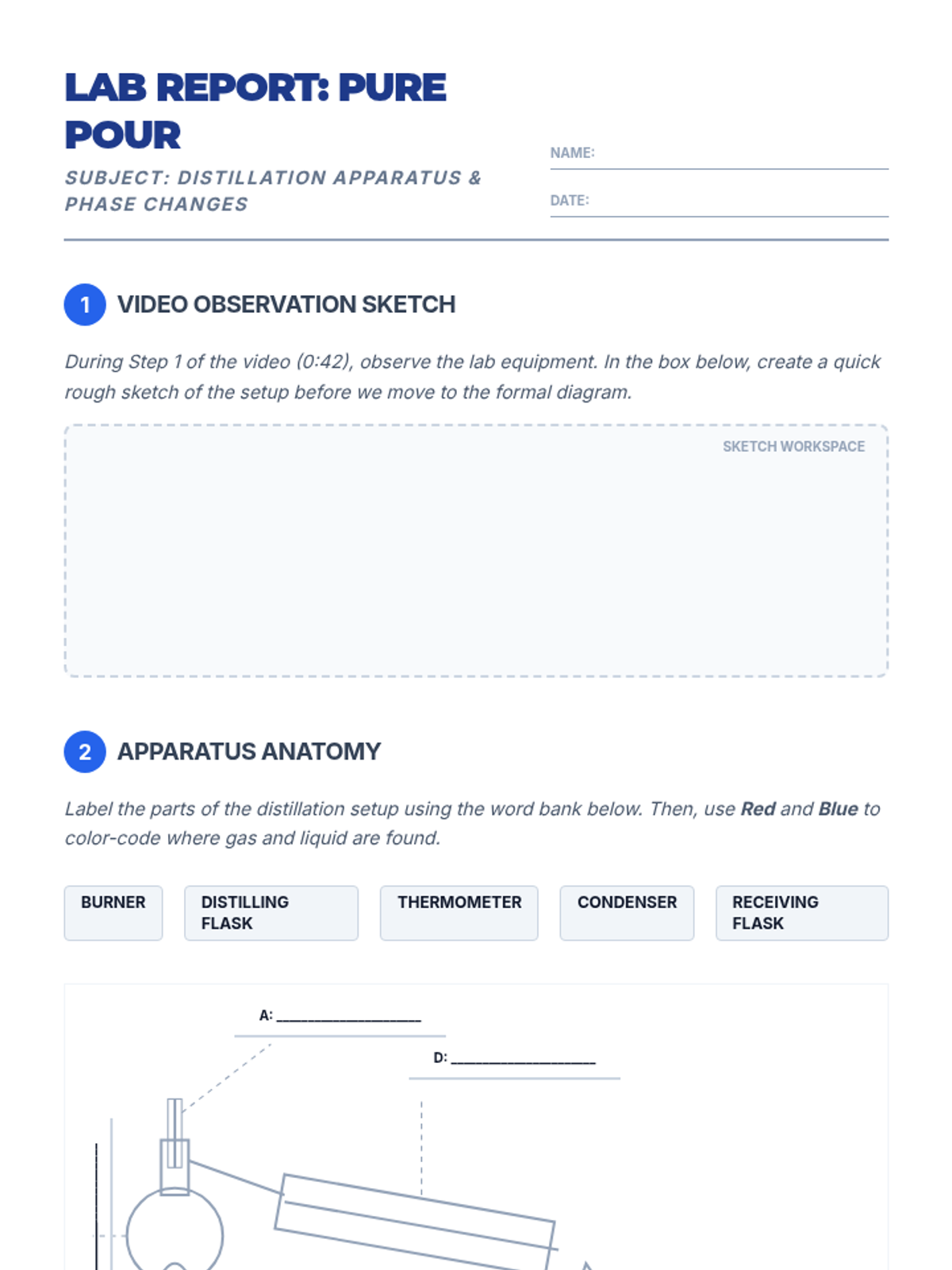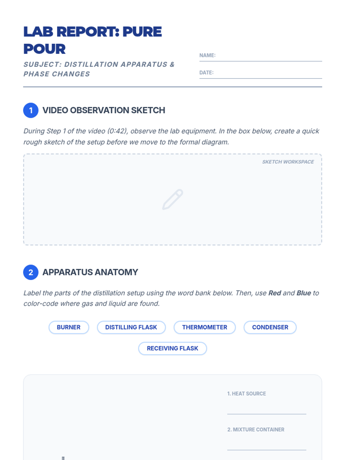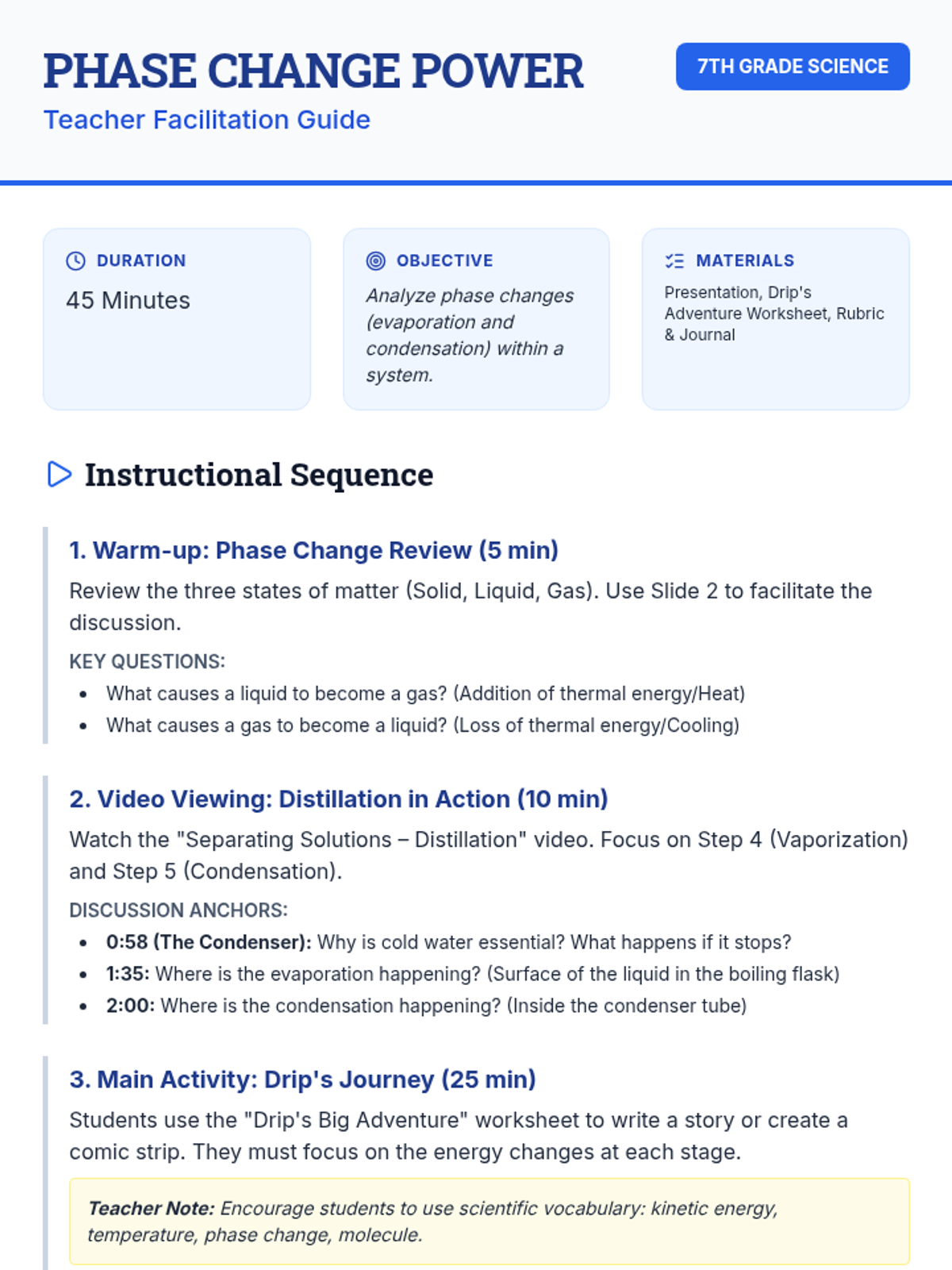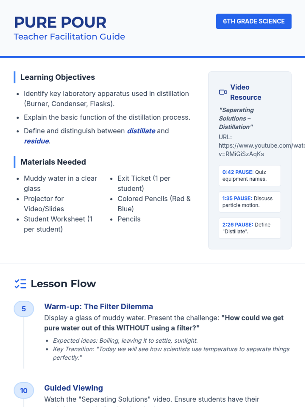 A comprehensive 6th-grade science lesson on distillation, covering laboratory apparatus, phase changes, and the separation of solutions using a specific instructional video.