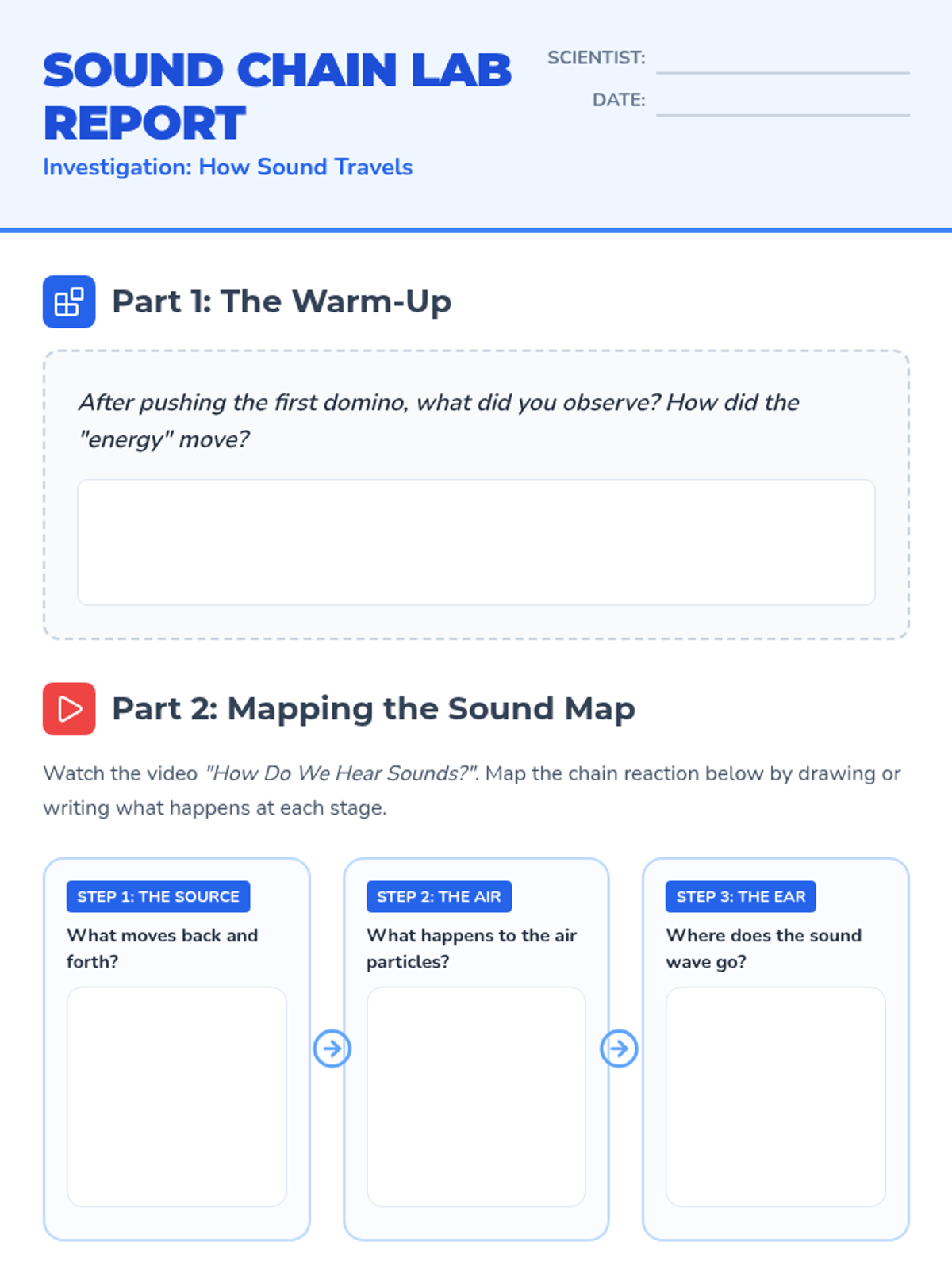 Students explore how sound travels from a source to the ear through a chain reaction of vibrations, using dominoes, video analysis, and a physical role-play activity.