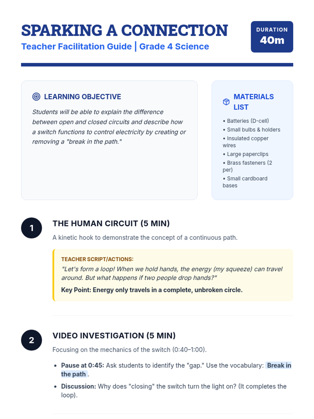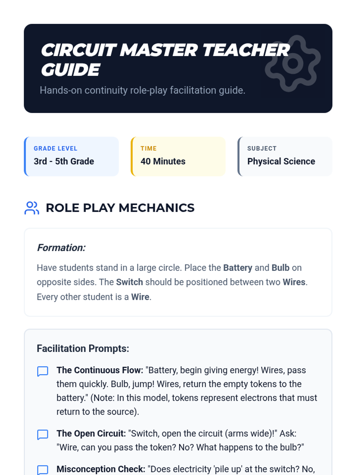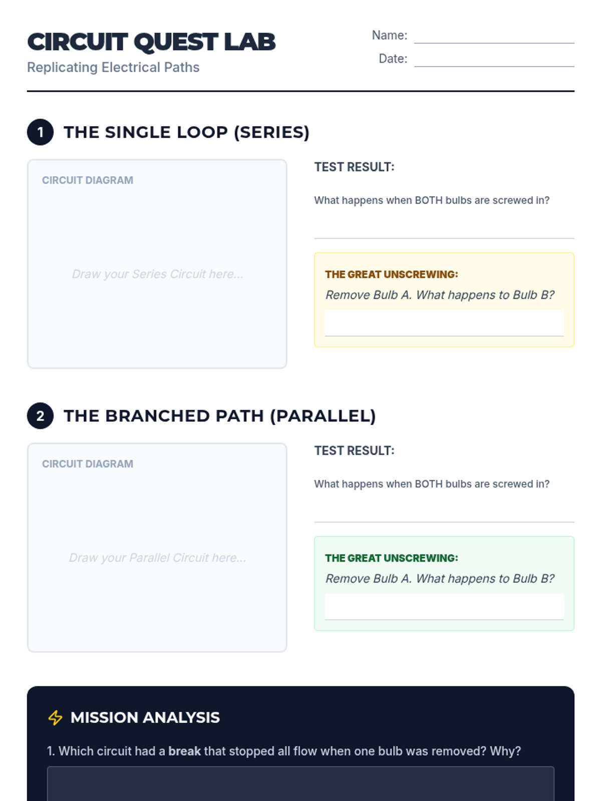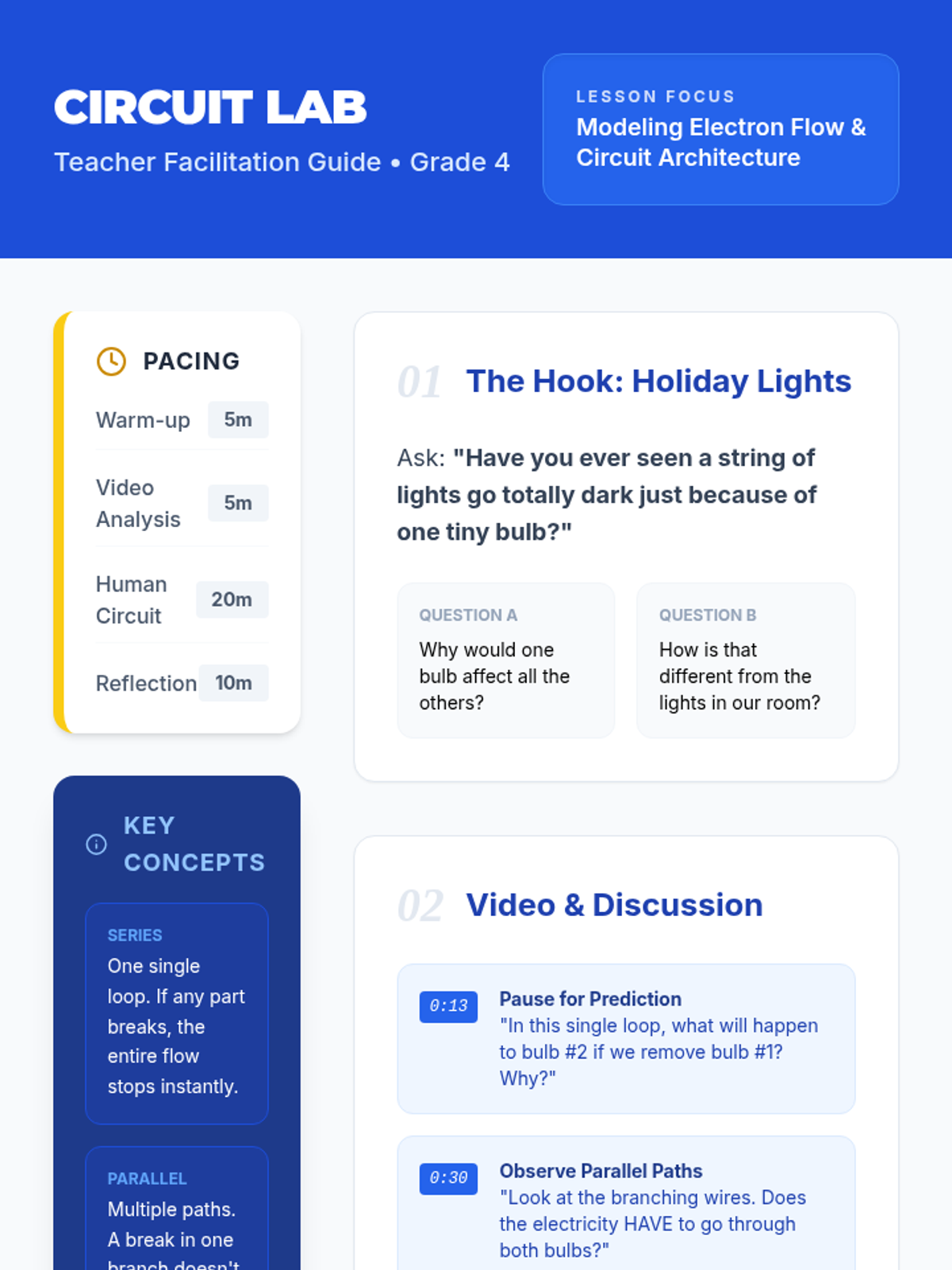 Students explore electron flow by modeling series and parallel circuits through a physical 'Human Circuit' activity and video analysis, focusing on how breaks affect current.