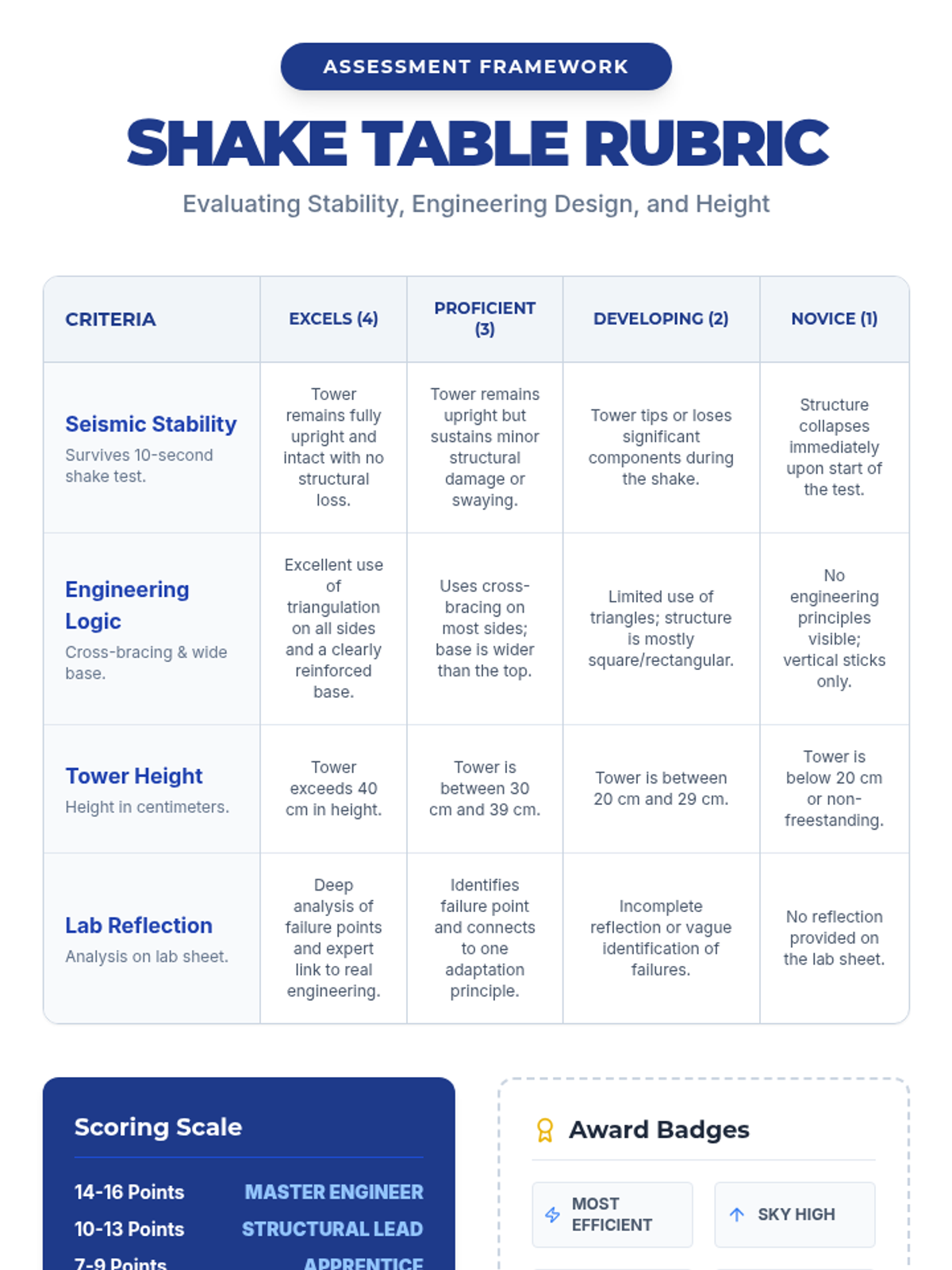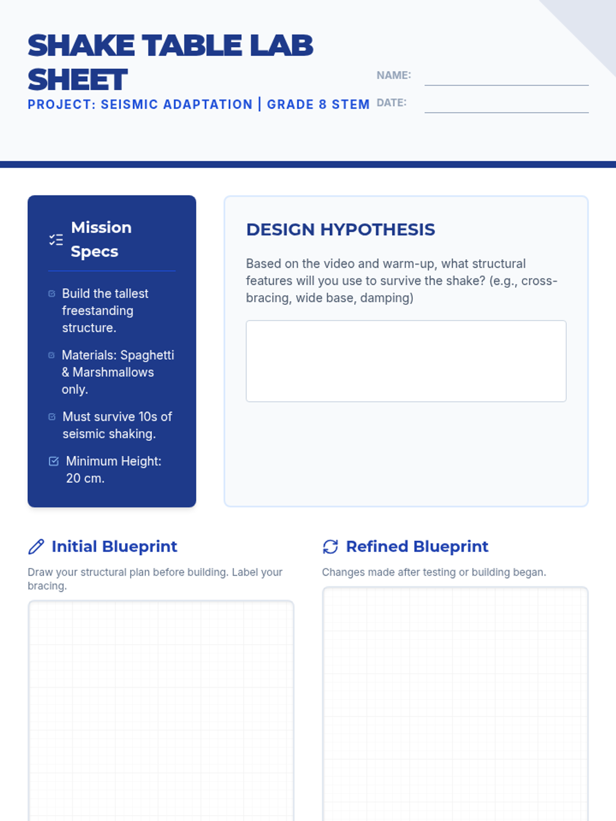 Students explore structural engineering by designing and testing earthquake-resistant towers using spaghetti and marshmallows, applying concepts of seismic adaptation.