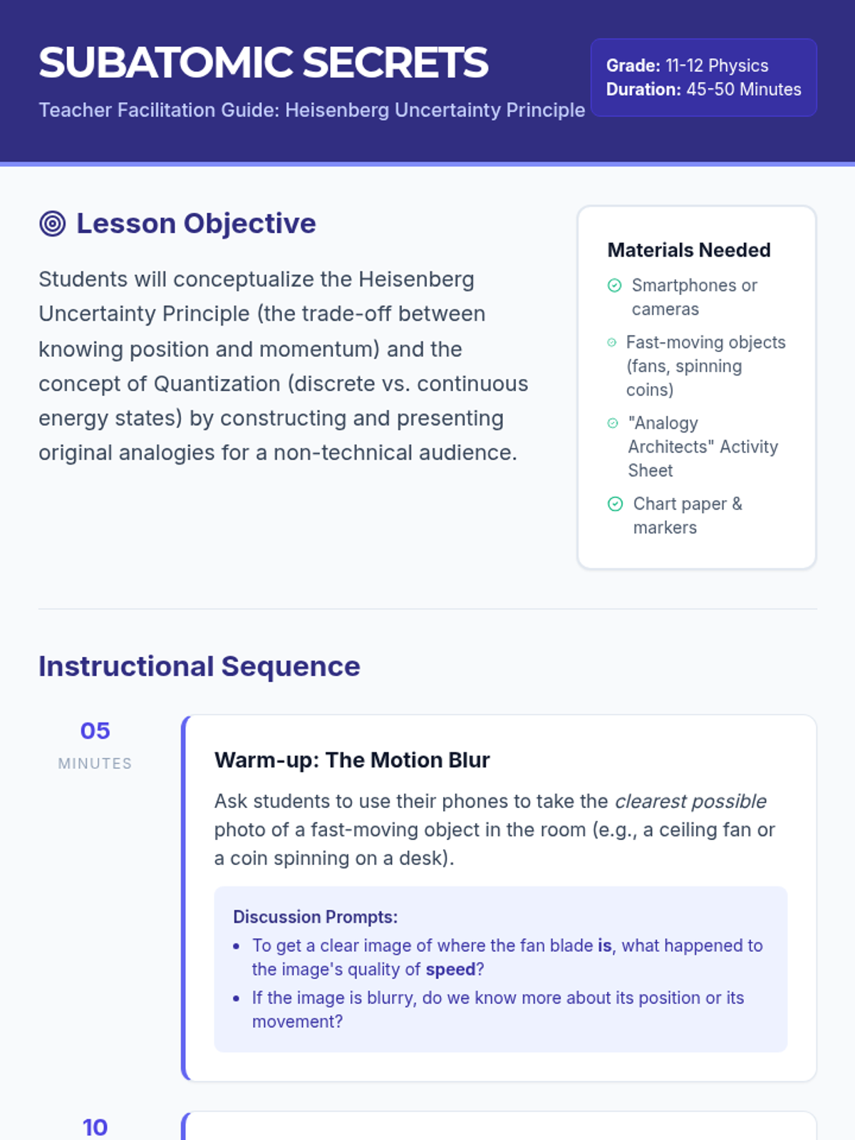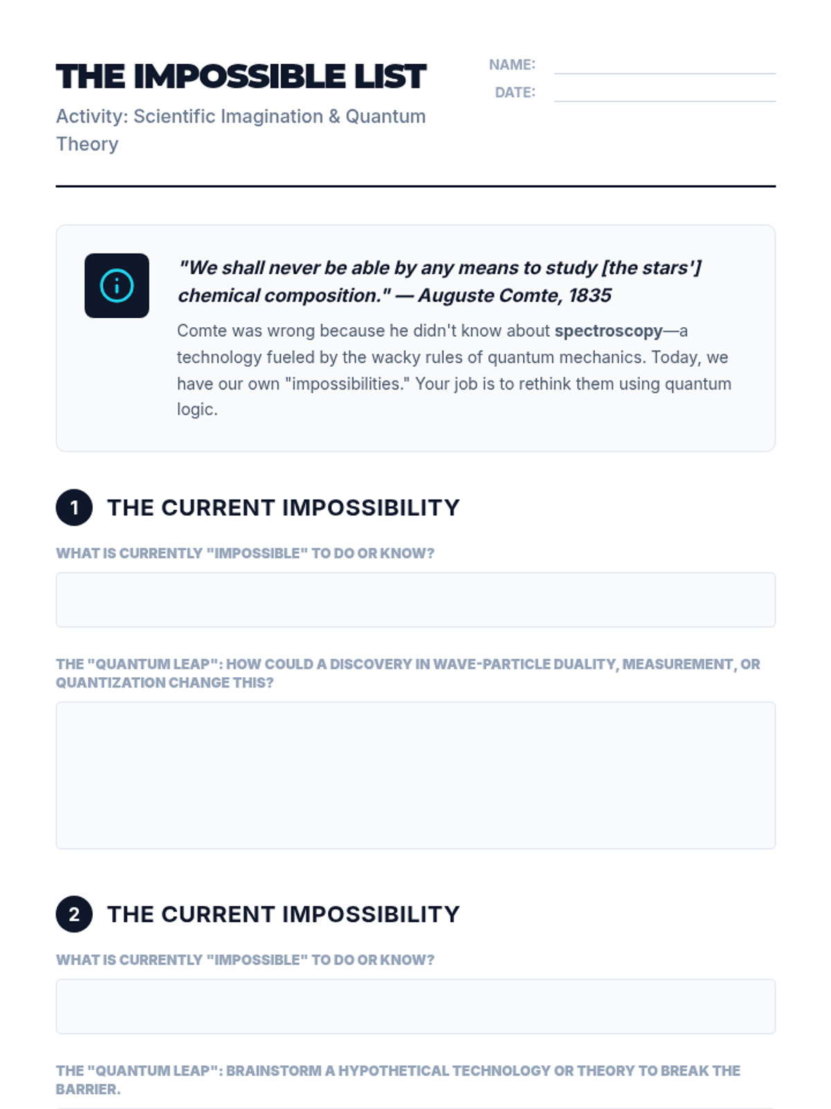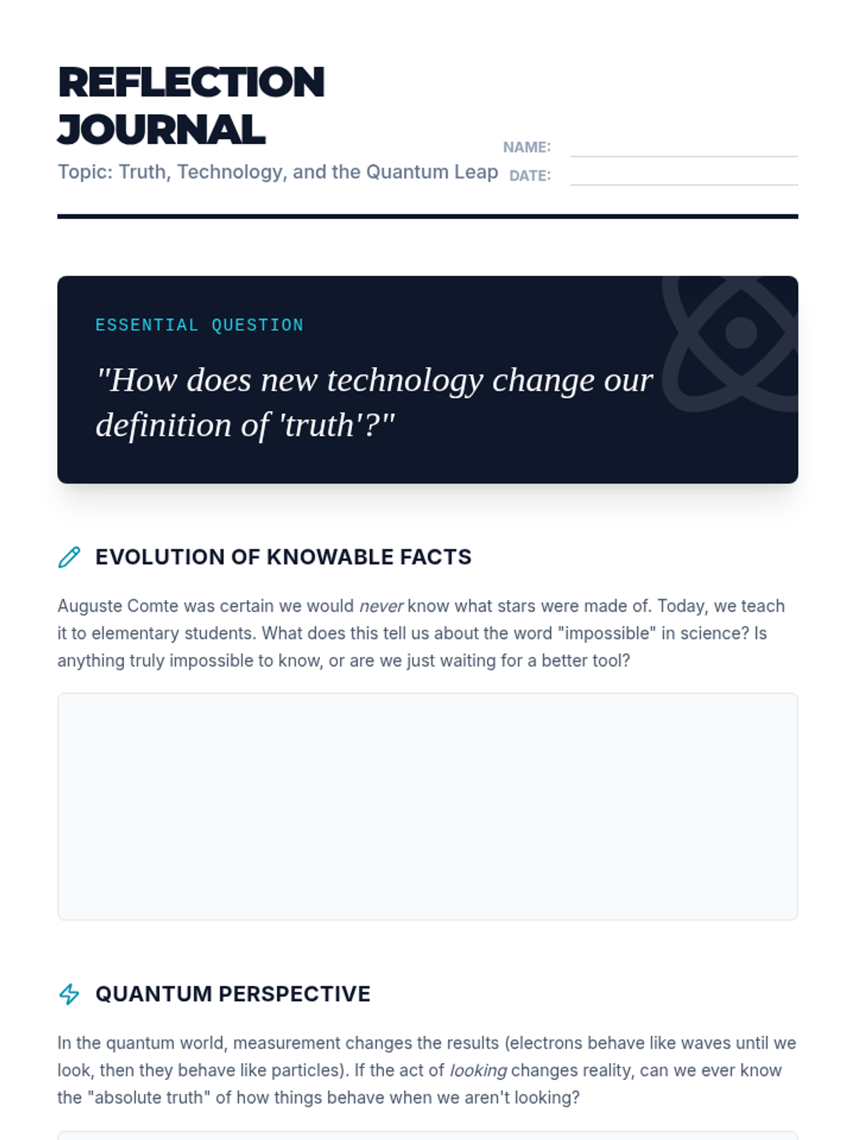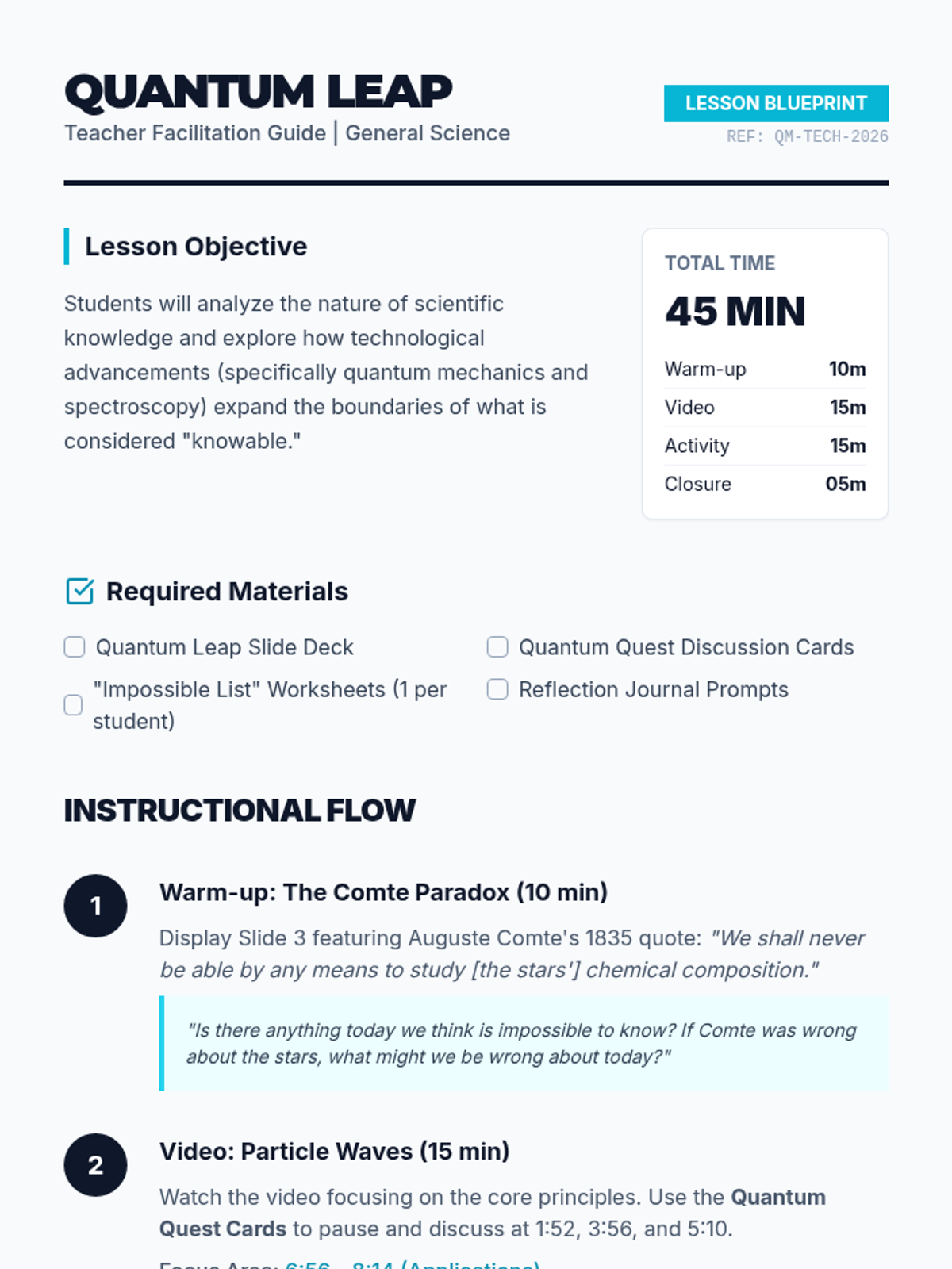 This lesson explores how quantum mechanics revolutionized our understanding of reality, focusing on the shift from 'impossible to know' to 'scientific truth' through technology. Students engage with the history of spectroscopy, the principles of the quantum world, and brainstorm future technological breakthroughs.