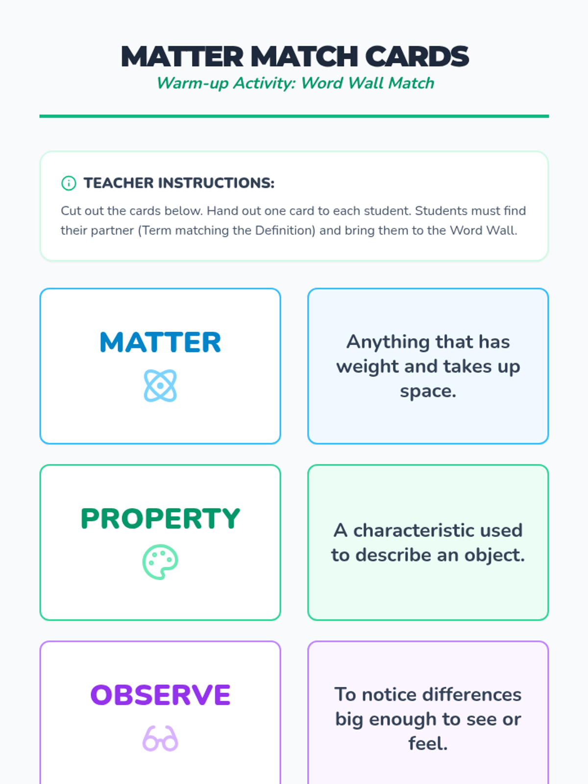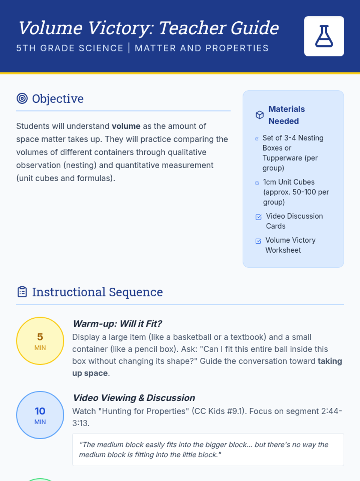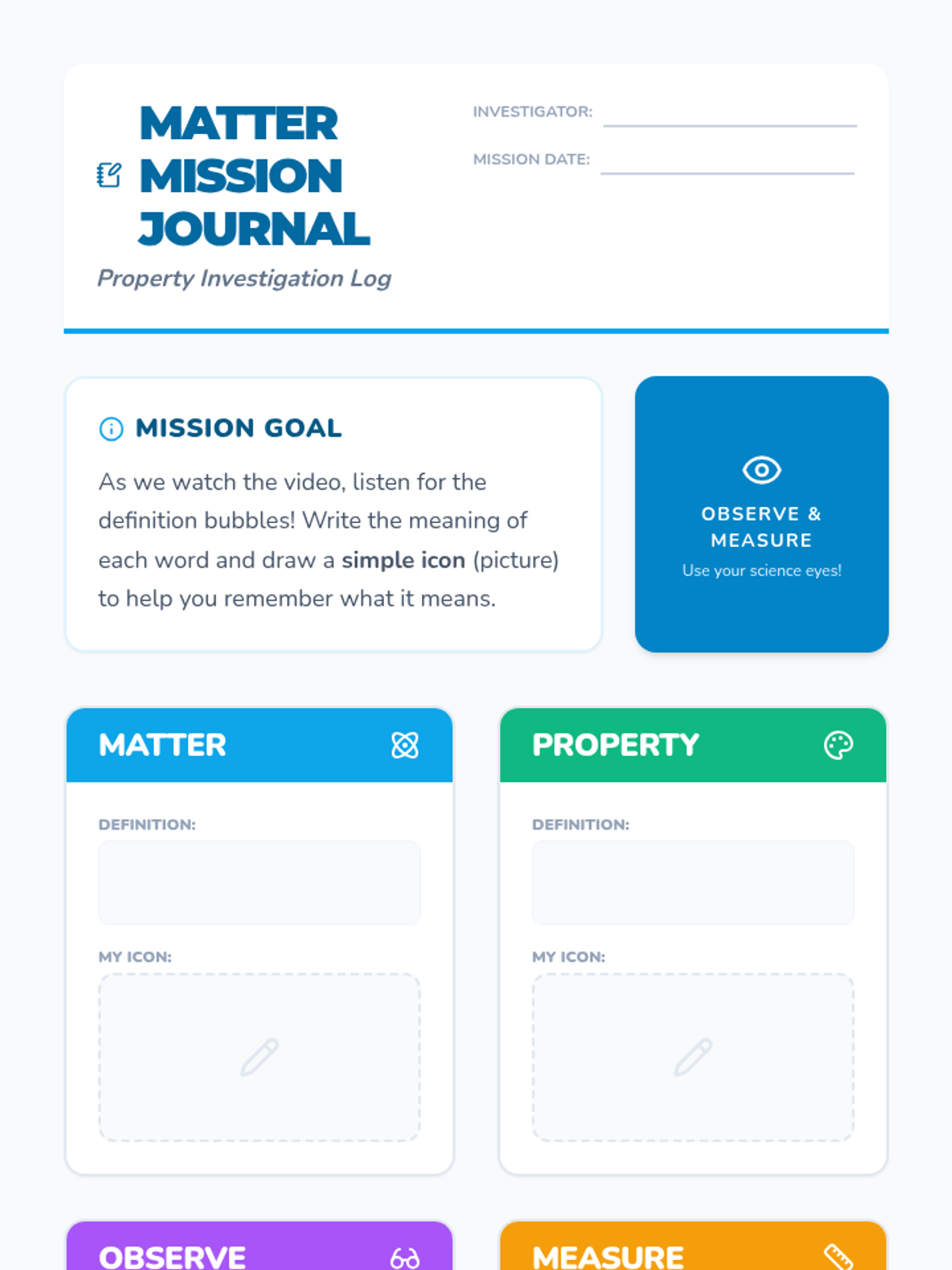 Students will explore the physical properties of matter through observation, measurement, and hands-on labeling, supported by the 'Hunting for Properties' Crash Course Kids video. This lesson is specifically designed with language supports for 3rd-5th grade learners, featuring visual definitions and interactive vocabulary games.