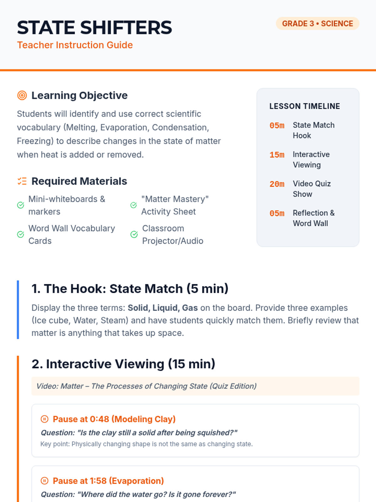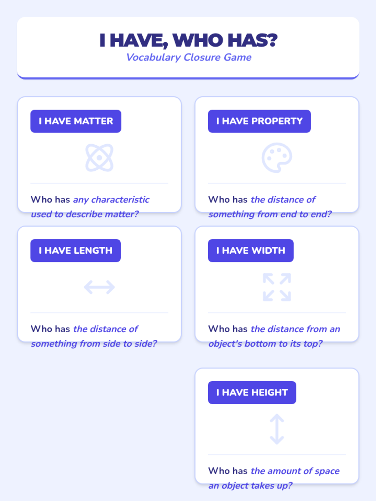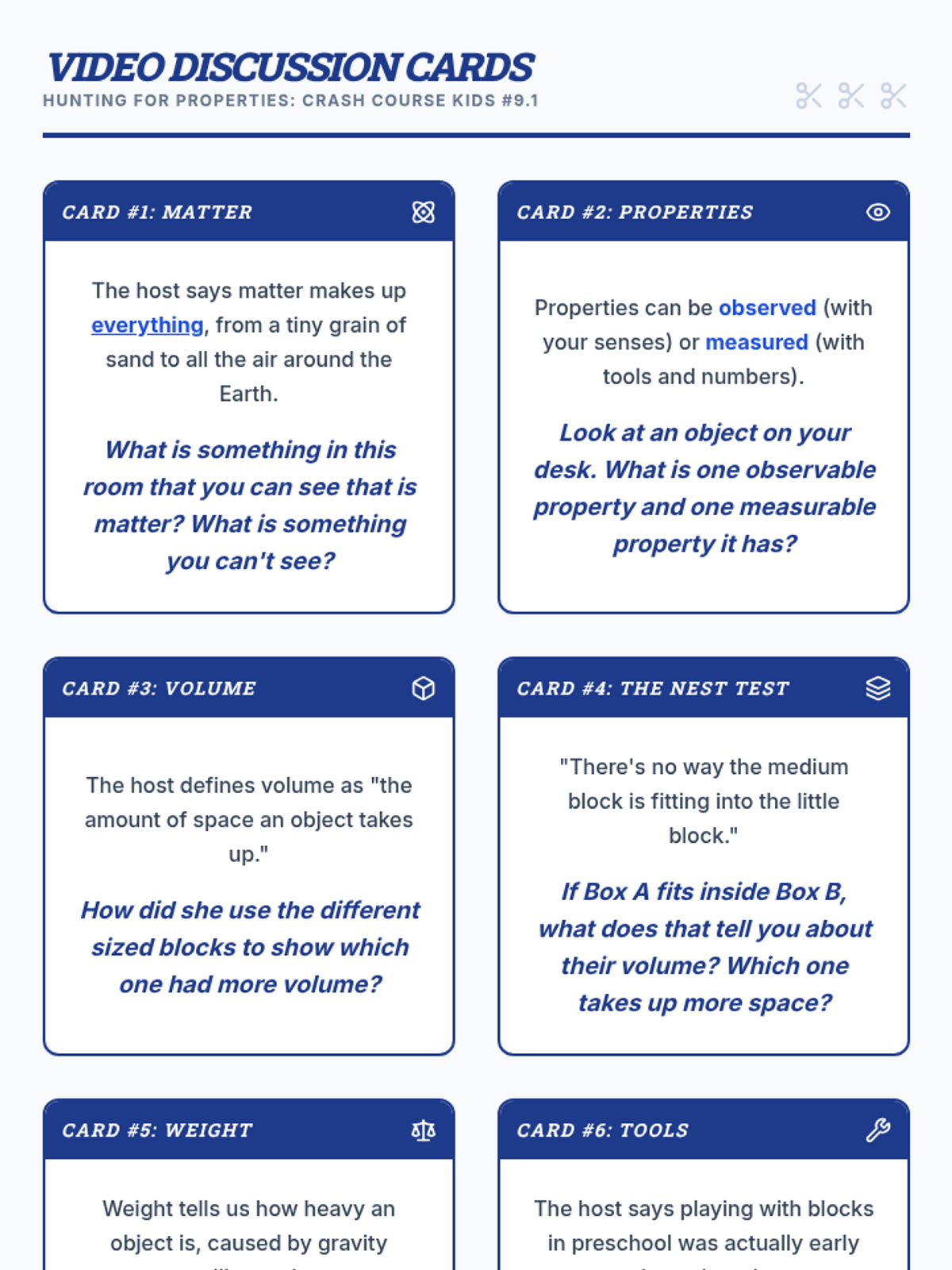 Students will explore the physical properties of matter through observation, measurement, and hands-on labeling, supported by the 'Hunting for Properties' Crash Course Kids video. This lesson is specifically designed with language supports for 3rd-5th grade learners, featuring visual definitions and interactive vocabulary games.