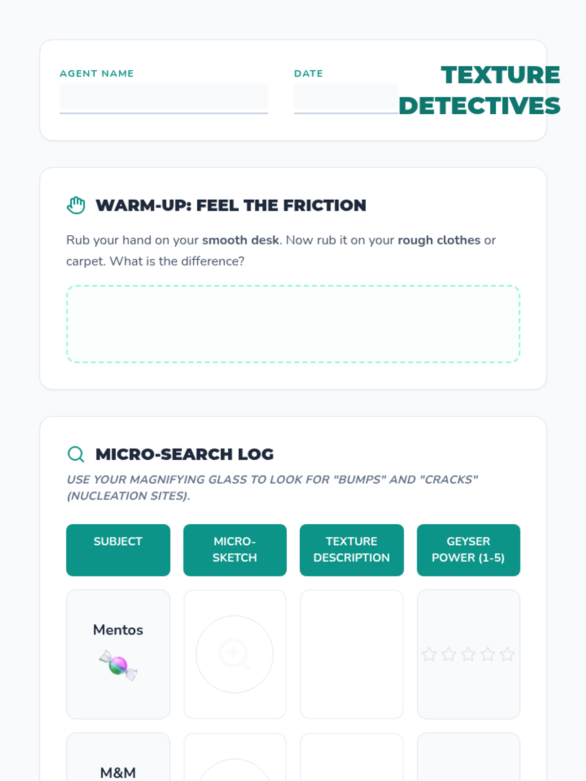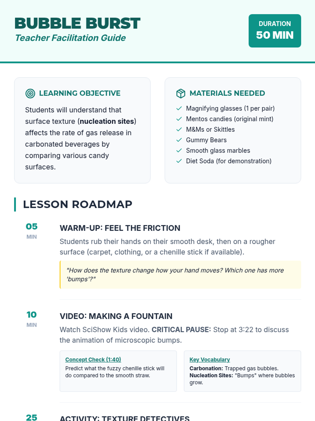 A hands-on science lesson for 3rd and 4th graders exploring how surface texture (nucleation sites) triggers the rapid release of carbon dioxide gas in soda, featuring a SciShow Kids video and a candy investigation activity.