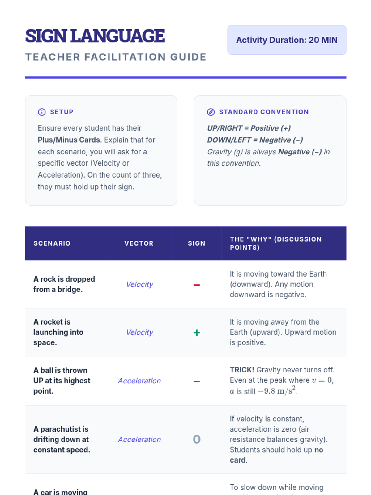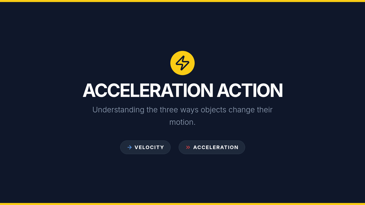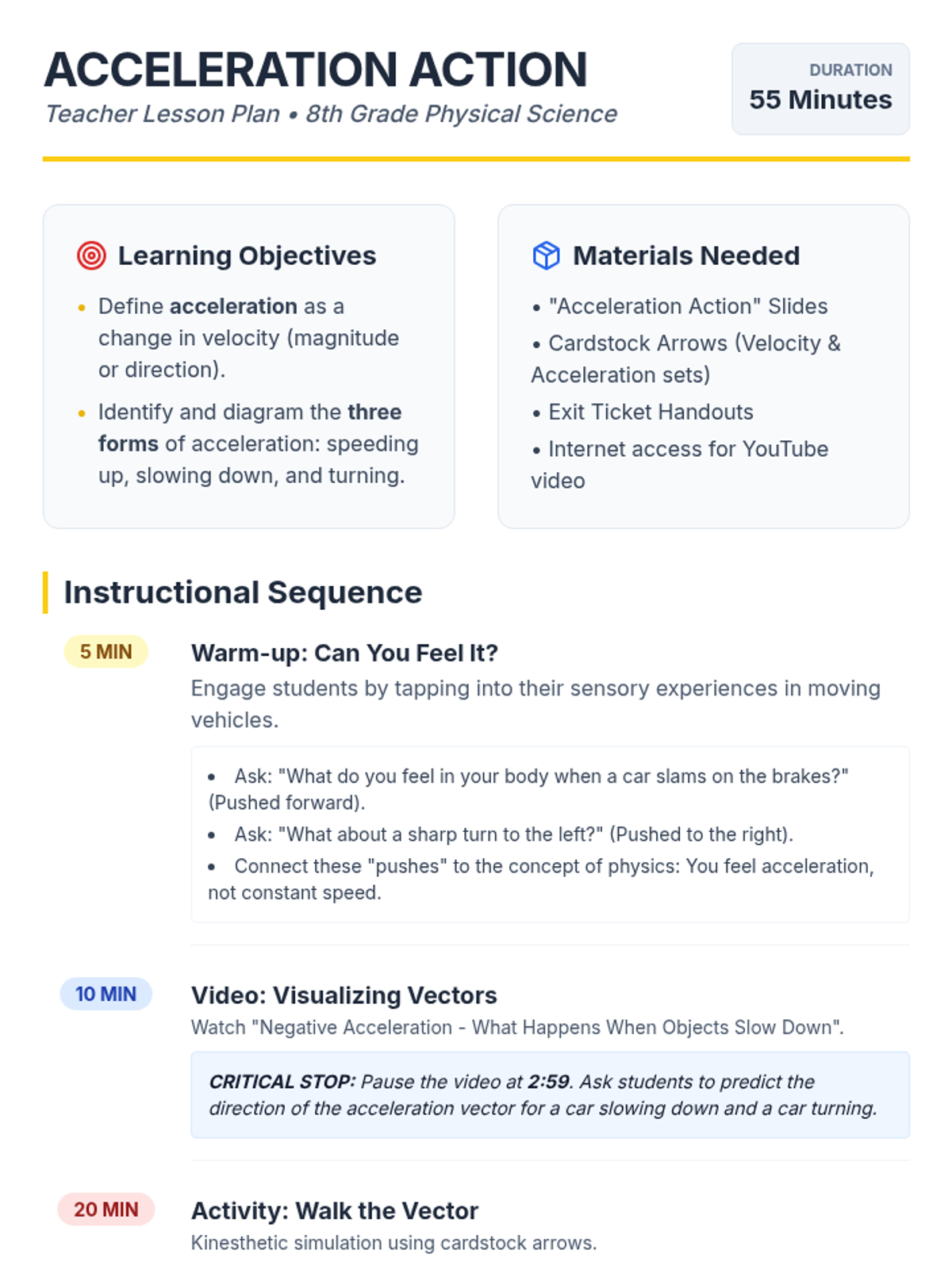 A high-energy 8th-grade science lesson focused on acceleration as a vector quantity, featuring a physical simulation activity and video analysis of negative acceleration.